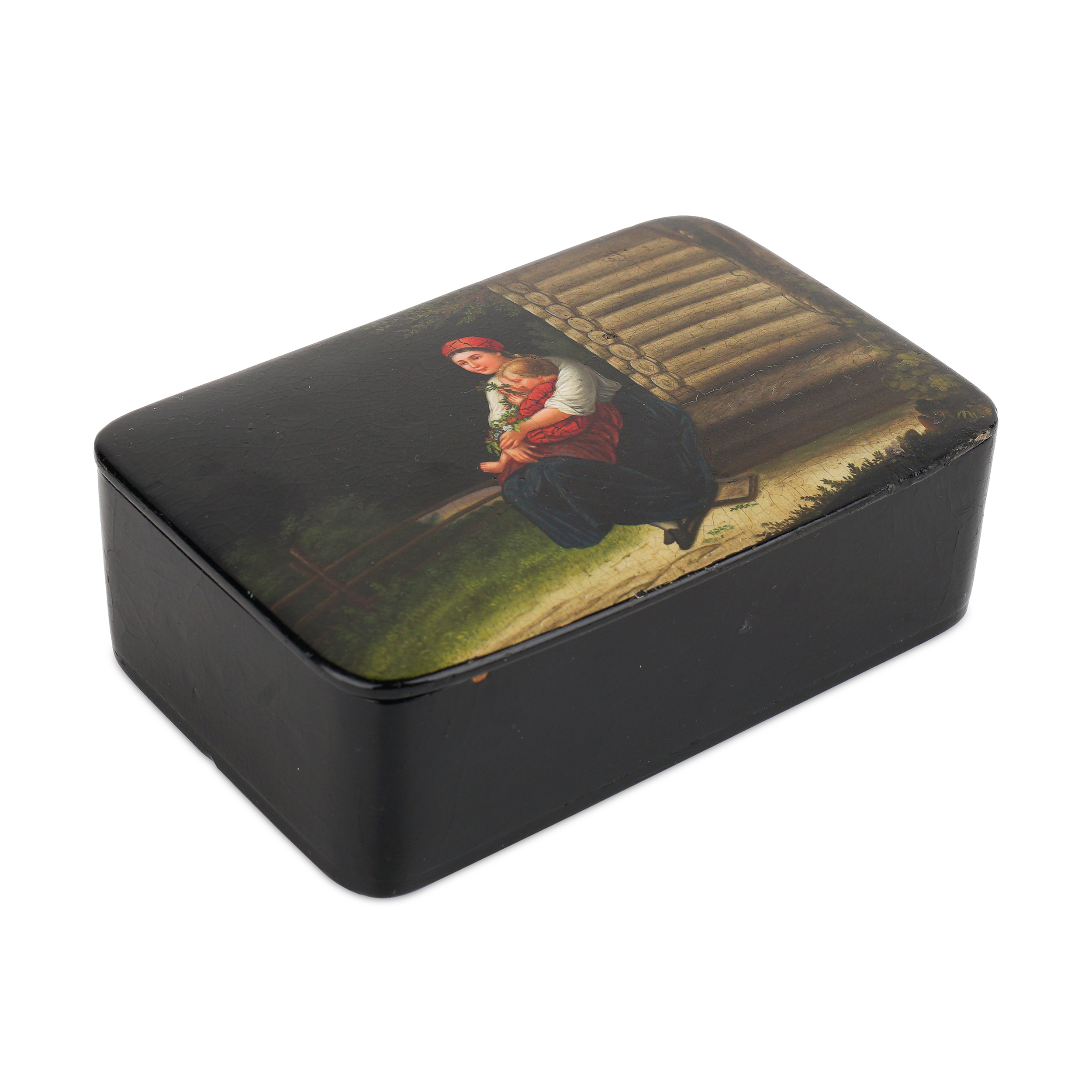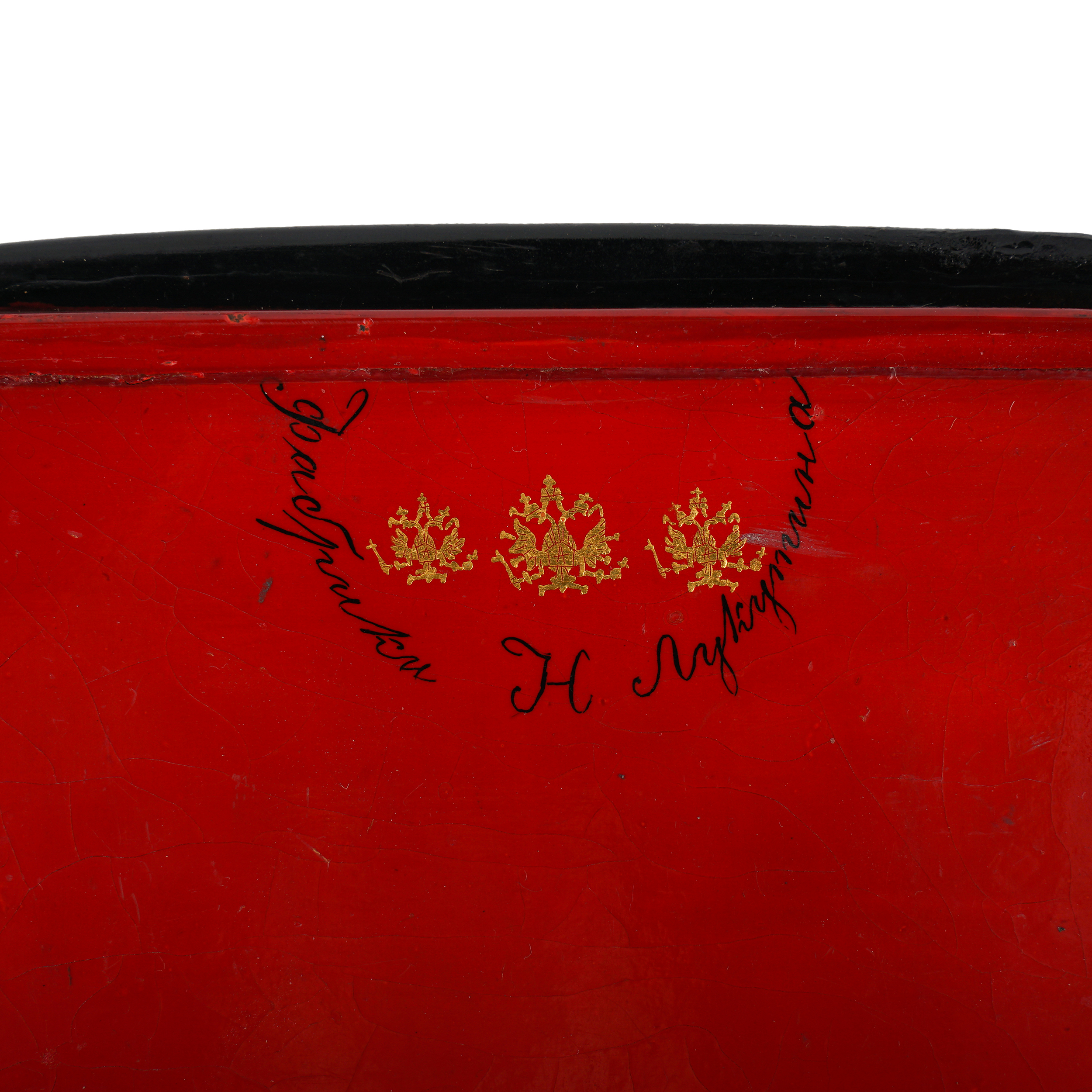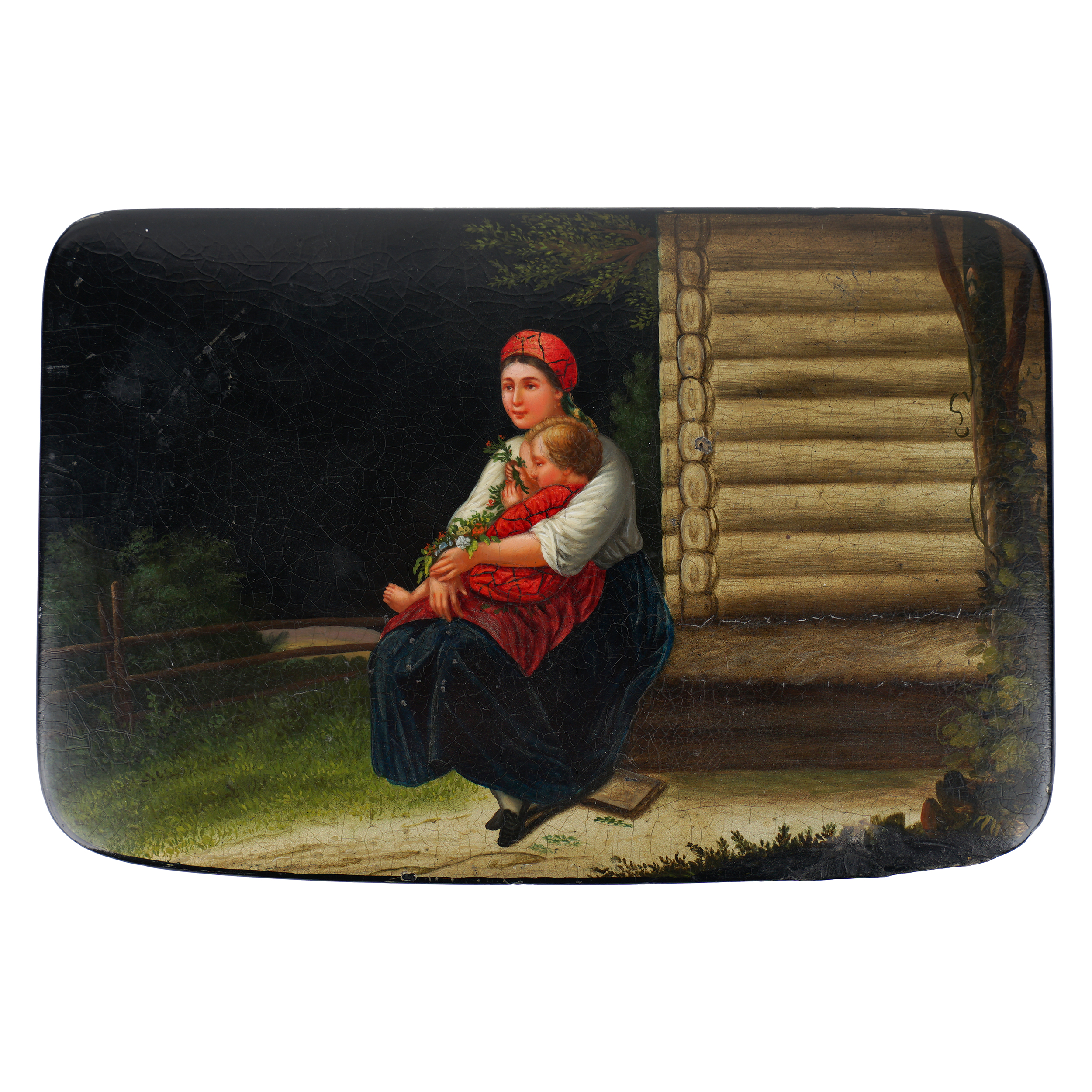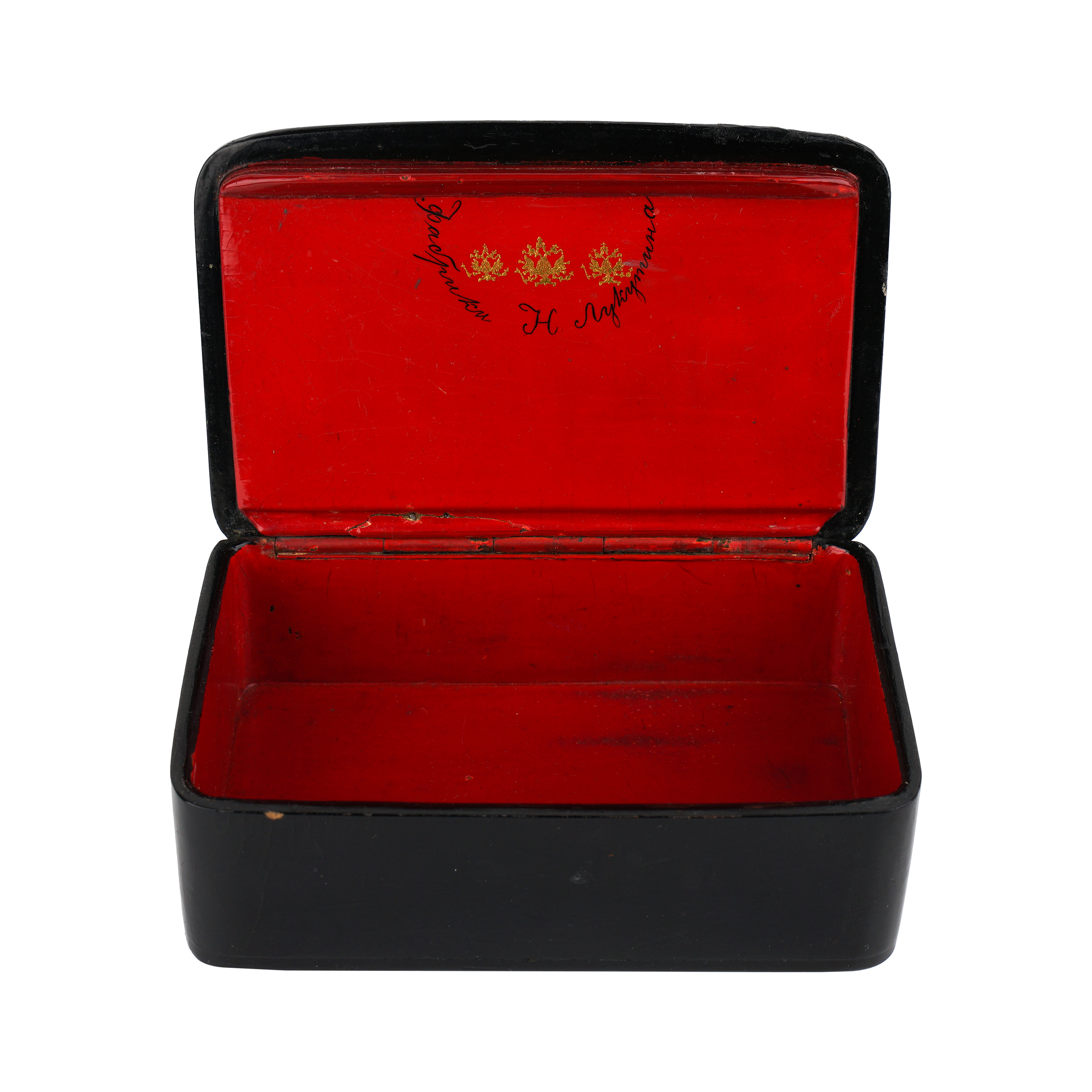 Папье-маше, лак, роспись, разделка золотом, на крышке изнутри стоит клеймо «Фабрики Лукутина. Москва» под двуглавым орлом, фабрика Придворного Поставщика Н.А. Лукутина, Российская Империя, 1830-е годы. Размеры: 13х8,5х4 см