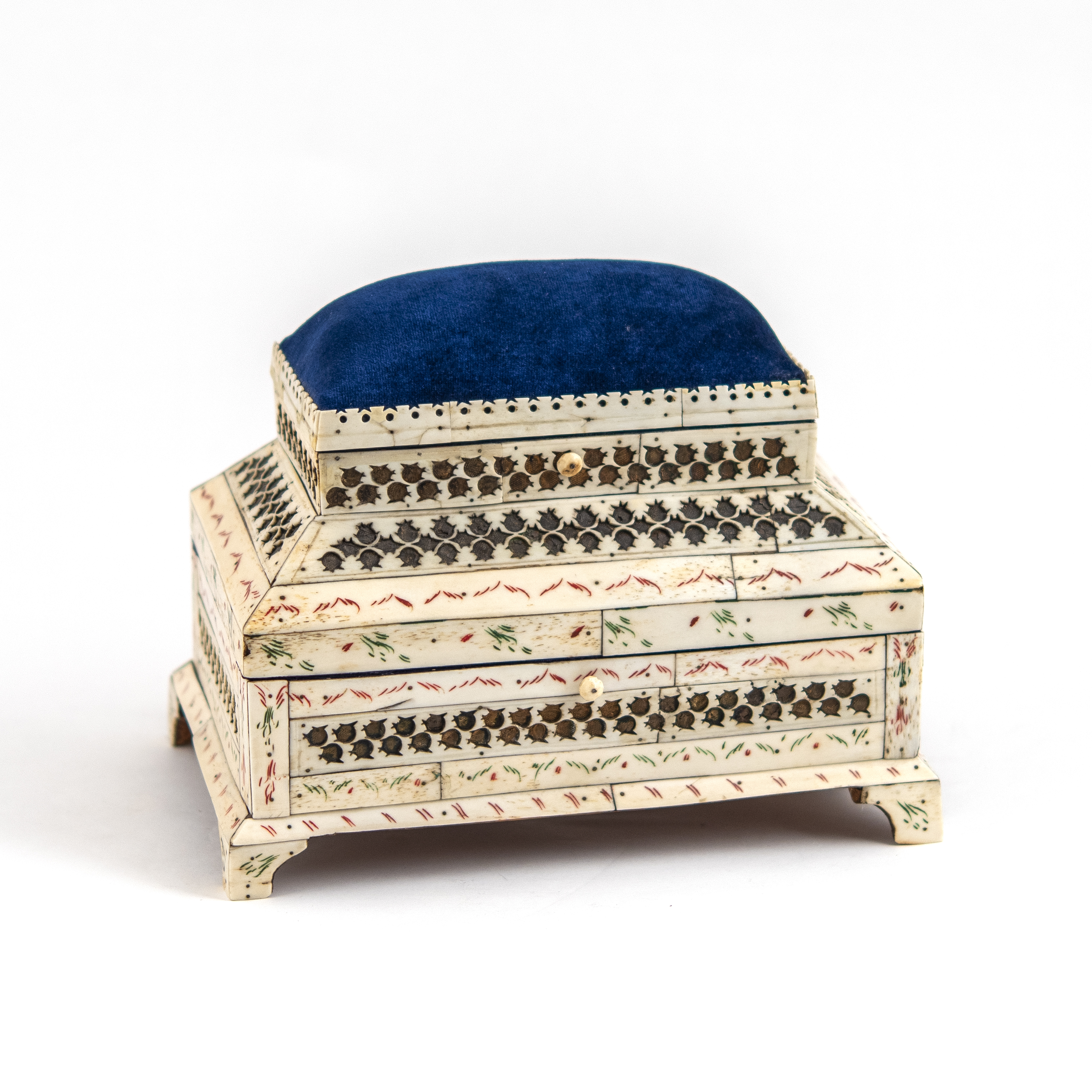 Шкатулка-швейка, украшенная тремя поясами орнаментальной резьбы в виде ягод, с подушечкой-игольницей синего бархата.