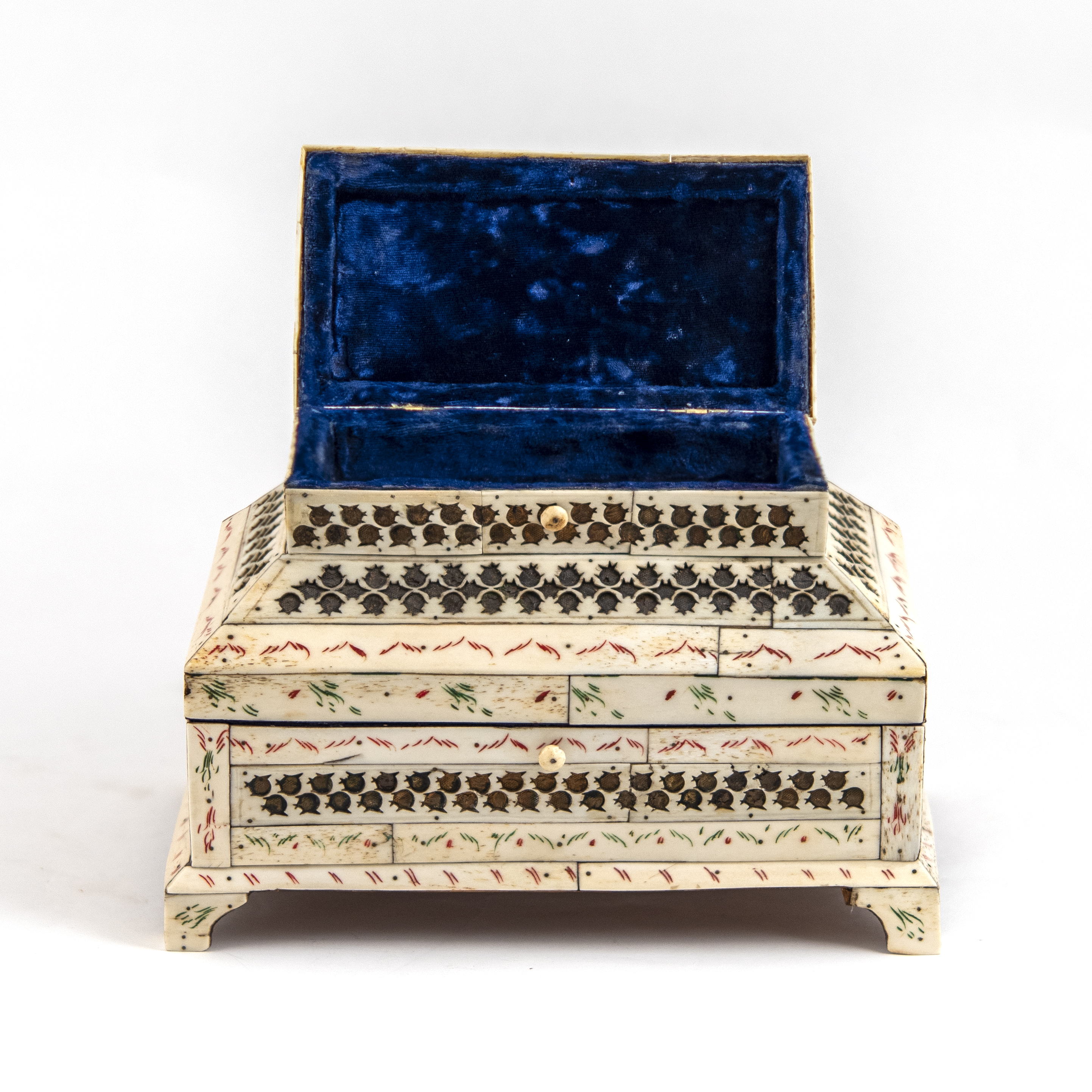 Дерево, моржовая кость, инкрустация костяными пластинами, сквозная орнаментальная резьба, полихромная роспись по кости, размер (в/ш/г): 17,5 х 22,6 х 14,5 см.