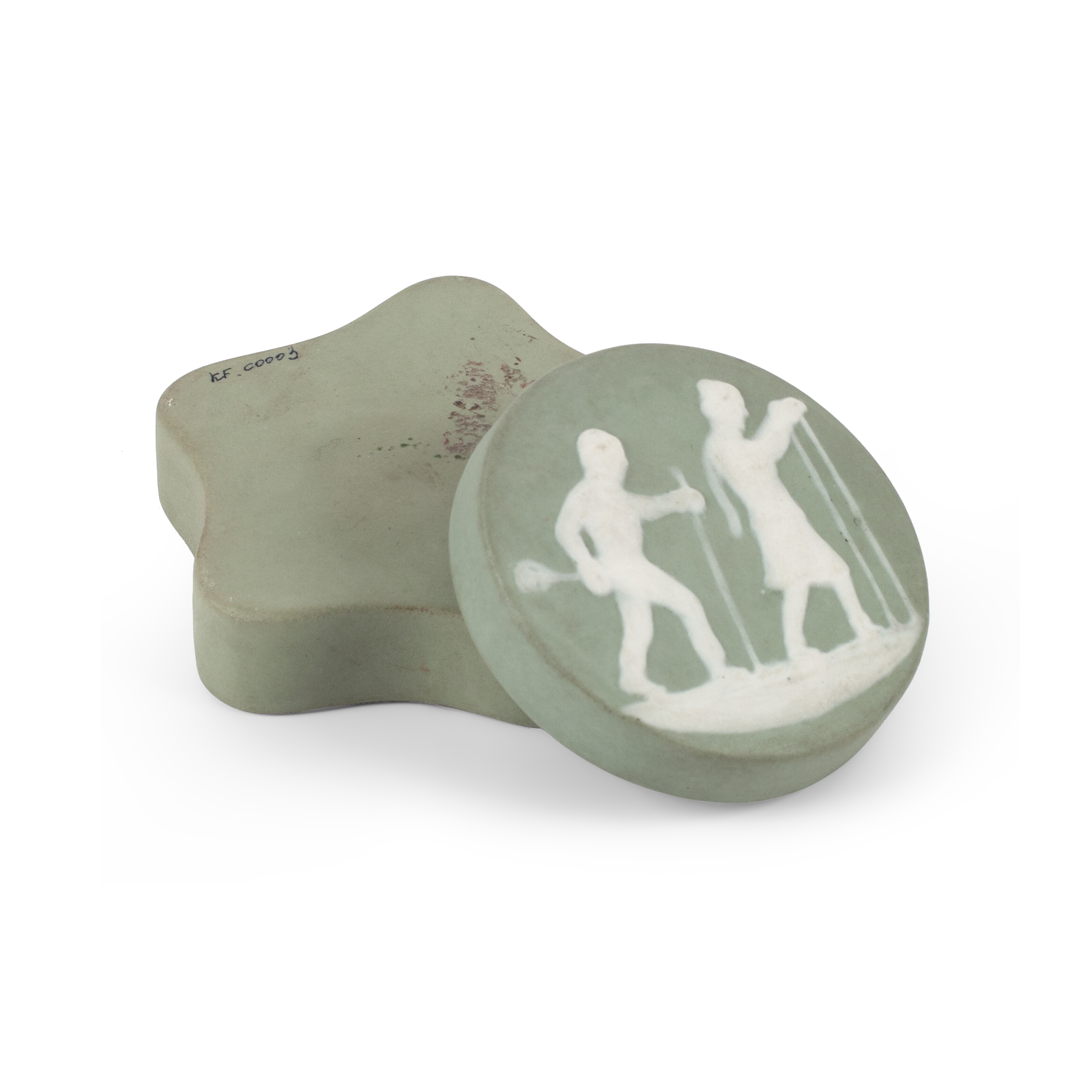 Агитационная шкатулка в форме пятиугольной звезды с изображением двух фигур, идущих на лыжах по снегу. Выполнена из гладкого зеленого (тонированного) бисквита с рельефным лепным декором из белого бисквита, в технике характерной для изделий завода в Вербилках.