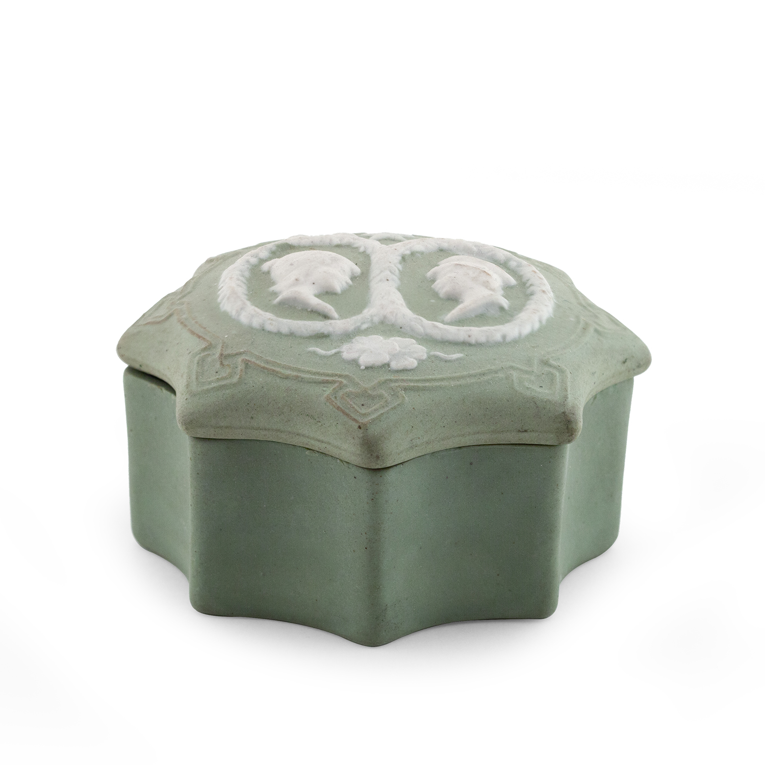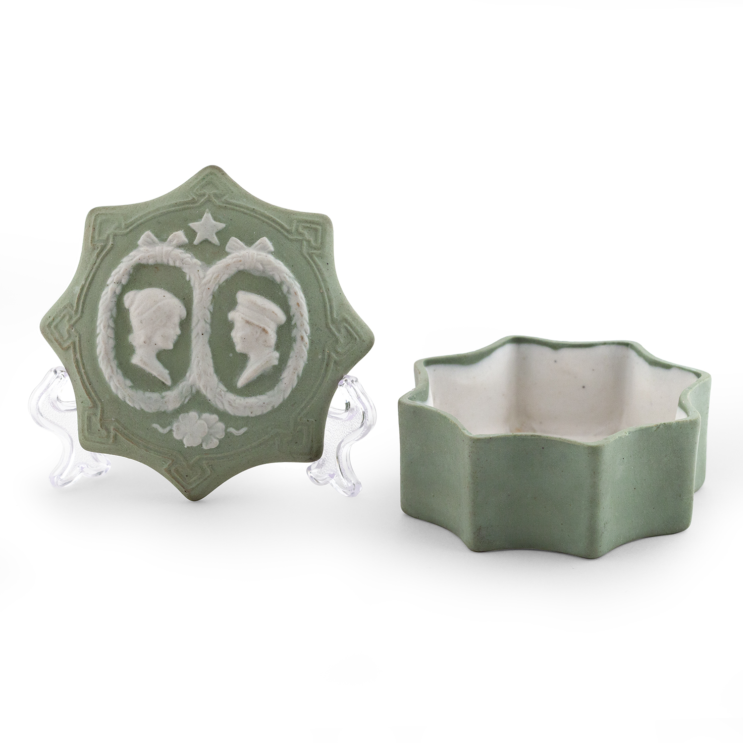 Агитационный фарфор. Белый и зеленый бисквит, рельеф, клеймо отсутствует, цифры «1344» в тесте, Дмитровская фарфоровая фабрика, ДФЗ (Вербилки), бывший завод Гарднера,1930 - 1950-е годы, размеры: диаметр – 8,6 см, высота – 4,5 см
