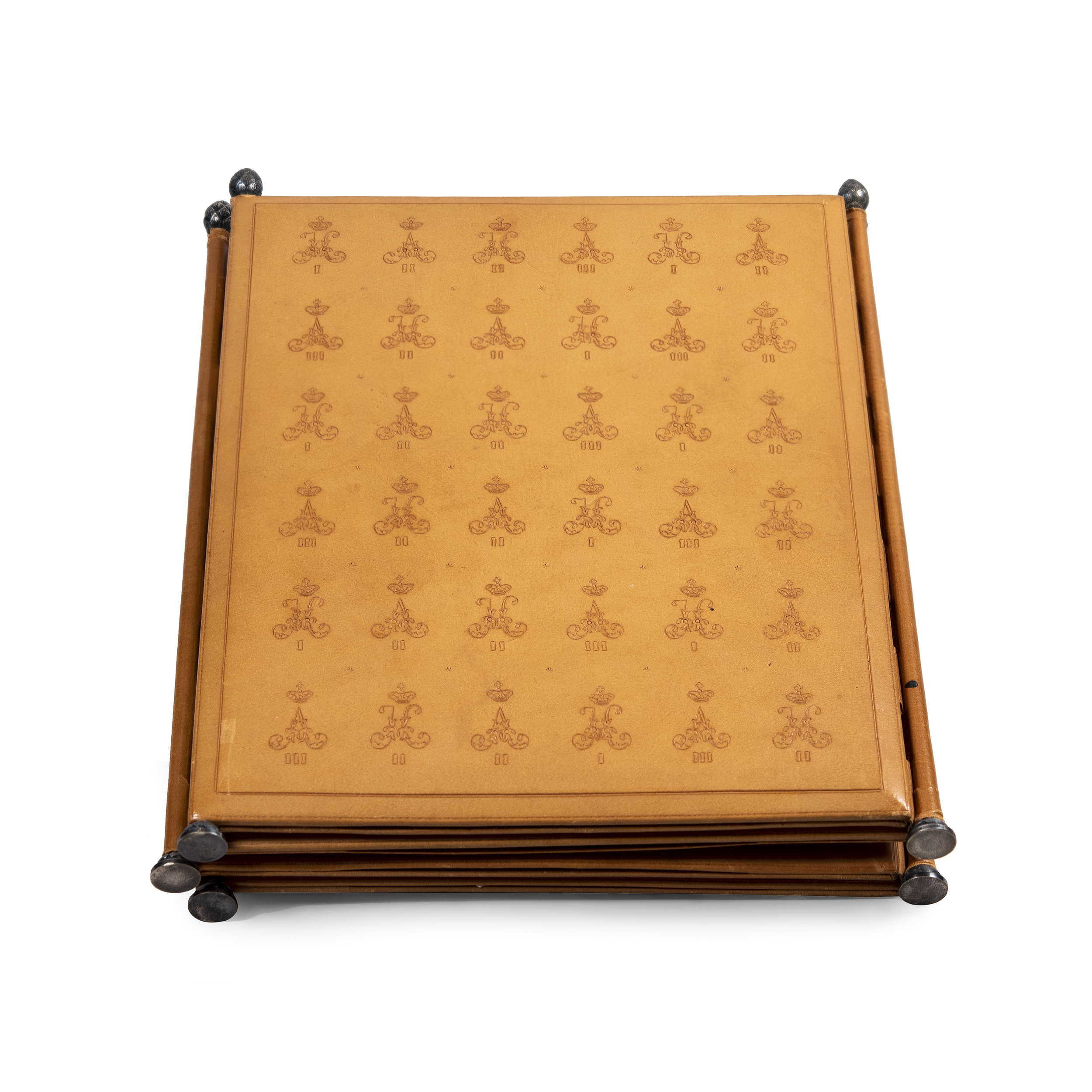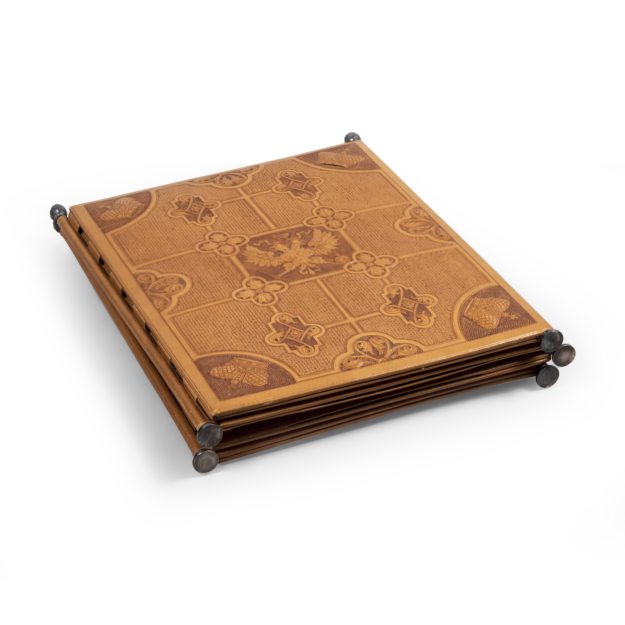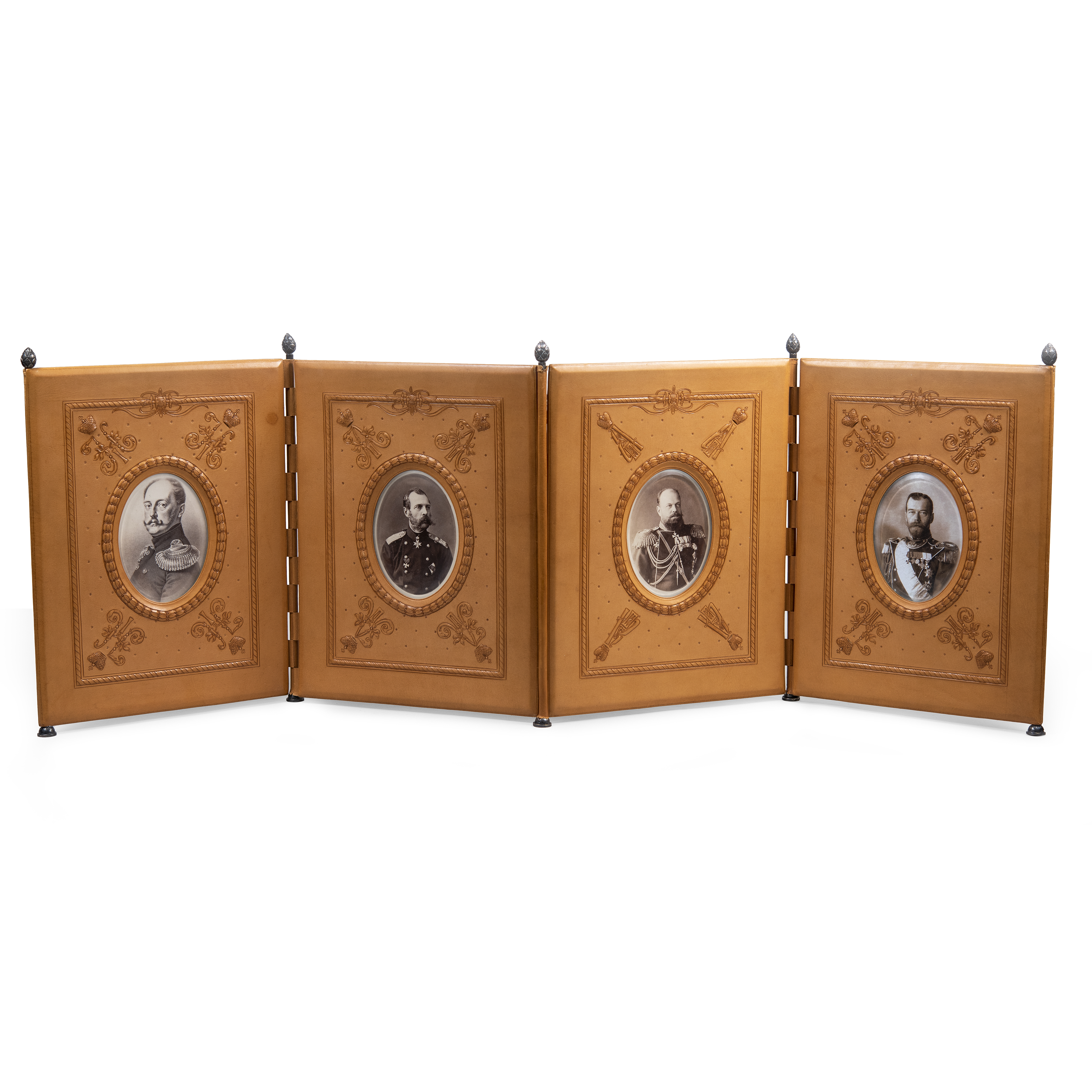 Рамка-складень четырехчастная с монограммой под императорской короной. Портрет Императора Николай I, портрет Императора Александр II, портрет Императора Александр III, портрет Императора Николая II. Кожа, теснение, металл, монтировка, размеры: 34х24 (96) см.