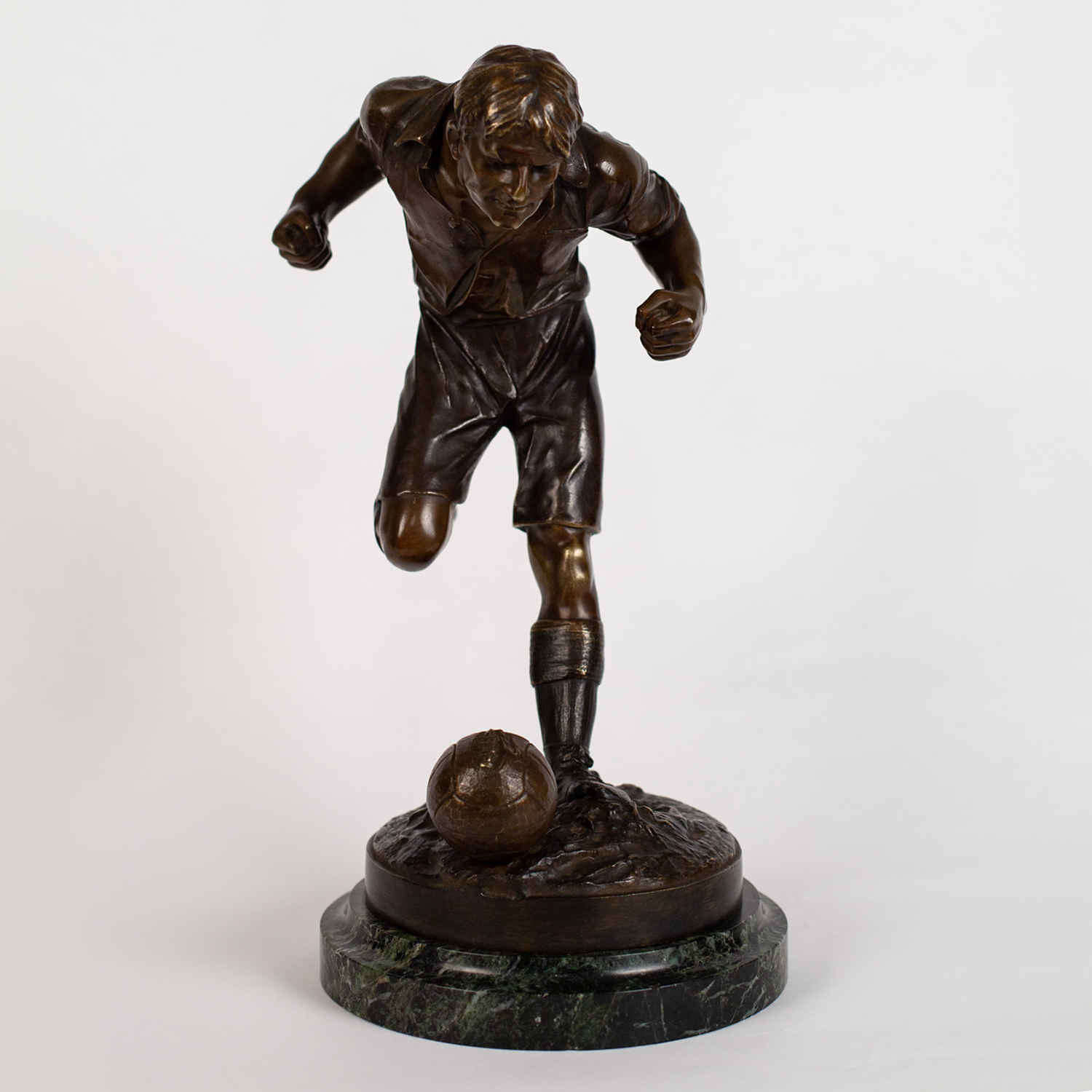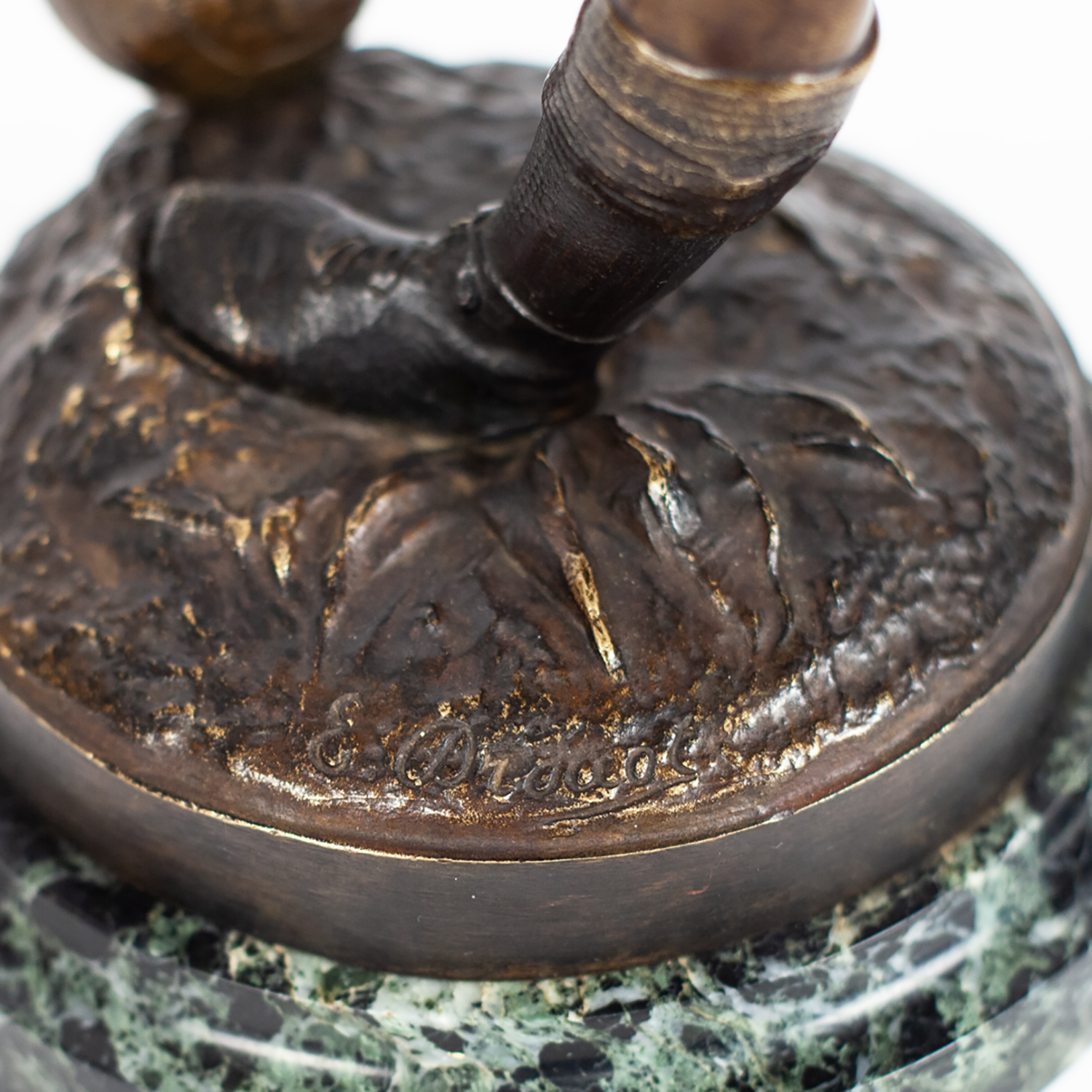 Бронза, литье, патинирование, камень, на основании факсимиле подписи «E. DROUOT» французского скульптора Эдуард Друо (Edouard Drouot, 1859-1945). Высота - 38 см, диаметр основания - 38 см.