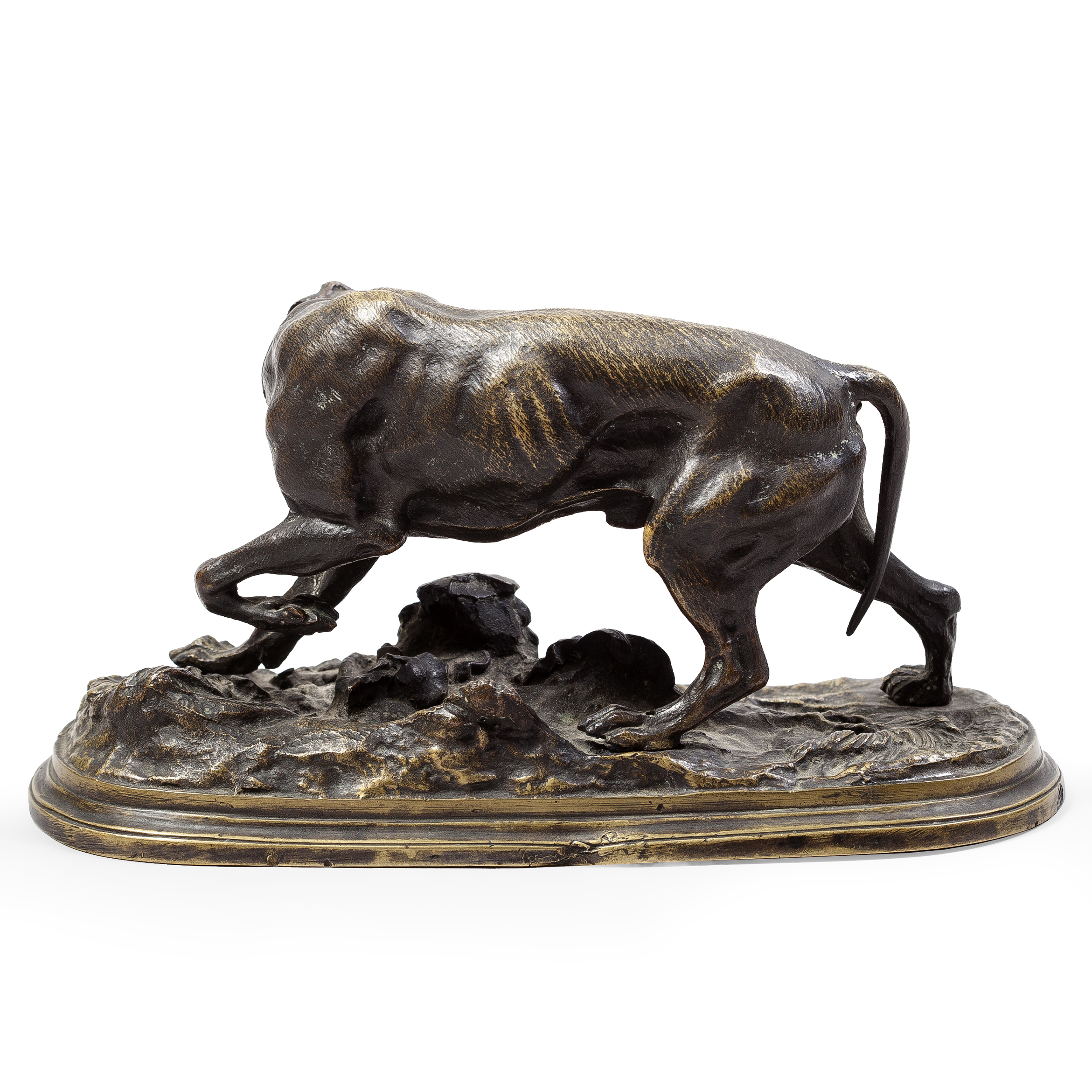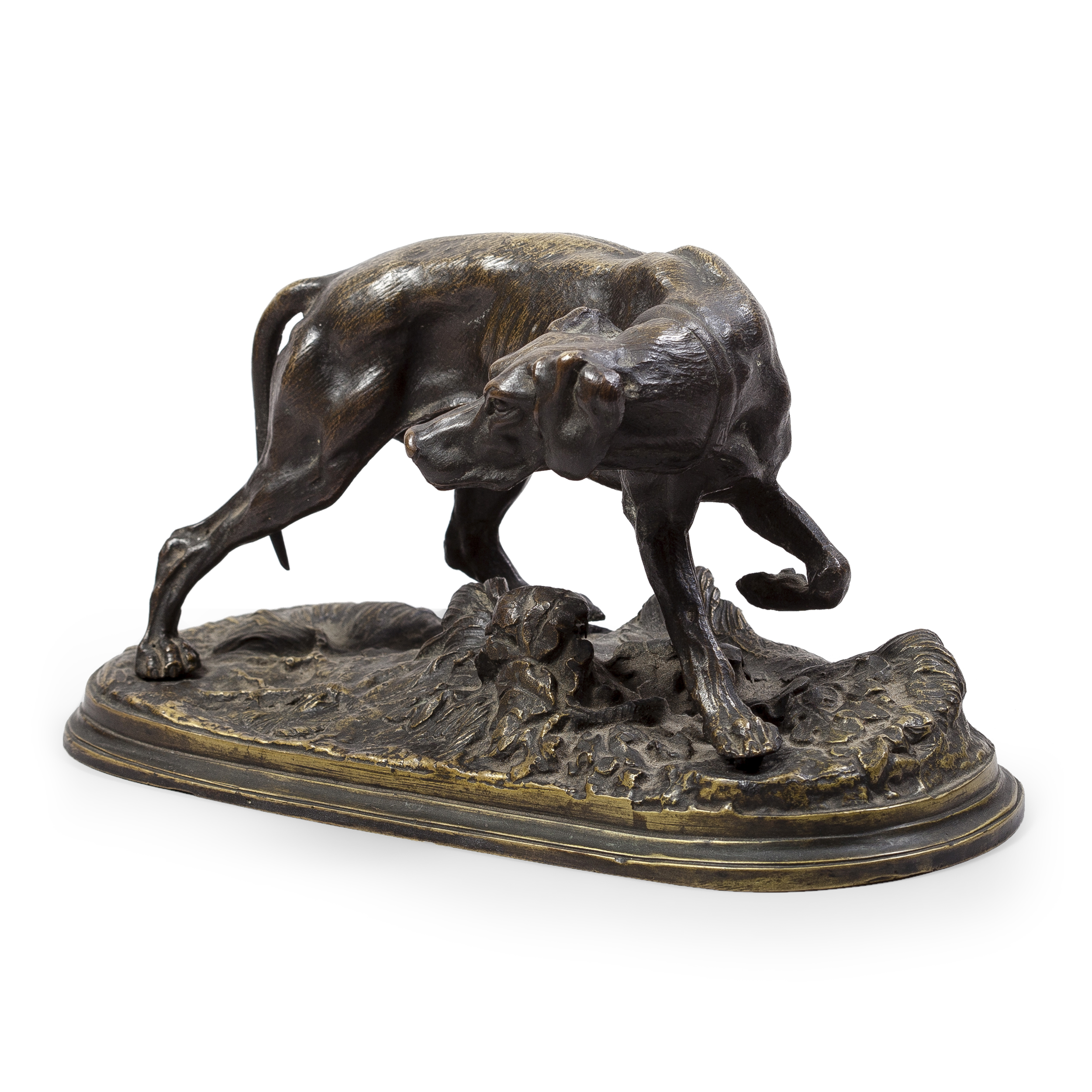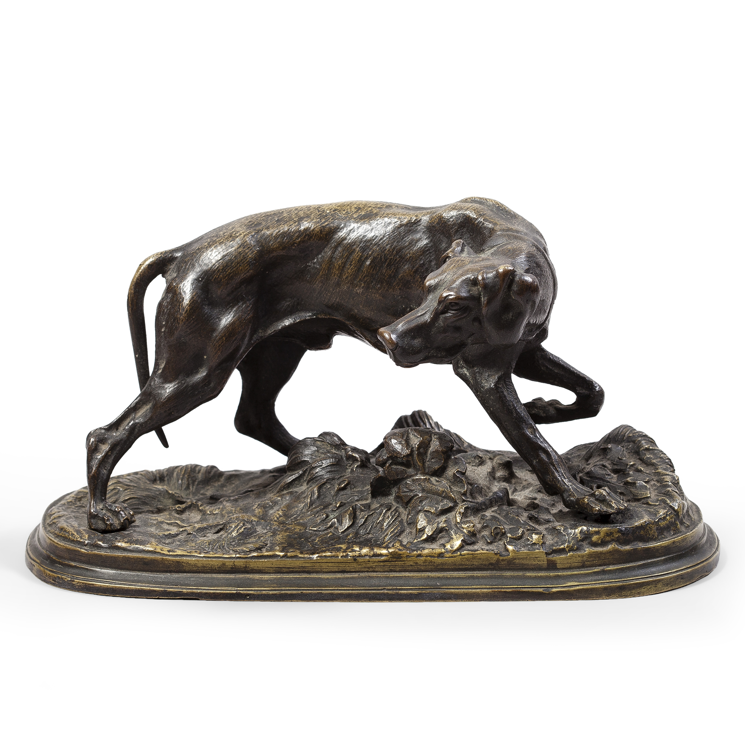 Бронзовая скульптура «Гончая» станет эффектным украшением гостиной, кабинета или столовой. Созданная еще в начале XX века статуэтка отличается тщательной проработкой деталей и удивительной энергетикой. Этот предмет антиквариата завораживает своим внутренним звучанием, уловить которое может лишь истинный ценитель прекрасного. Сильное, волевое животное, выполненное из благородного металла, восхищает своей грациозностью и плавностью словно застывших во времени движений. Такую антикварную бронзу выбирают мудрые, уверенные в себе люди с твердой жизненной позицией и особым взглядом на вещи.