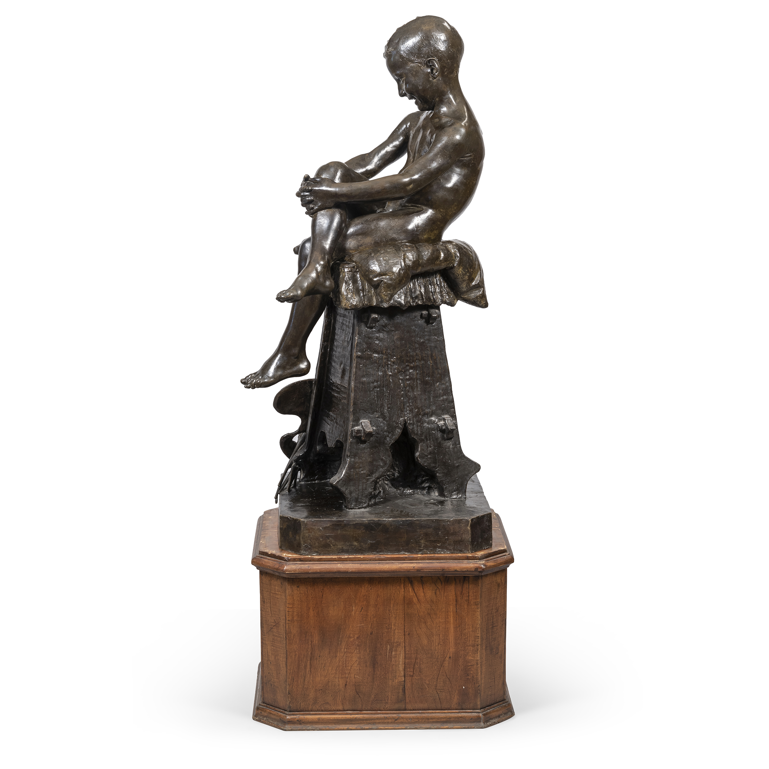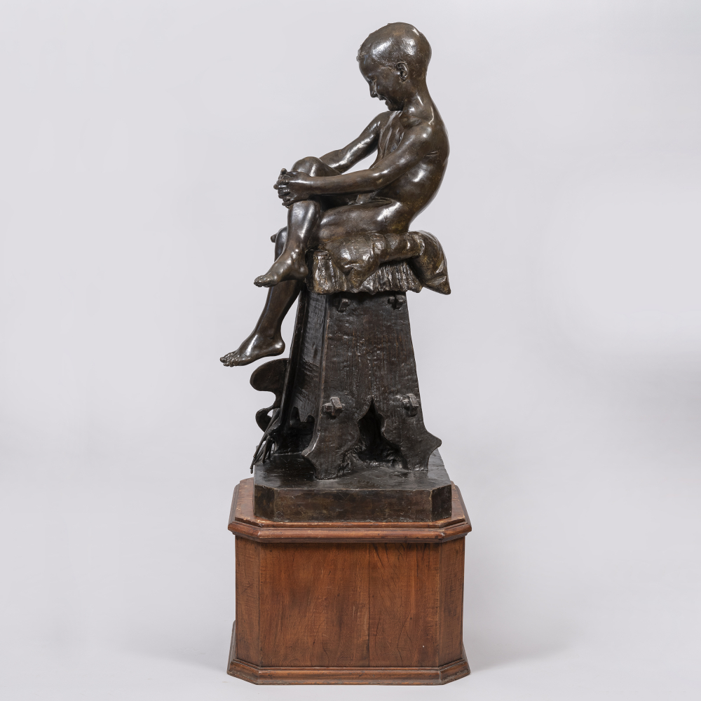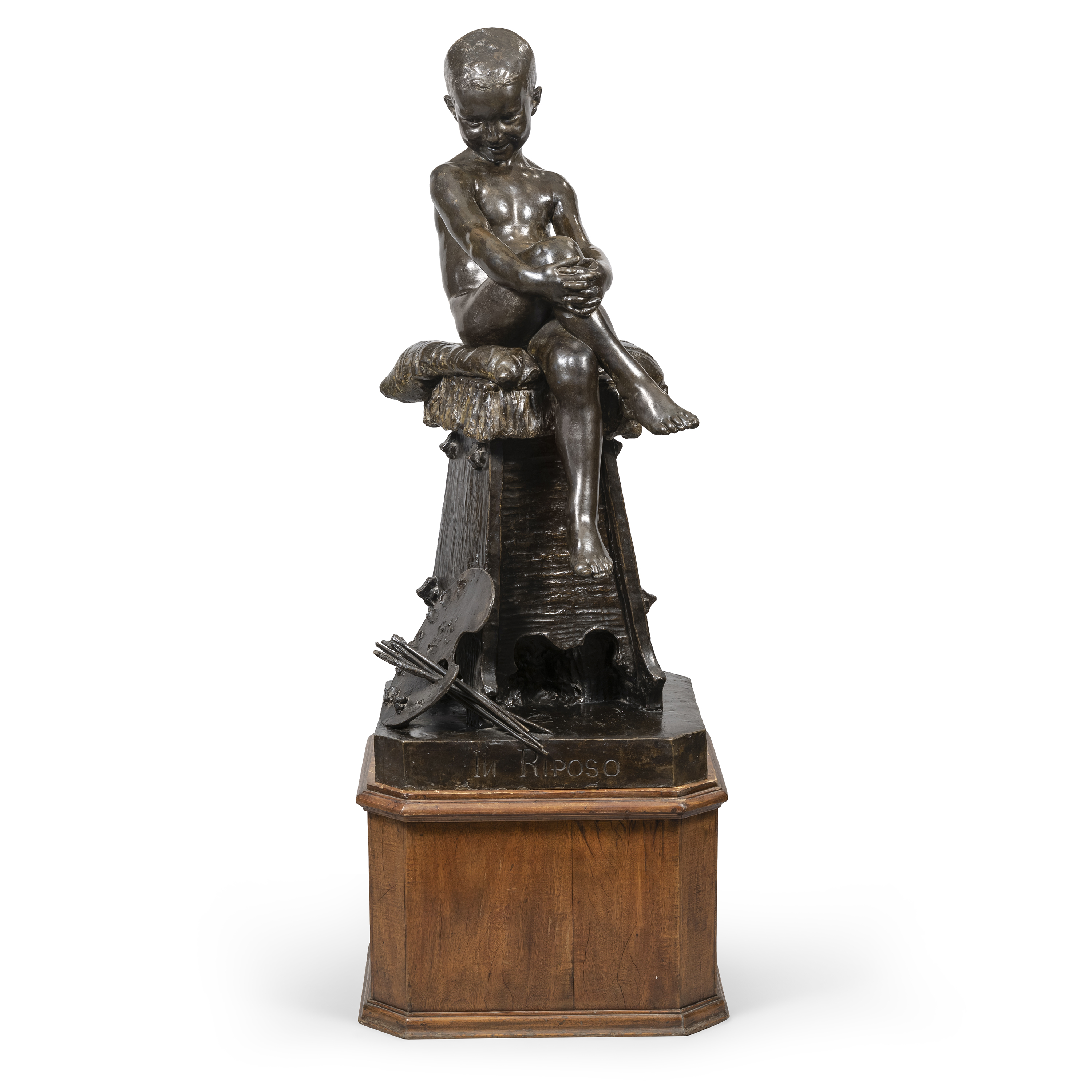 Или «Отдых натурщика» по известной модели ломбардского скульптора Луиджи Секки (Luigi Secchi, 1853-1921). Бронза, литье, патинирование, пьедестал красного дерева, на основании название скульптуры на итальянском языке «In Riposo», подпись в две строки «L.Secchi / Milano», марка литейной мастерской «G. STRADA and C FUSE», Италия, Милан, последняя четверть XIX века, высота скульптуры - 127 см, пьедестал - 41 х 56 х 61 см, общая высота - 168 см