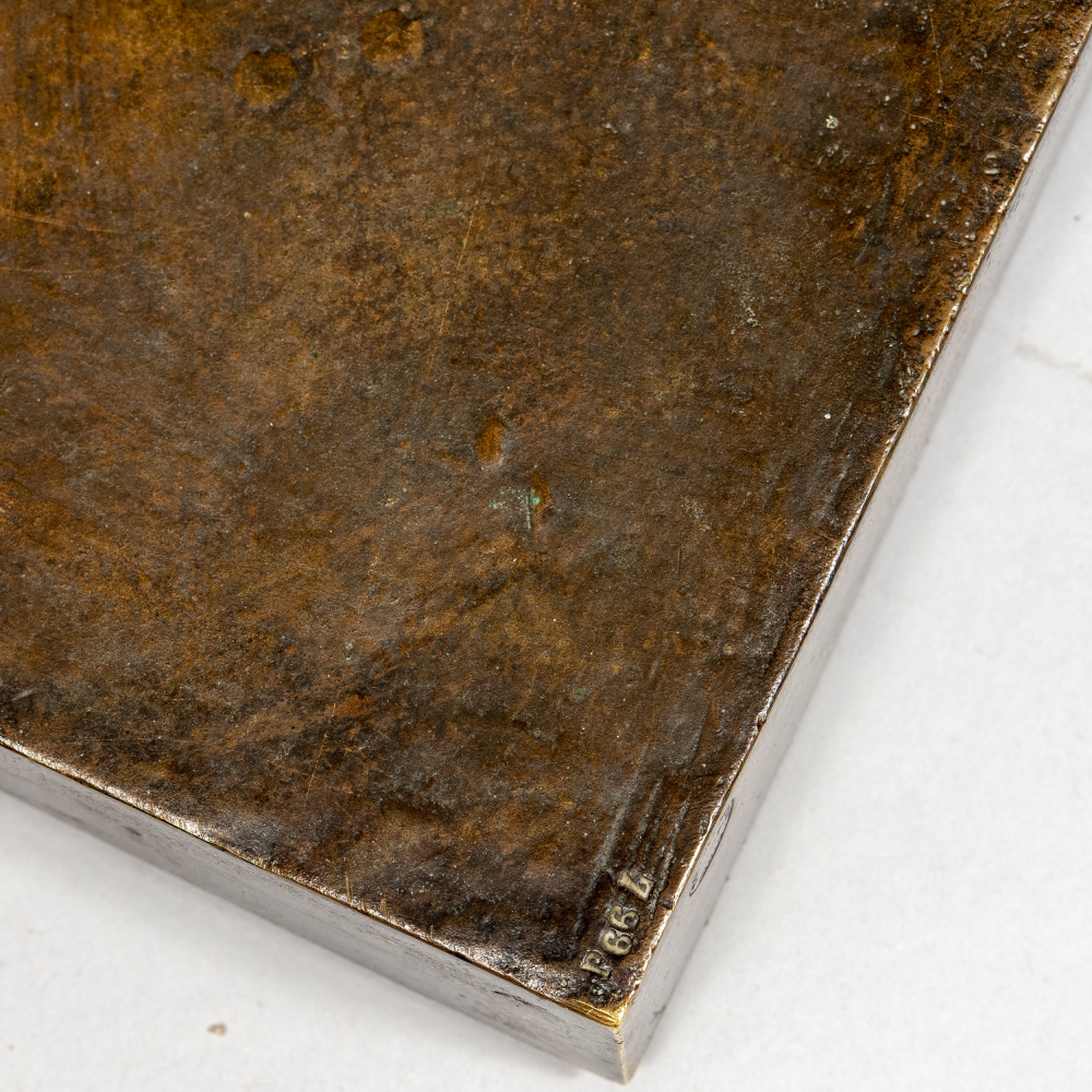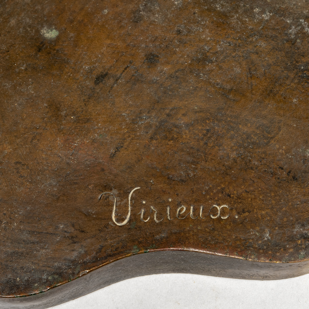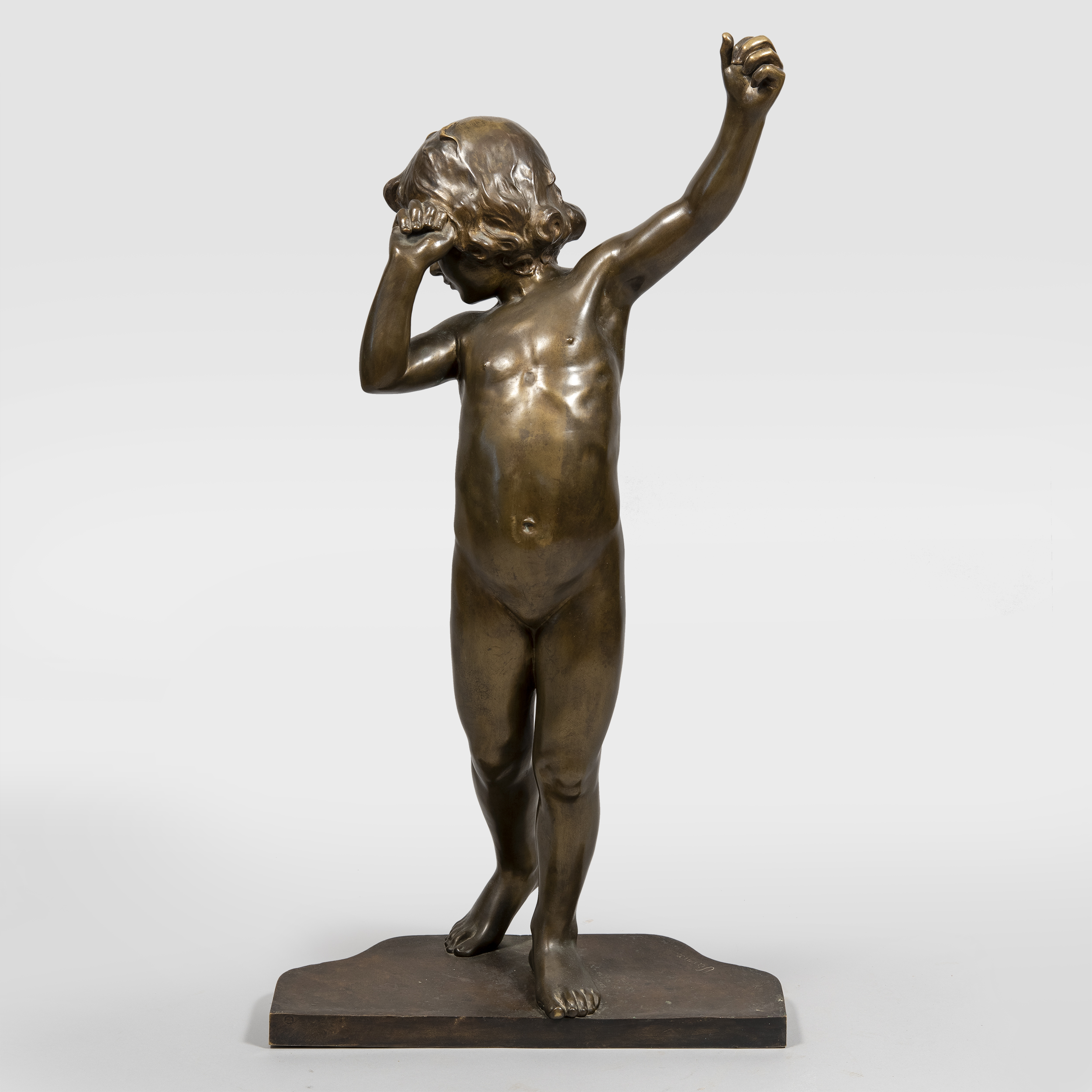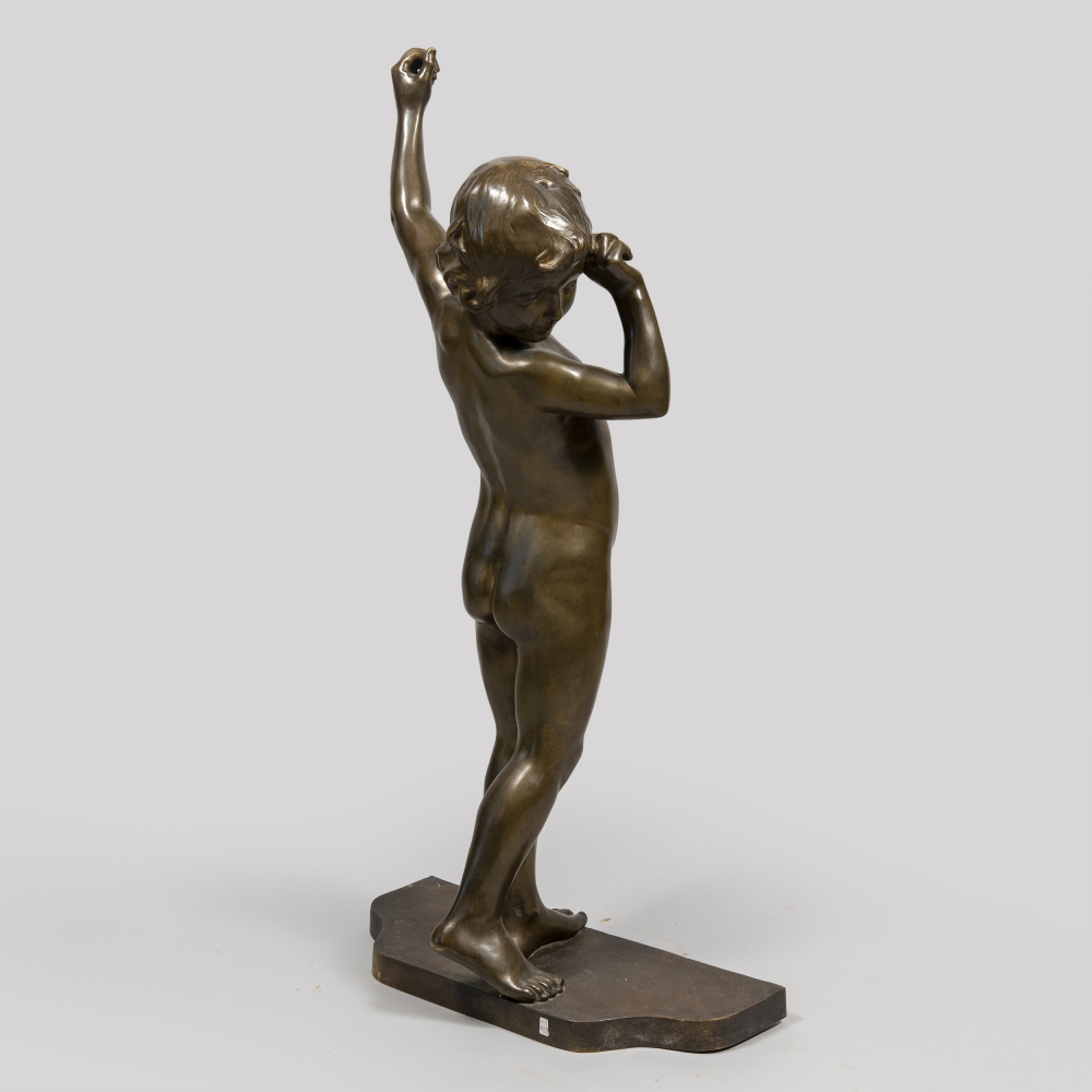По модели французского скульптора Франсуа Луи Вирьё «Ребёнок с поднятыми руками». Бронза, литье, патинирование, на постаменте воспроизведение подписи скульптора «Virieux», размер (в/ш/г): 97,5 x 50,5 x 25 см