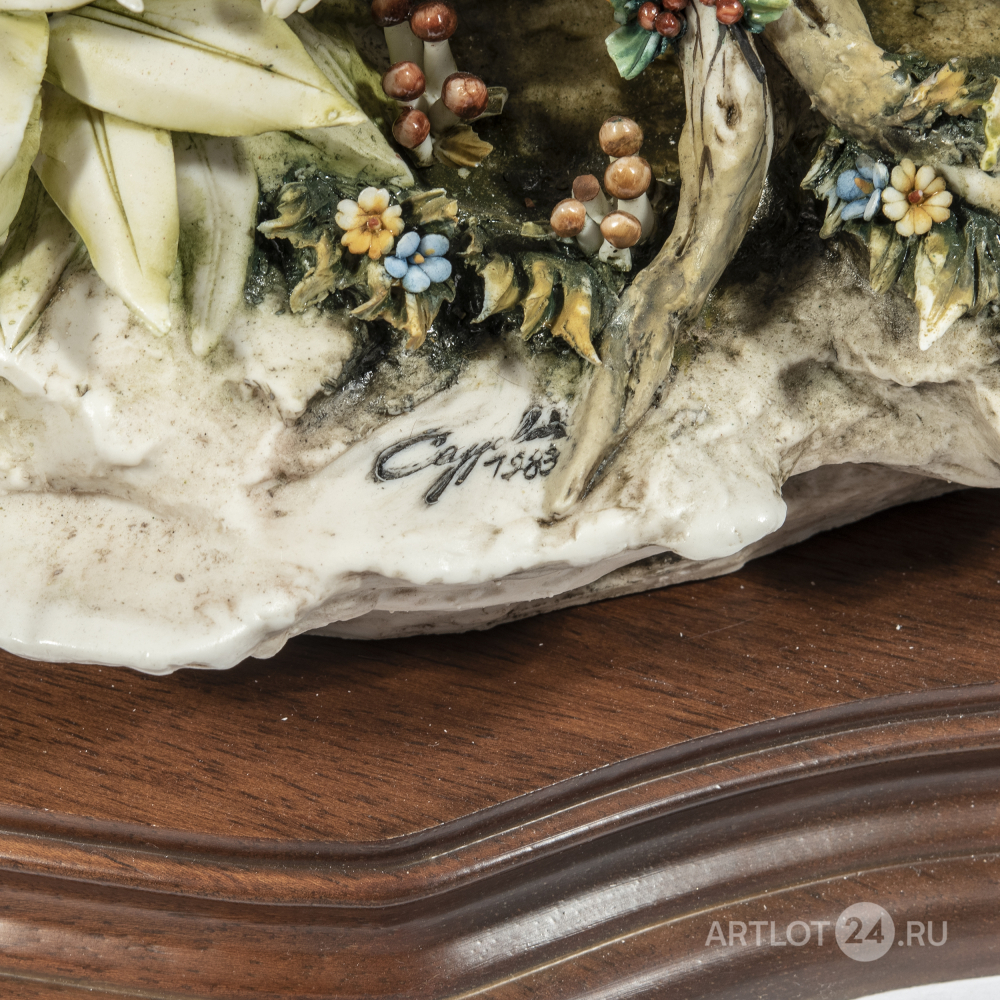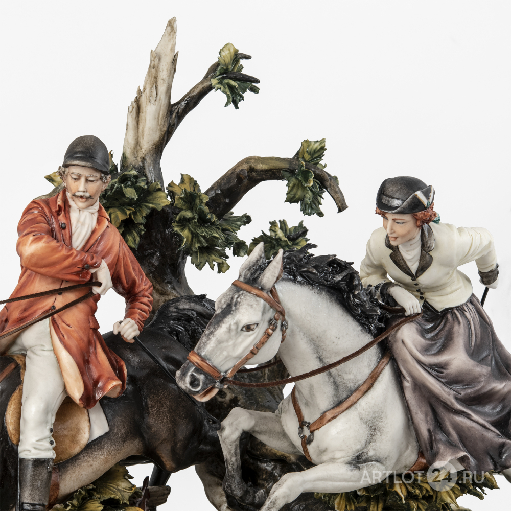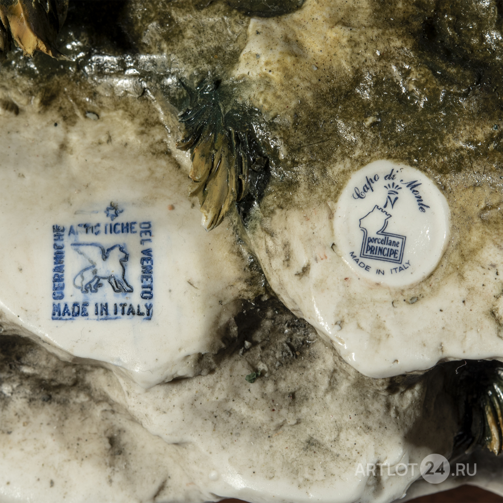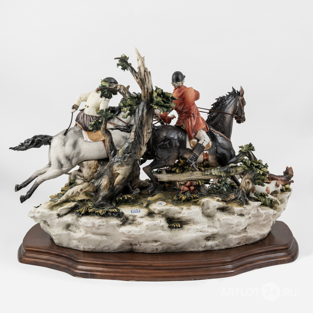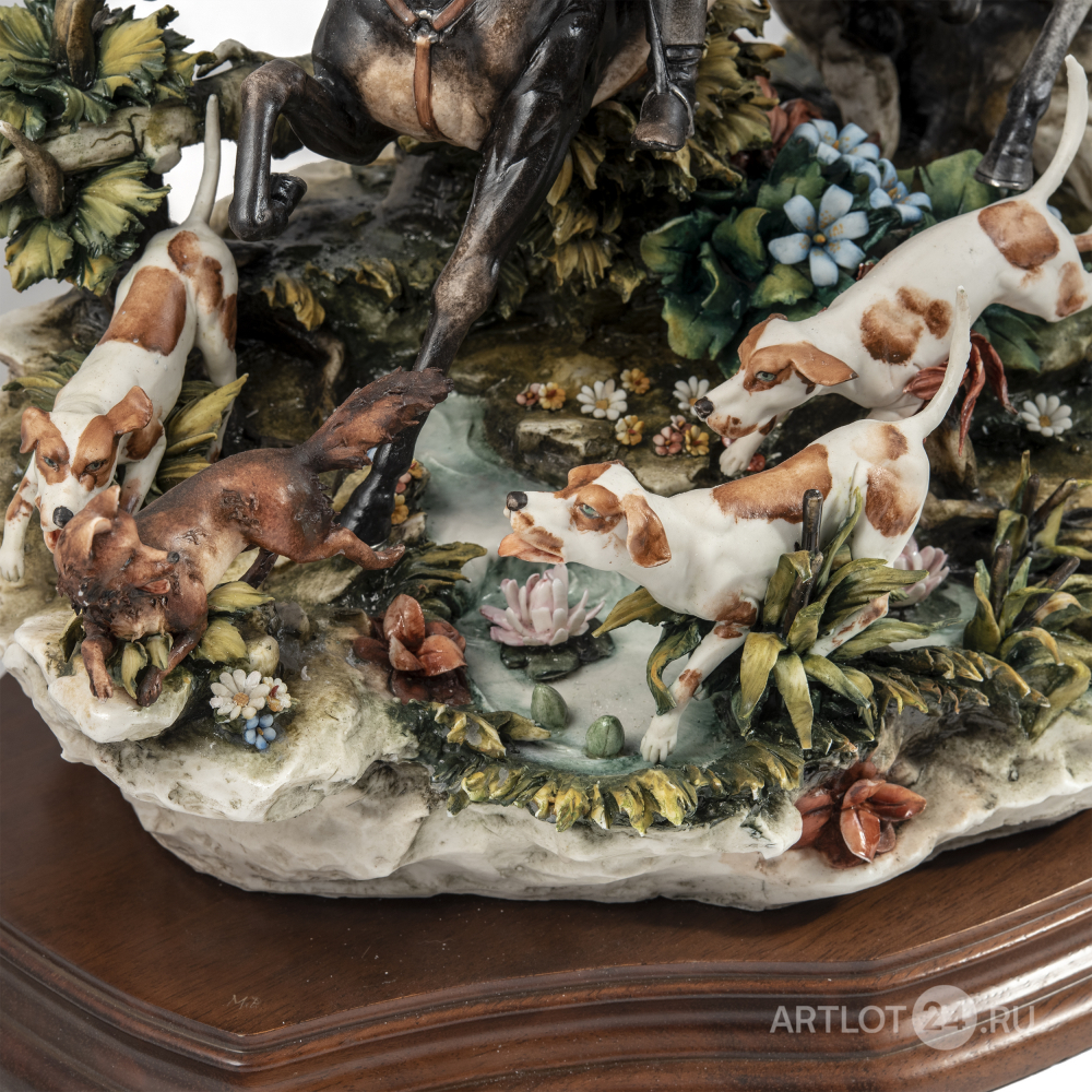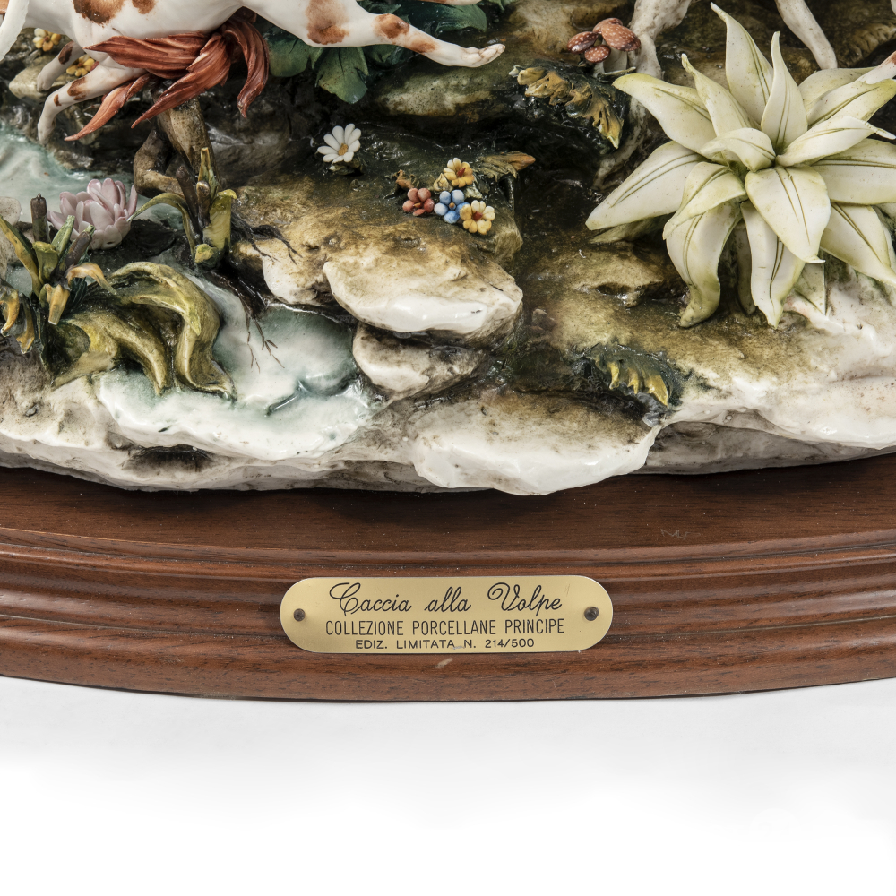 Из лимитированной серии скульптур, посвященной сценам охоты. Бисквит, лепка, полихромная роспись, частичное глазурование, выполнена по модели скульптора первой половины XVIII века Лучано Каццола (Luciano Cazzola), на поземе клеймо штампом в массе в виде крылатого льва и надписи «CERAMICHE ARTISTICHE DEL VENETO MADE IN ITALY», оттиск штампом «Capo di Monte porcellane PRINCIPE MADE IN ITALY» c N под короной, а также факсимиле подписи «Cazzola 1983»; на шильде «Caccia alla Volpe COLLEZIONE PORCELLANE PRINCIPE EDIZ. LIMITATA N. 214/500», Италия, Виченца, фарфоровая мануфактура Каподимонте в Монтичелло-Конте-Отто, 1983 год, размер (в/ш/г): 42 х 63 х 37 см