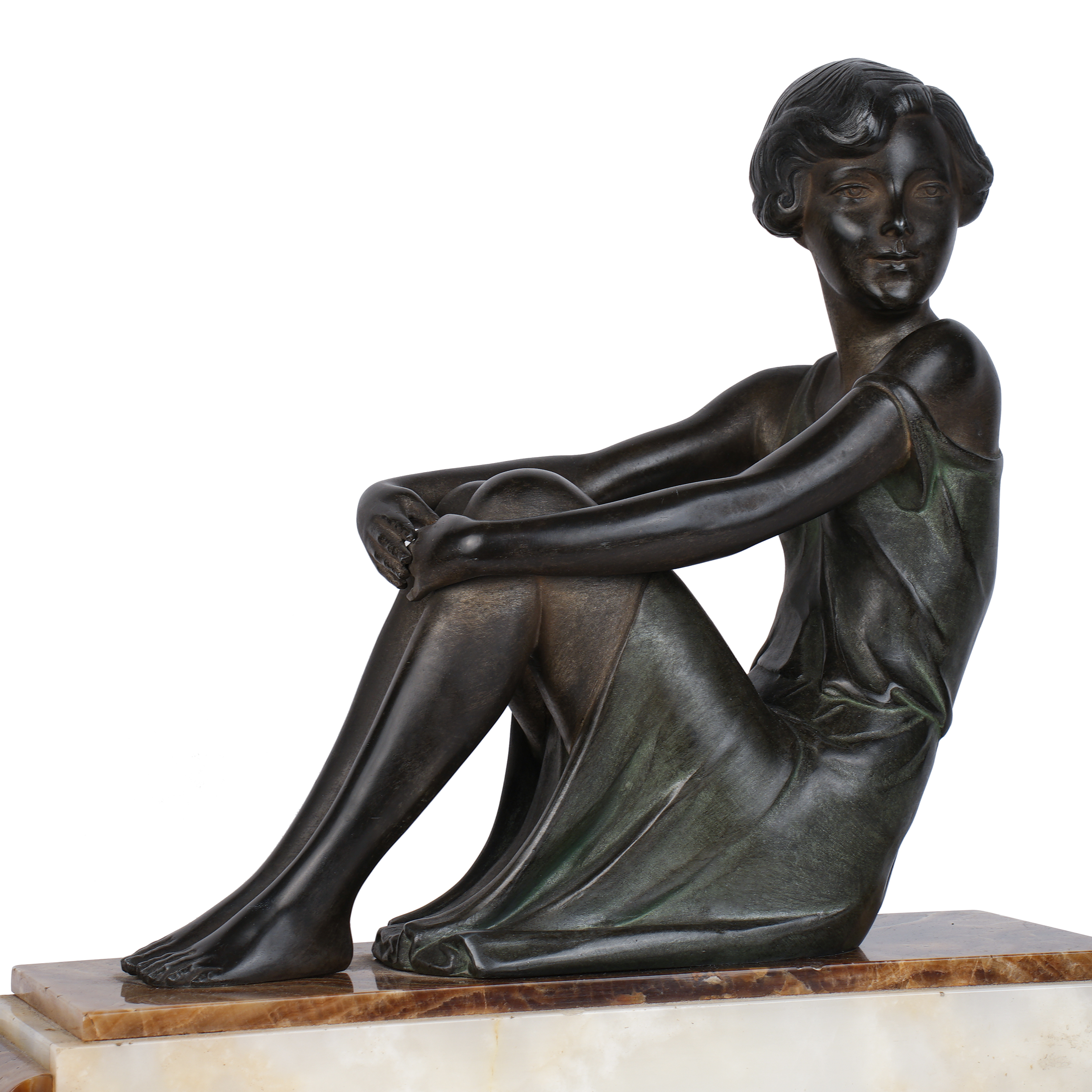 Выполнена в стиле ар-деко. Шпиатр, окрашивание, оникс, подпись в массе по подолу платья «P. SECA», а также «FRANCE» штампом, Франция, 1920-1930-е годы, размер (в/ш/г): 36 х 46 х 13 см