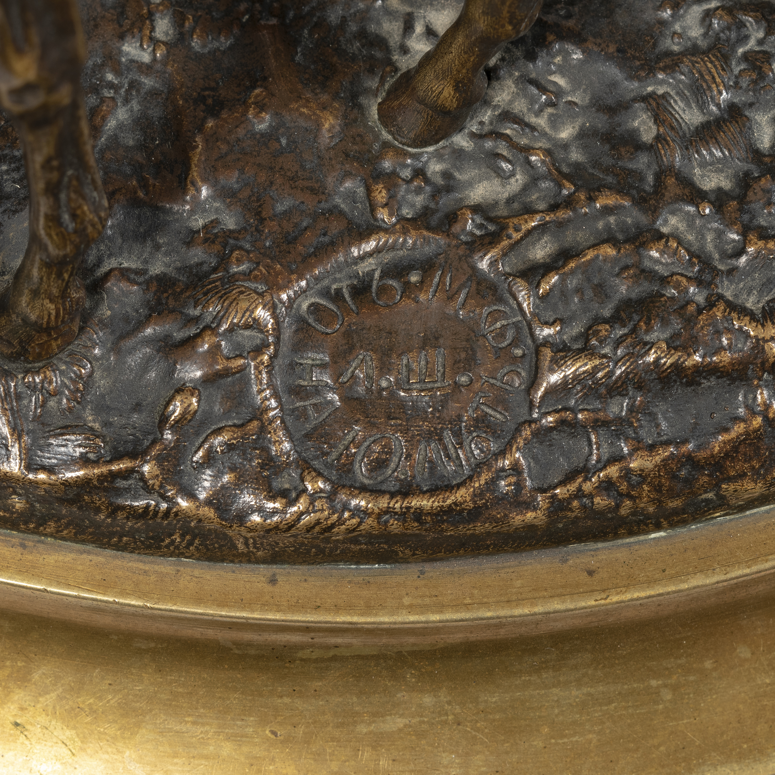 Модель 1869 года, значится в списке произведений Е. Лансере, хранящемся в Академии Художеств, под №38. Бронза, литье, чеканка, патинирование, оксидирование; в литье марки «ЛЪПИЛЪ: Е: ЛАНСЕРЕ: Ф. ШОПЕНЪ», а также патентное клеймо с надписью: «ОТЪ МФ Л.Ш. НА 10 ЛЪТЪ», неизвестное бронзолитейное предприятие по образцу в бронзе, исполненному на Фабрике художественной бронзы Ф. Шопена (1813-1892), конец XIX – начало XX века, размер (в/ш/г): 23,5 х 36,6 х 14,5 см, вес – 9,7 кг.