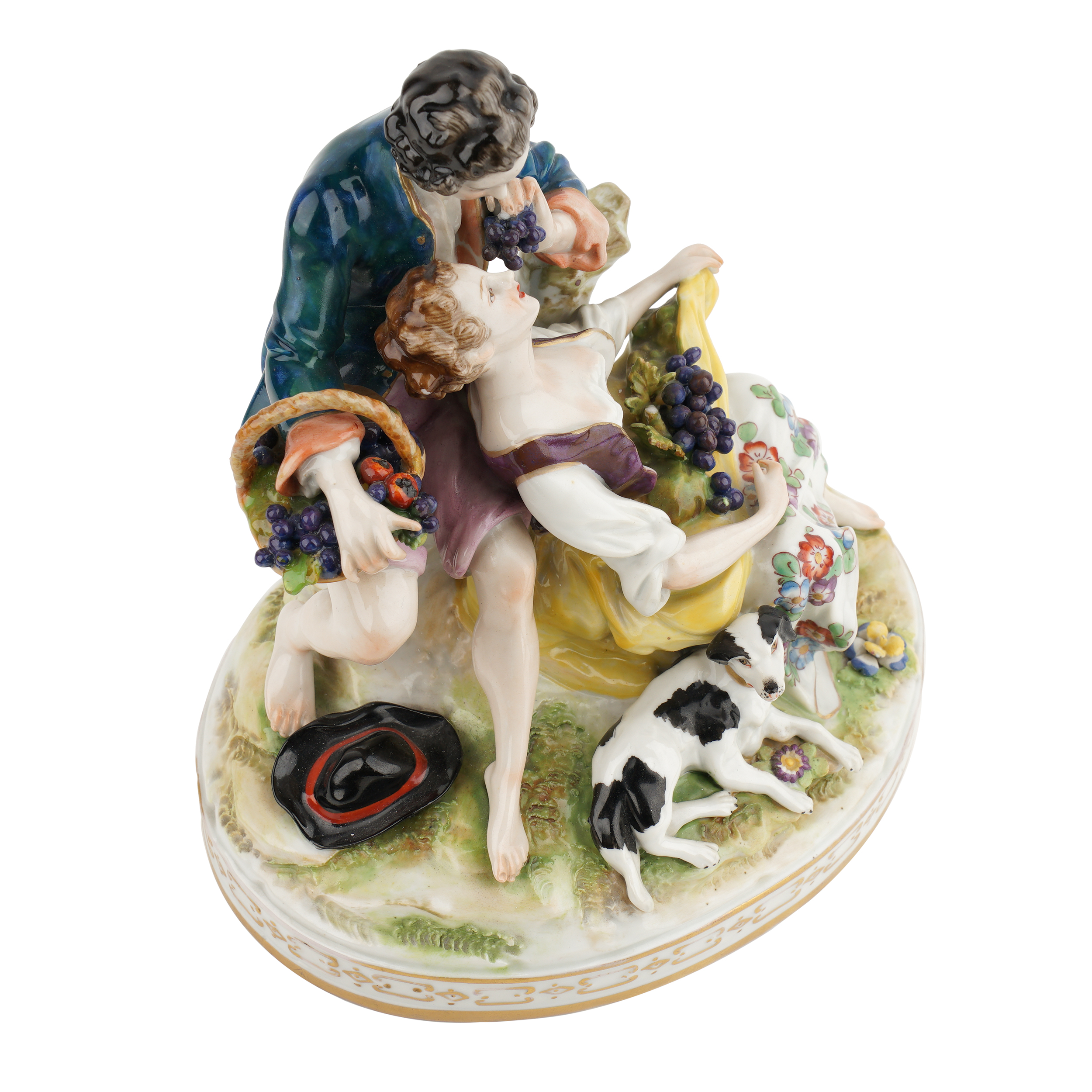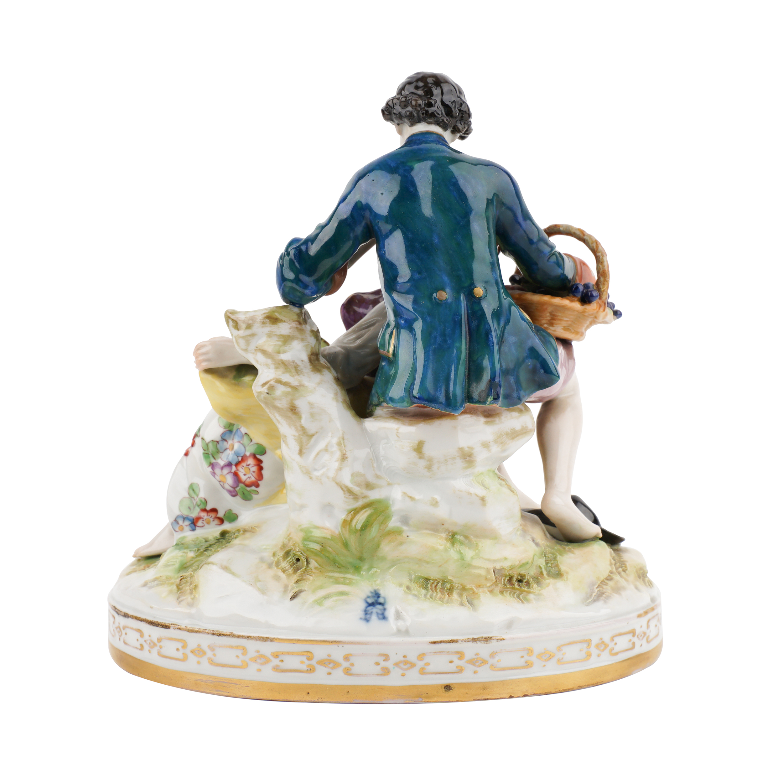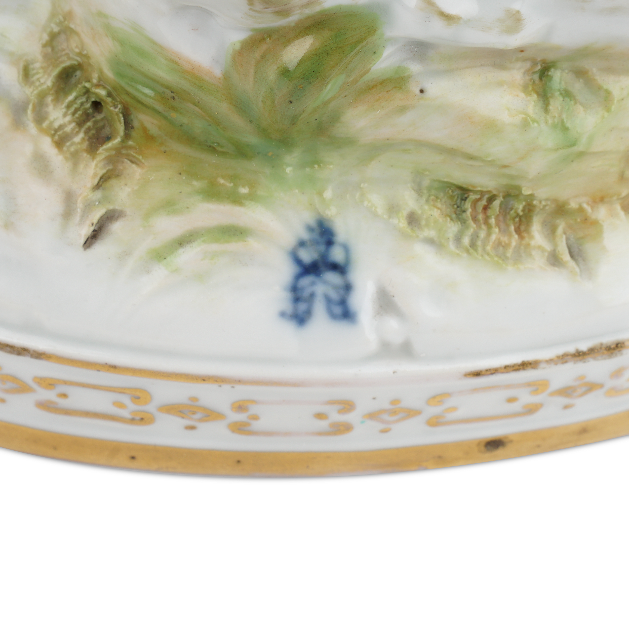 Фарфор, лепка, полихромная надглазурная роспись, золочение, подглазурное клеймо кобальтом в виде зеркальной монограммы «FG» под короной.