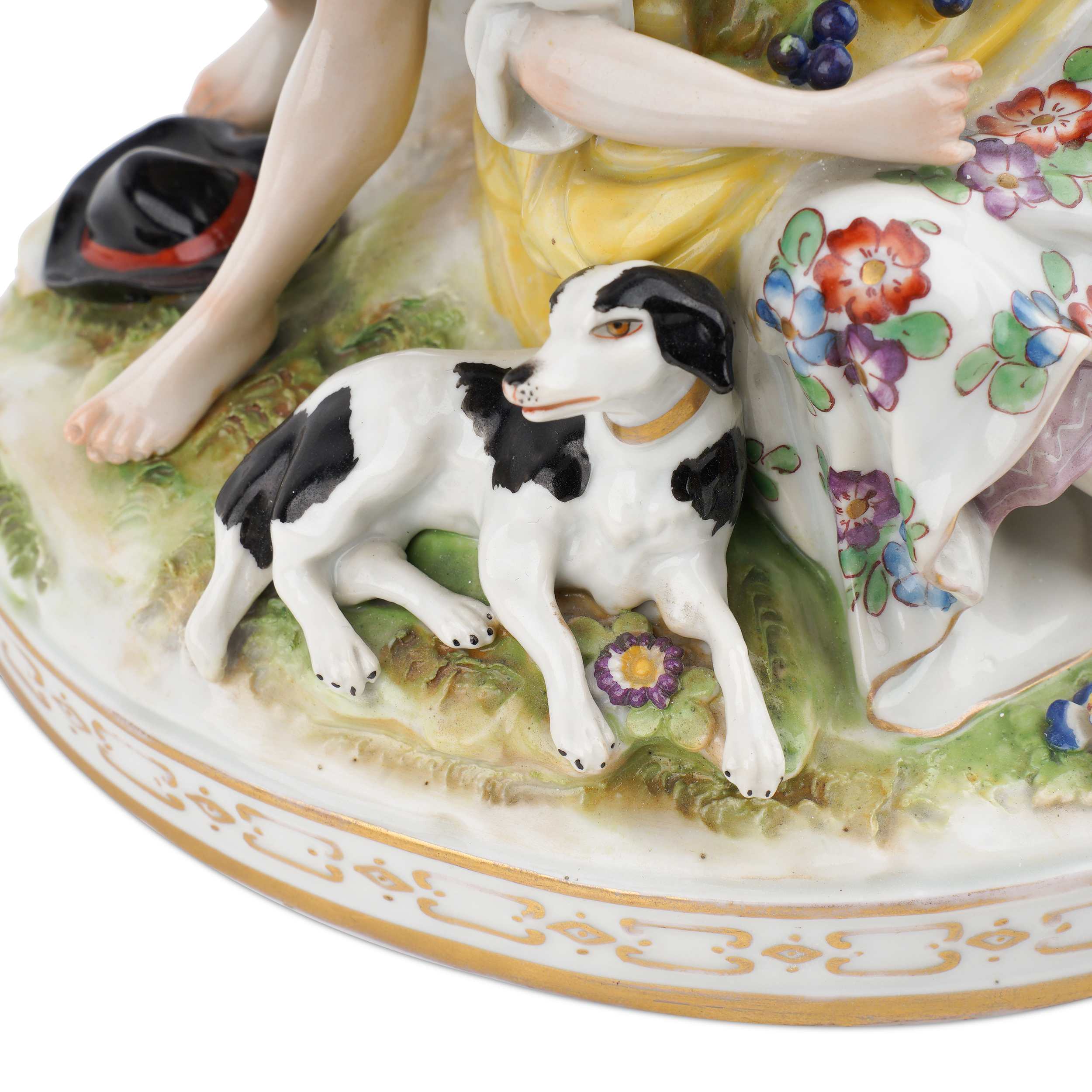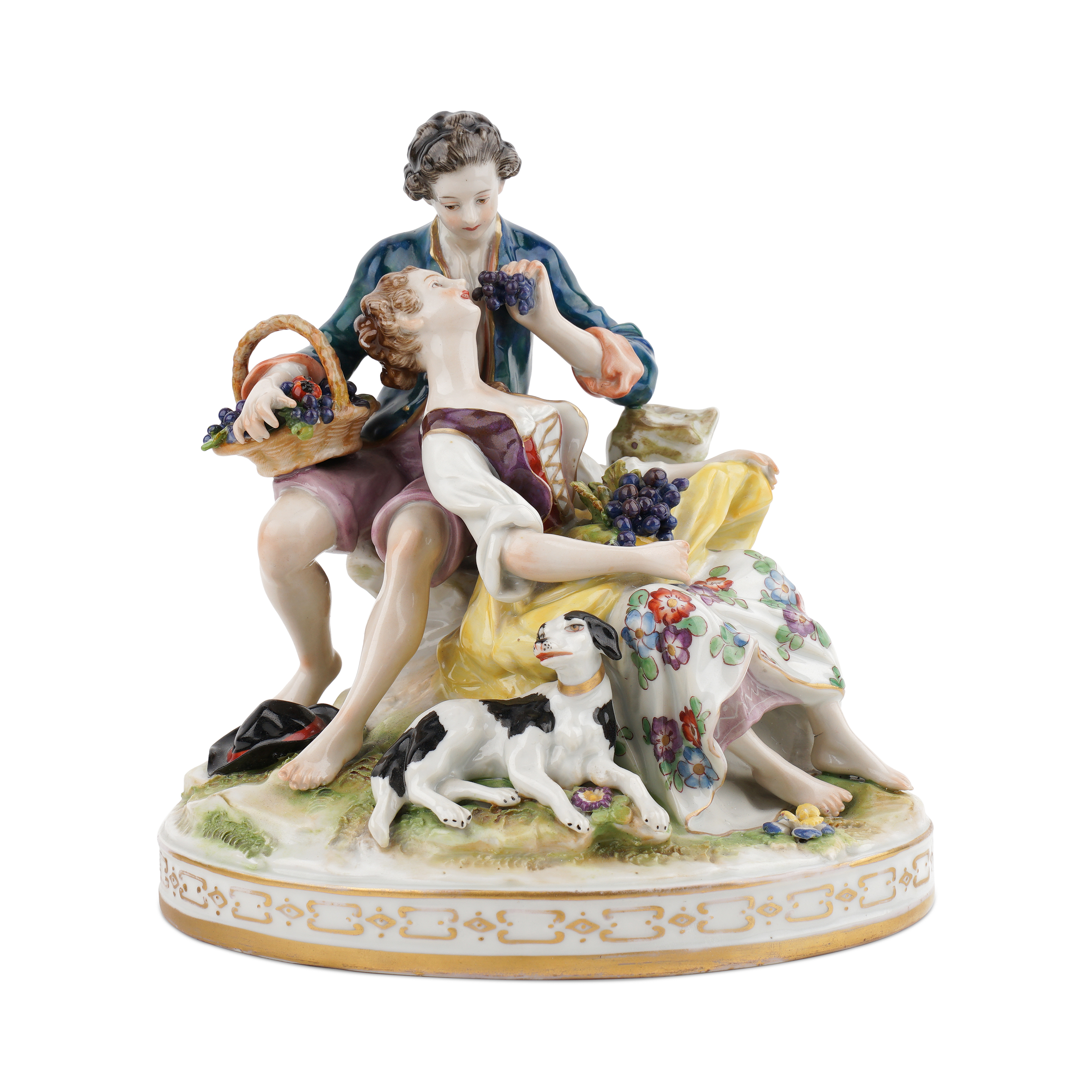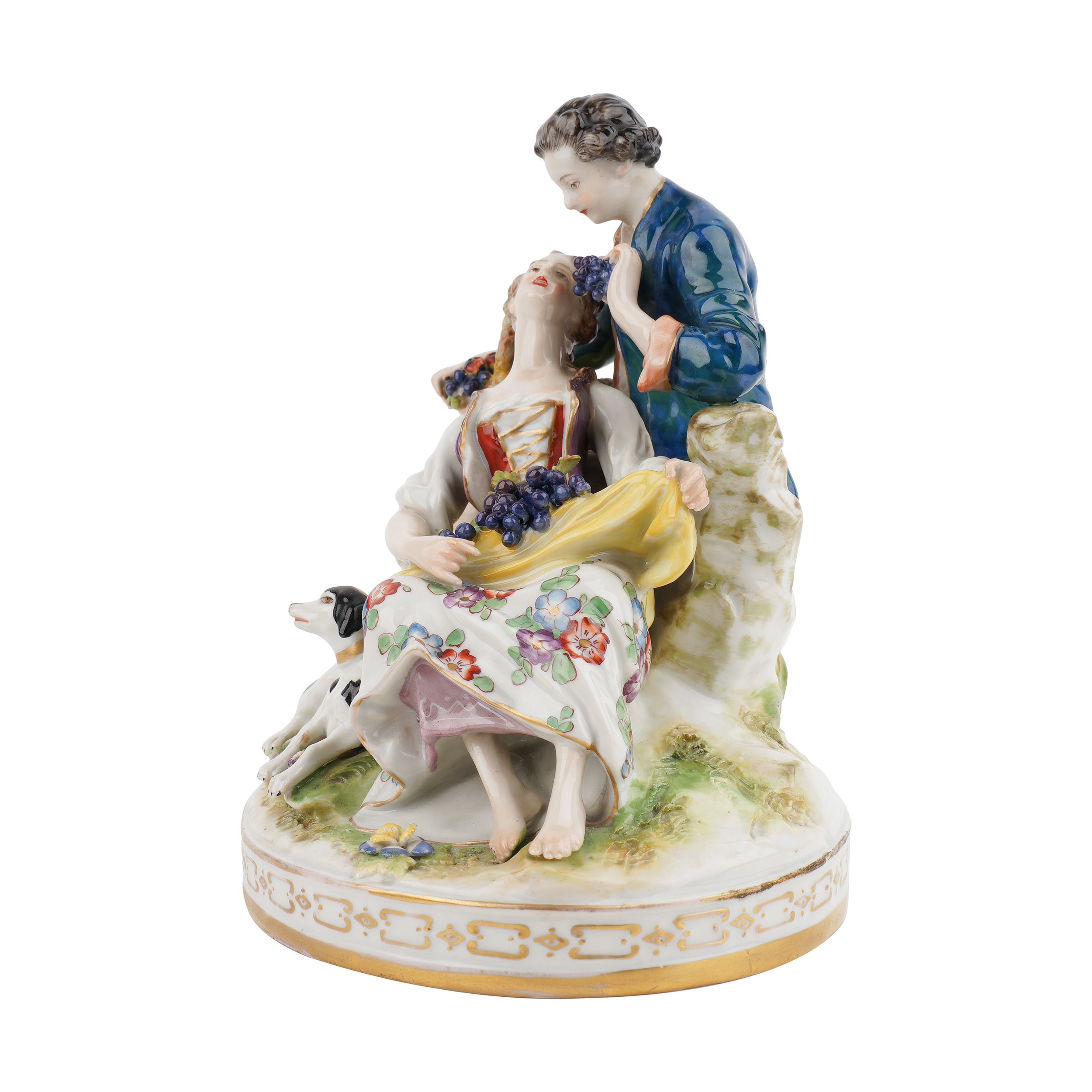 Фарфор, лепка, полихромная надглазурная роспись, золочение, подглазурное клеймо кобальтом в виде зеркальной монограммы «FG» под короной.