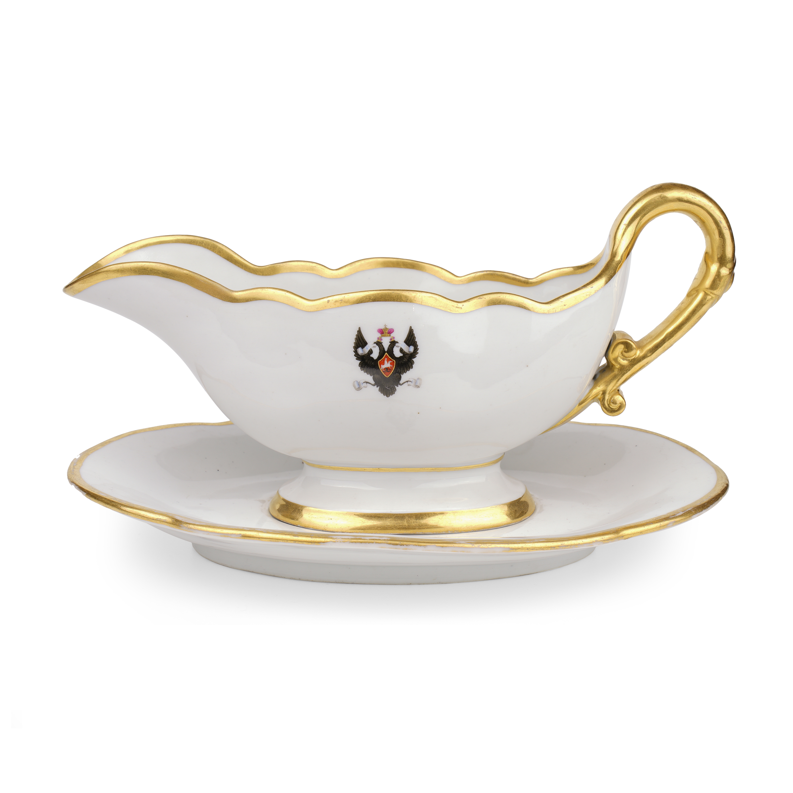 Соусник на поддоне с изображением двуглавого орла под императорской короной. Фарфор, полихромная надглазурная роспись, золочение, цировка, подглазурная марка кобальтом «НI» под императорской короной, Россия, период правления Николая I, 1825 – 1855 годы. Размер соусника (в/ш/г): 12,5 х 25,5 х 9,4 см, поддона: 25 х 18 см.