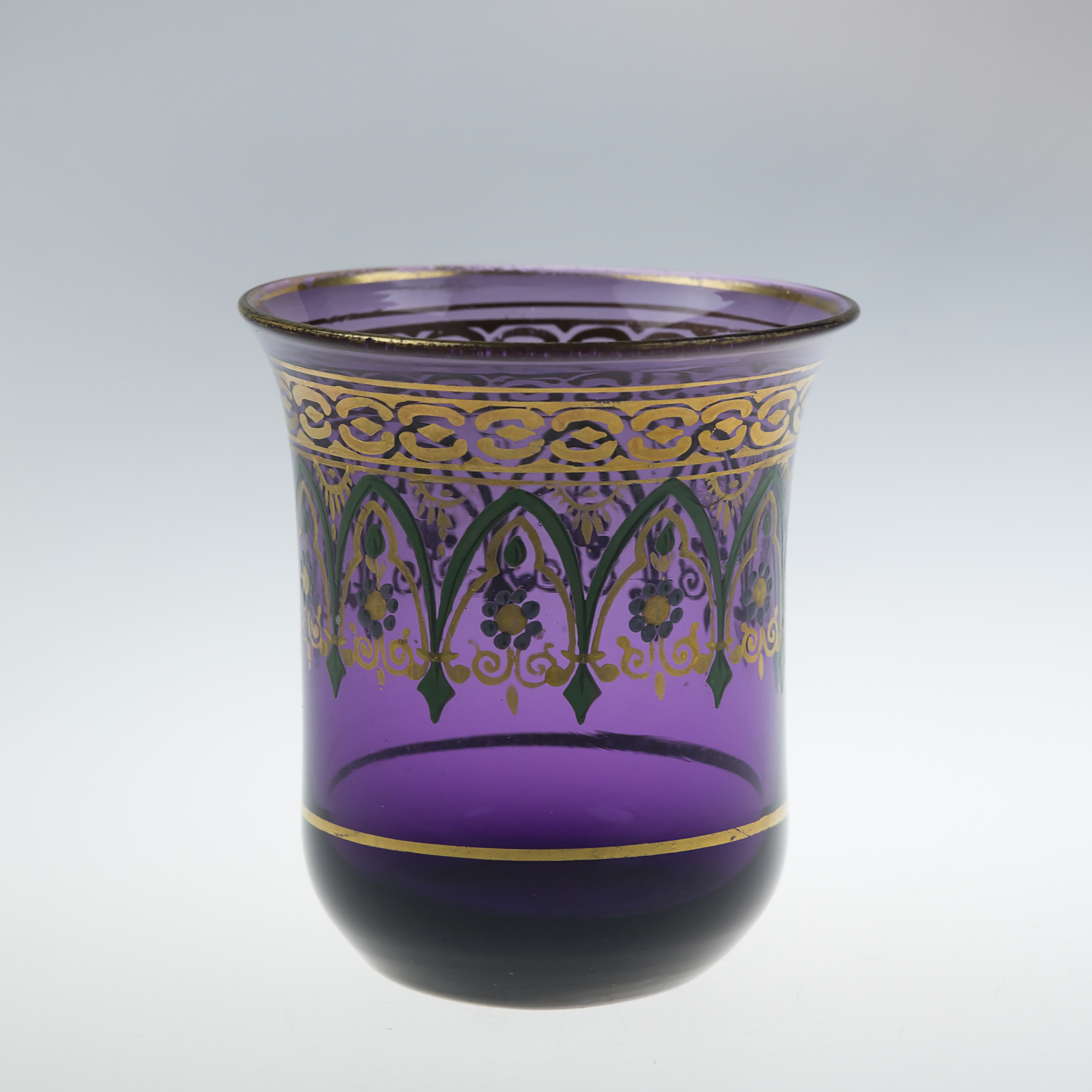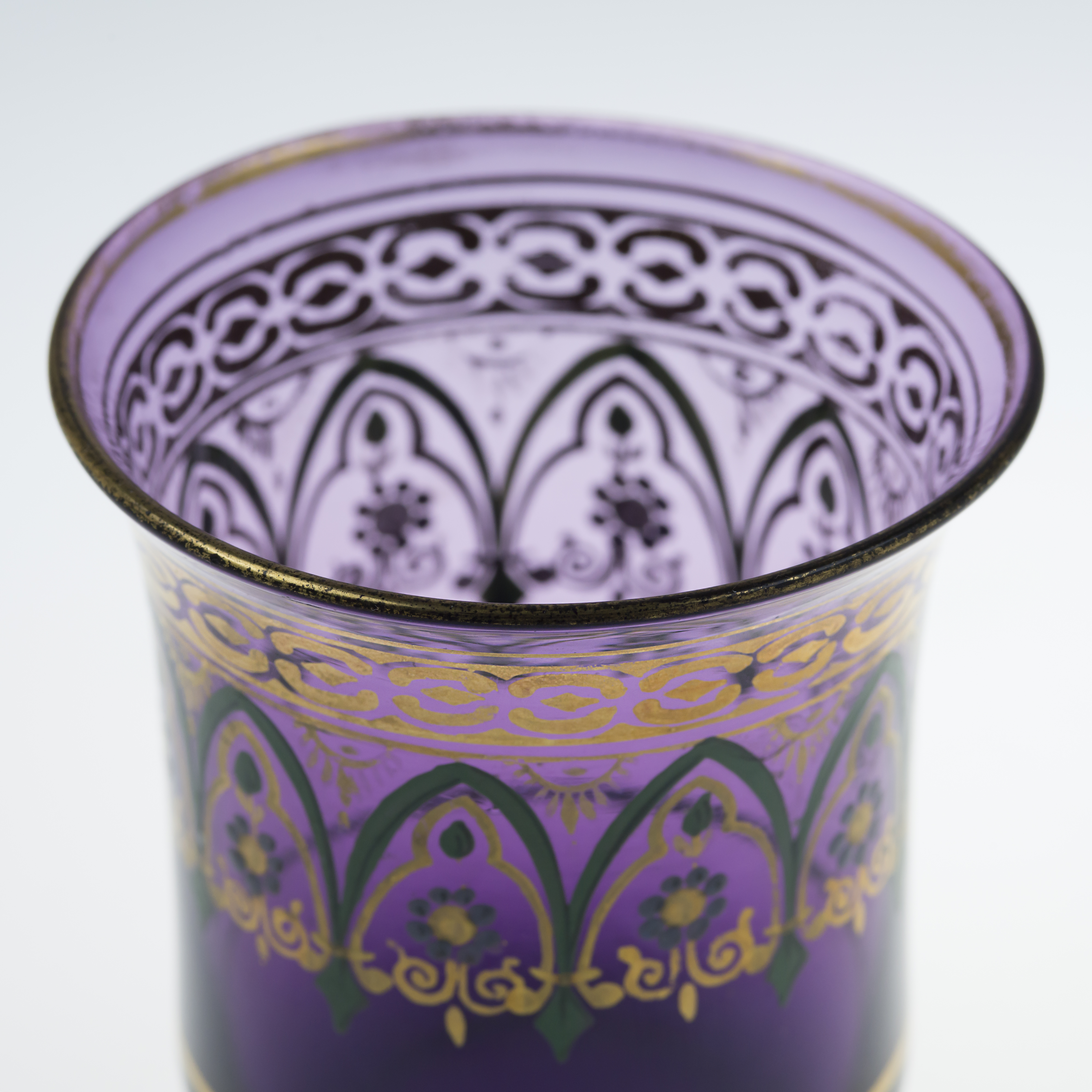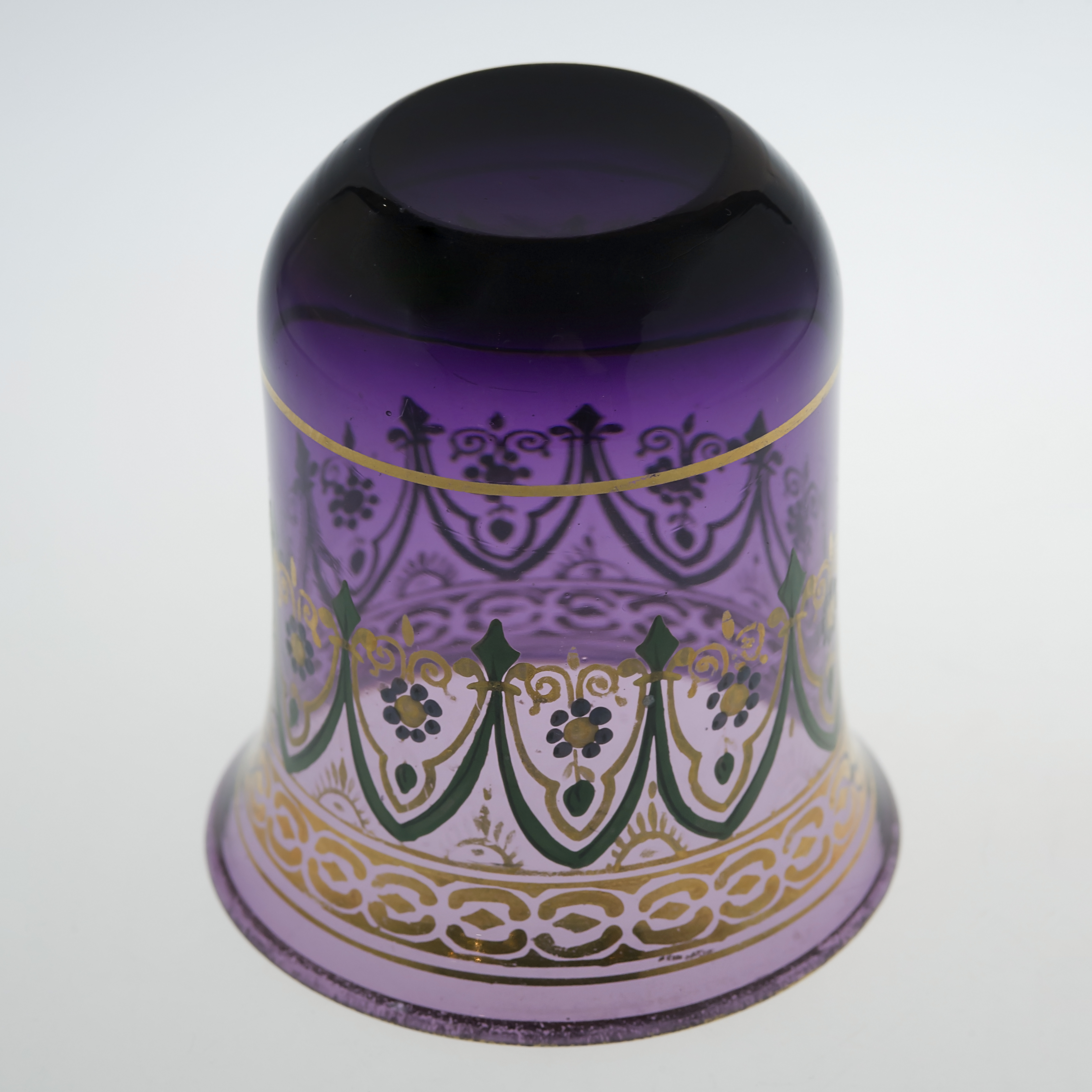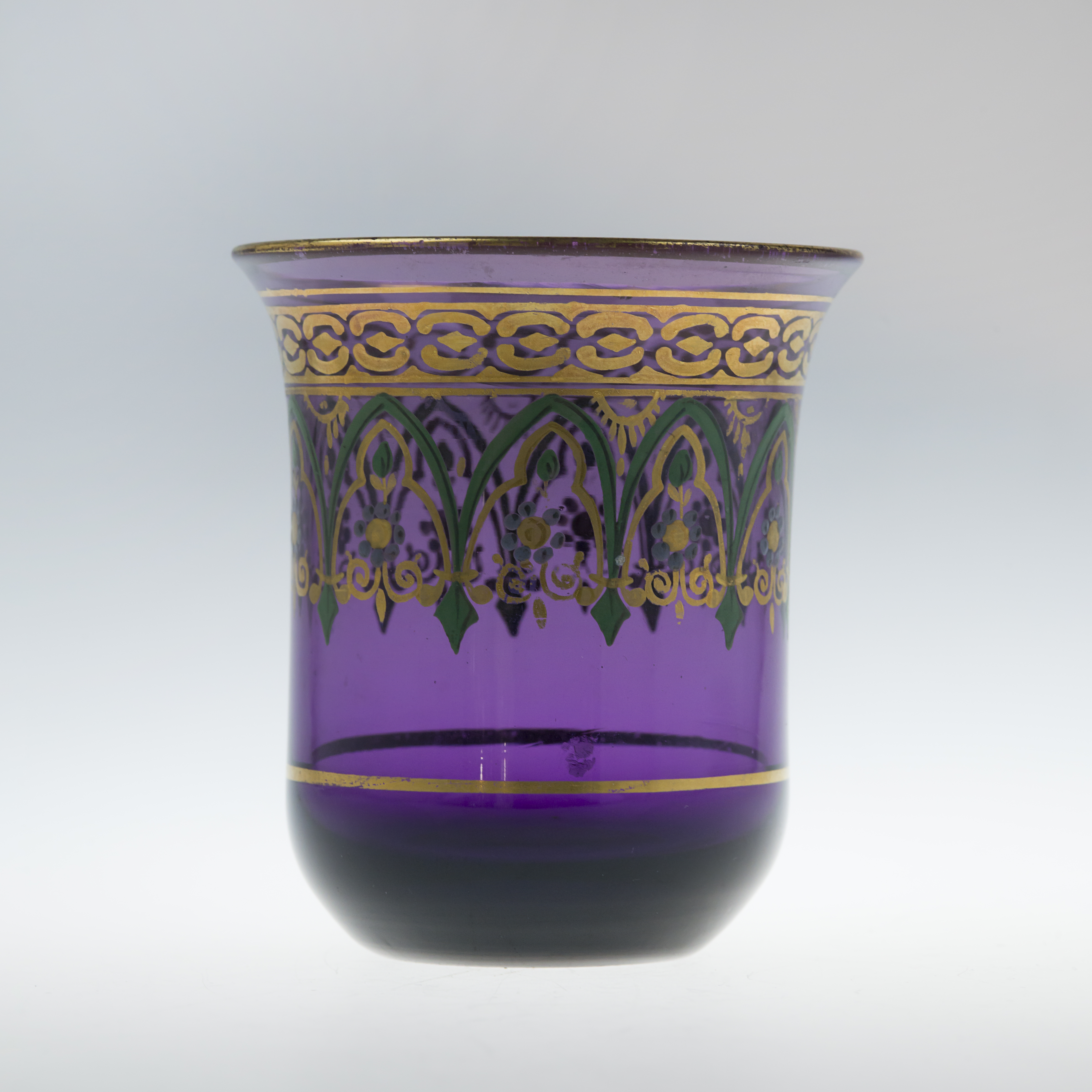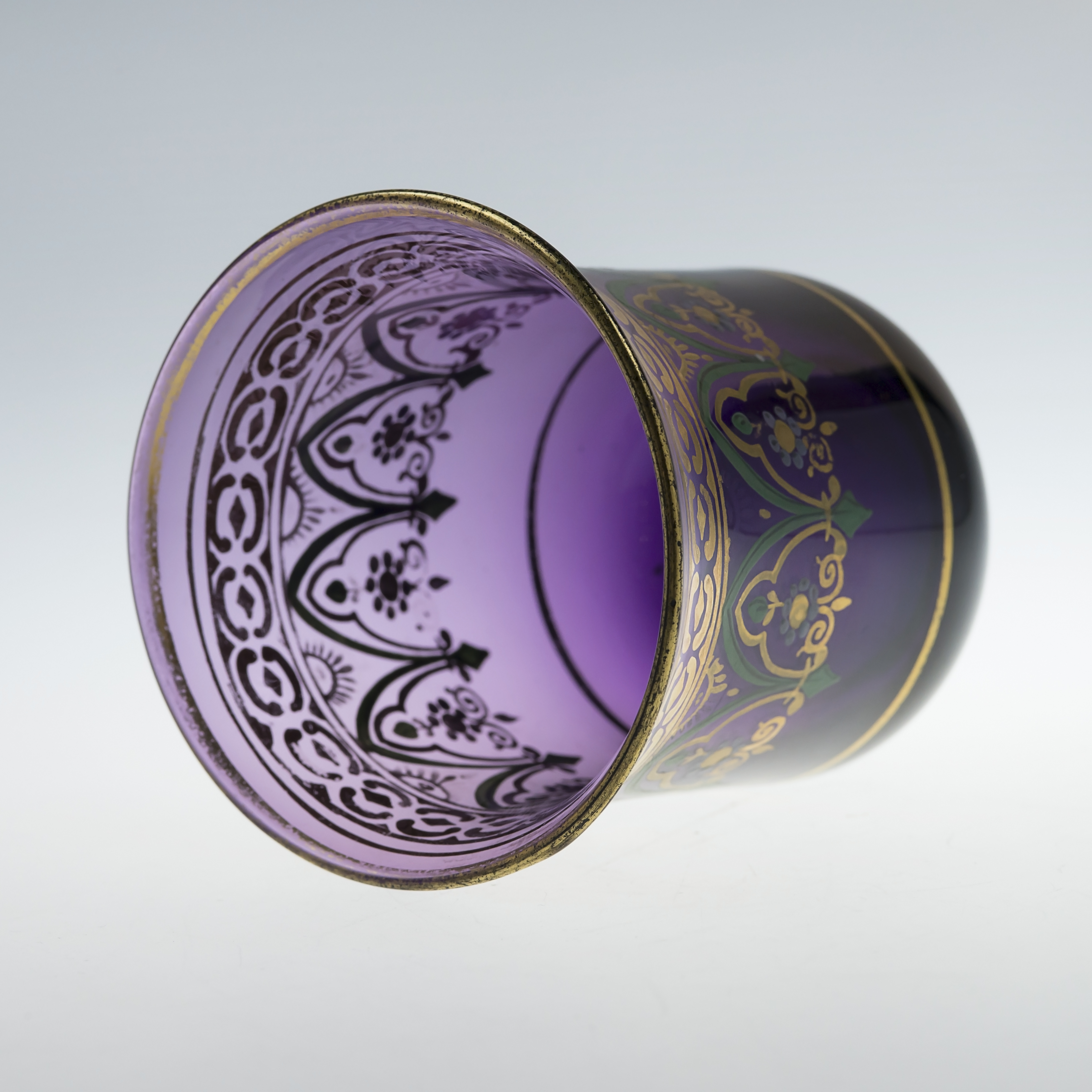 Аметистовое стекло, роспись монохромной эмалью, серебром и золотом; Россия, Пензенская губерния, Николо-Бахметевский хрустальный завод (с 1764 года); высота – 8,1 см, диаметр – 7,5 см.