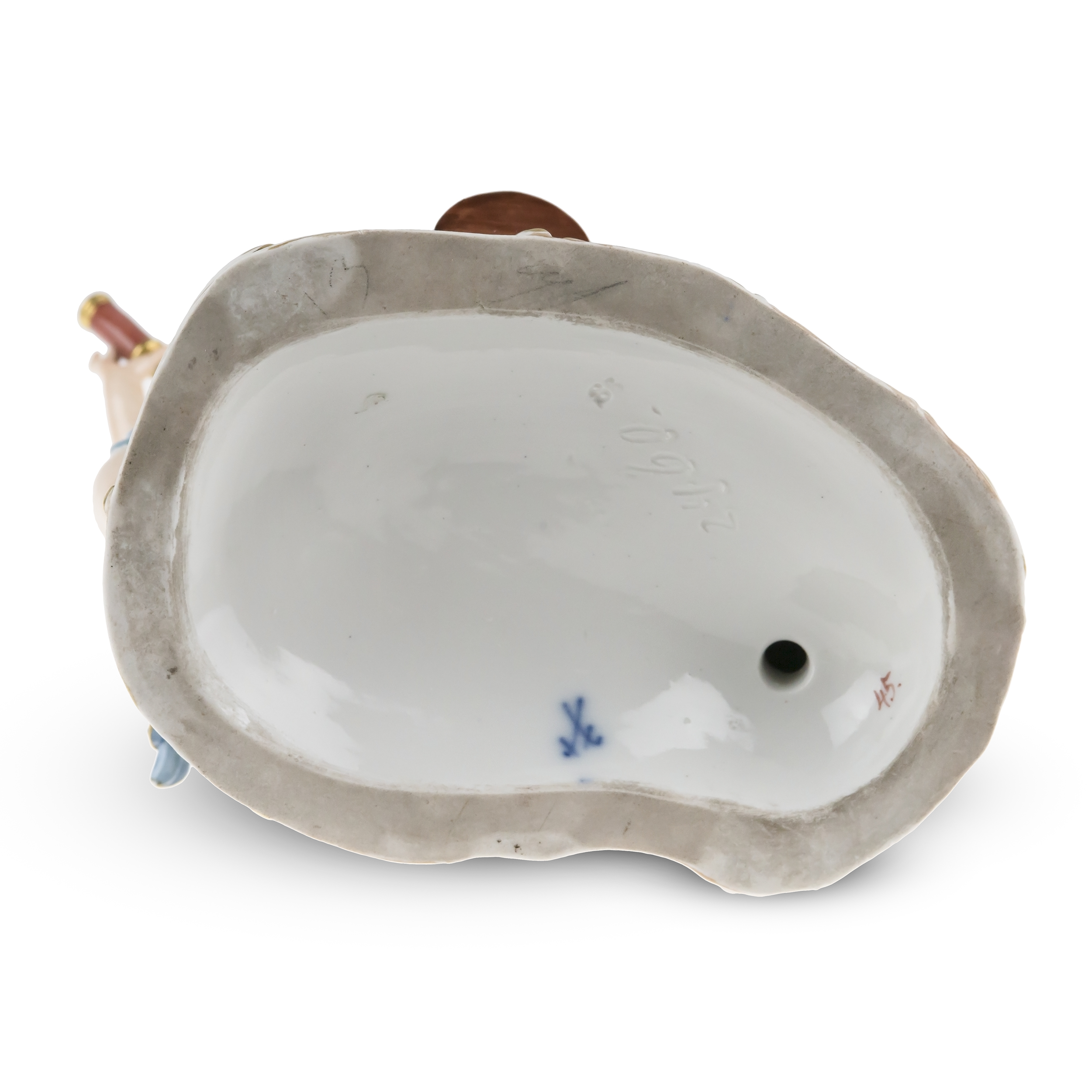 Фарфор, лепка, полихромная надглазурная роспись, золочение; подглазурная марка кобальтом в виде «скрещенных мечей», «83», номер модели «2460» в тесте, «45» от руки надглазурно,