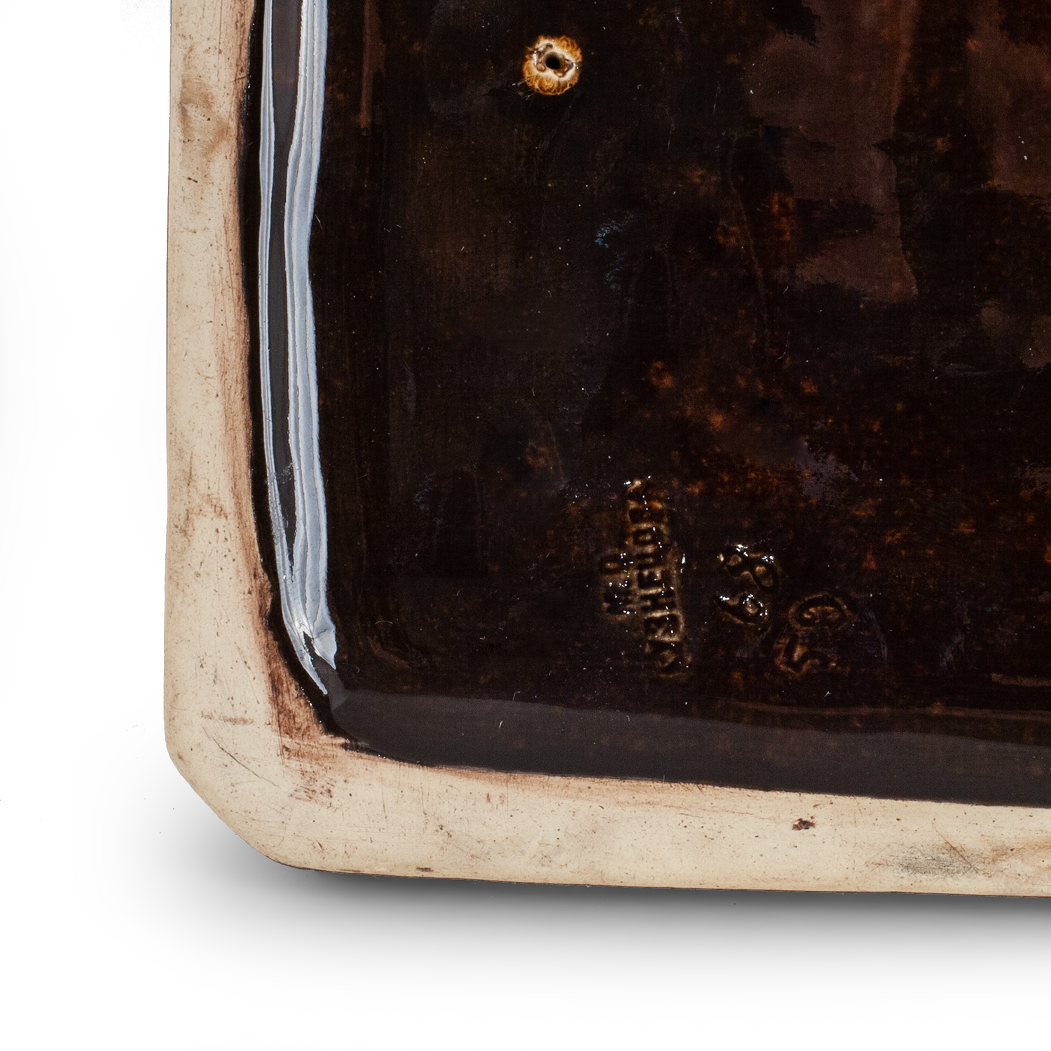 Фаянс, лепка, полихромная подглазурная роспись, клеймо в виде штампа в тесте «М.С. Кузнецова», цифры «68», «59», Тверская фабрика М.С. Кузнецова, 1880-1889 годы, размер (в/д/ш): 12,6 х 16,3 х 14 см
