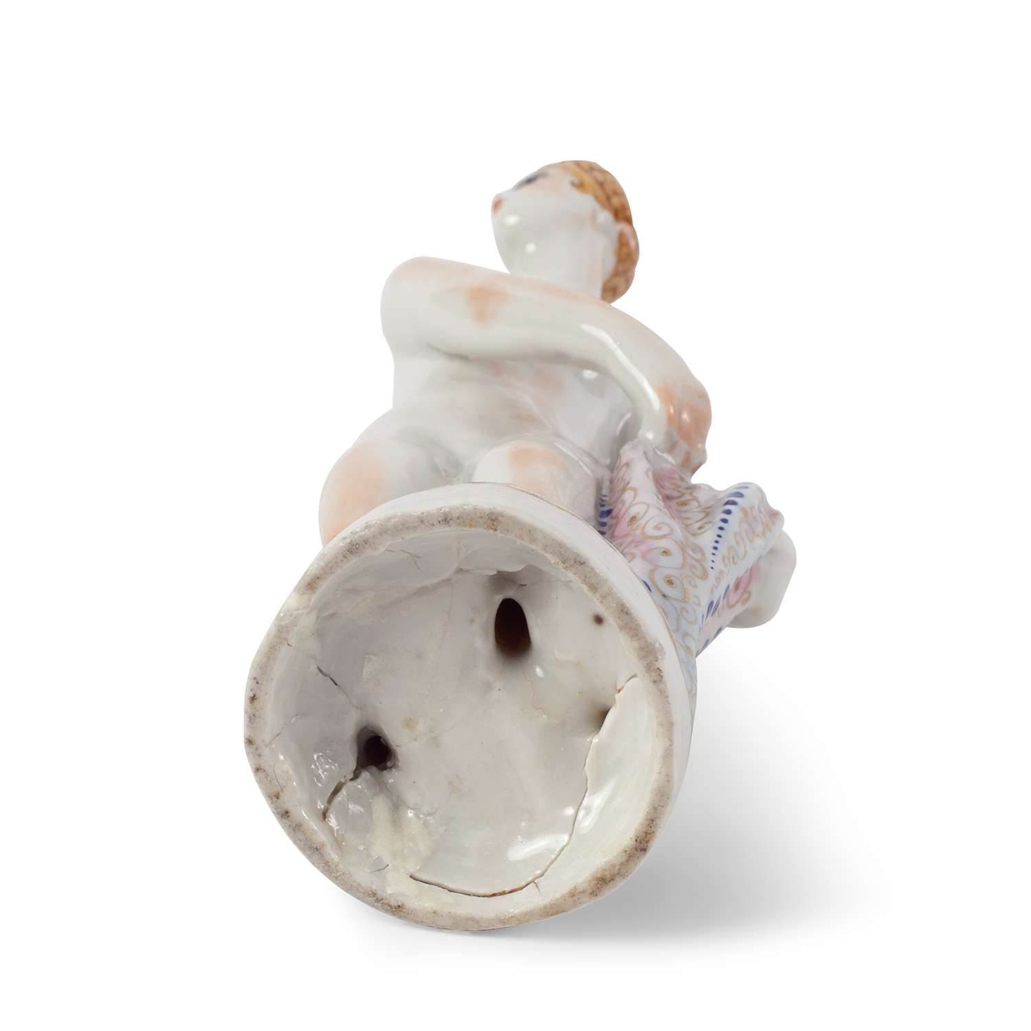 Состояние: Трещины в массе, следы реставрации в области основания, ног, предположительно поздняя раскраска