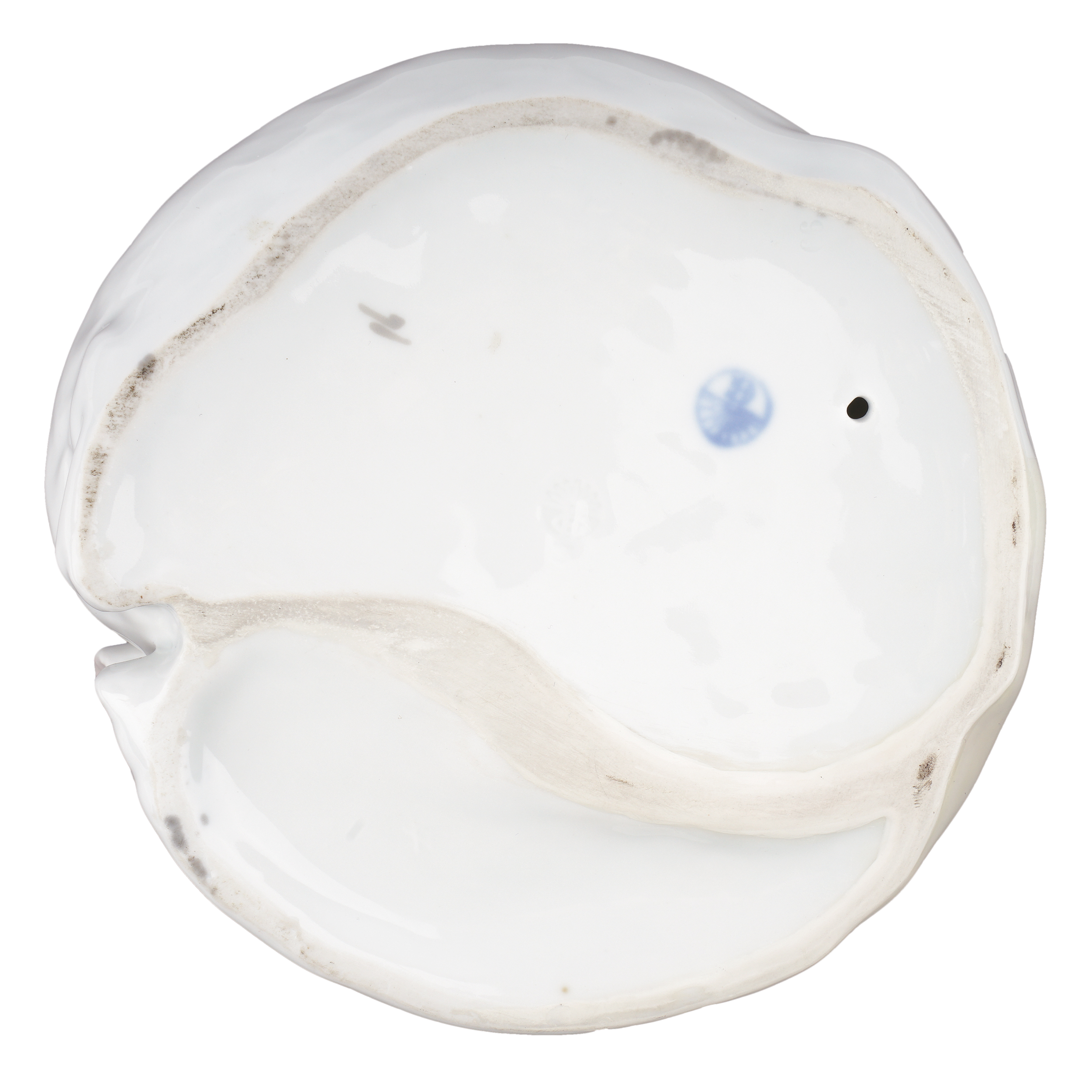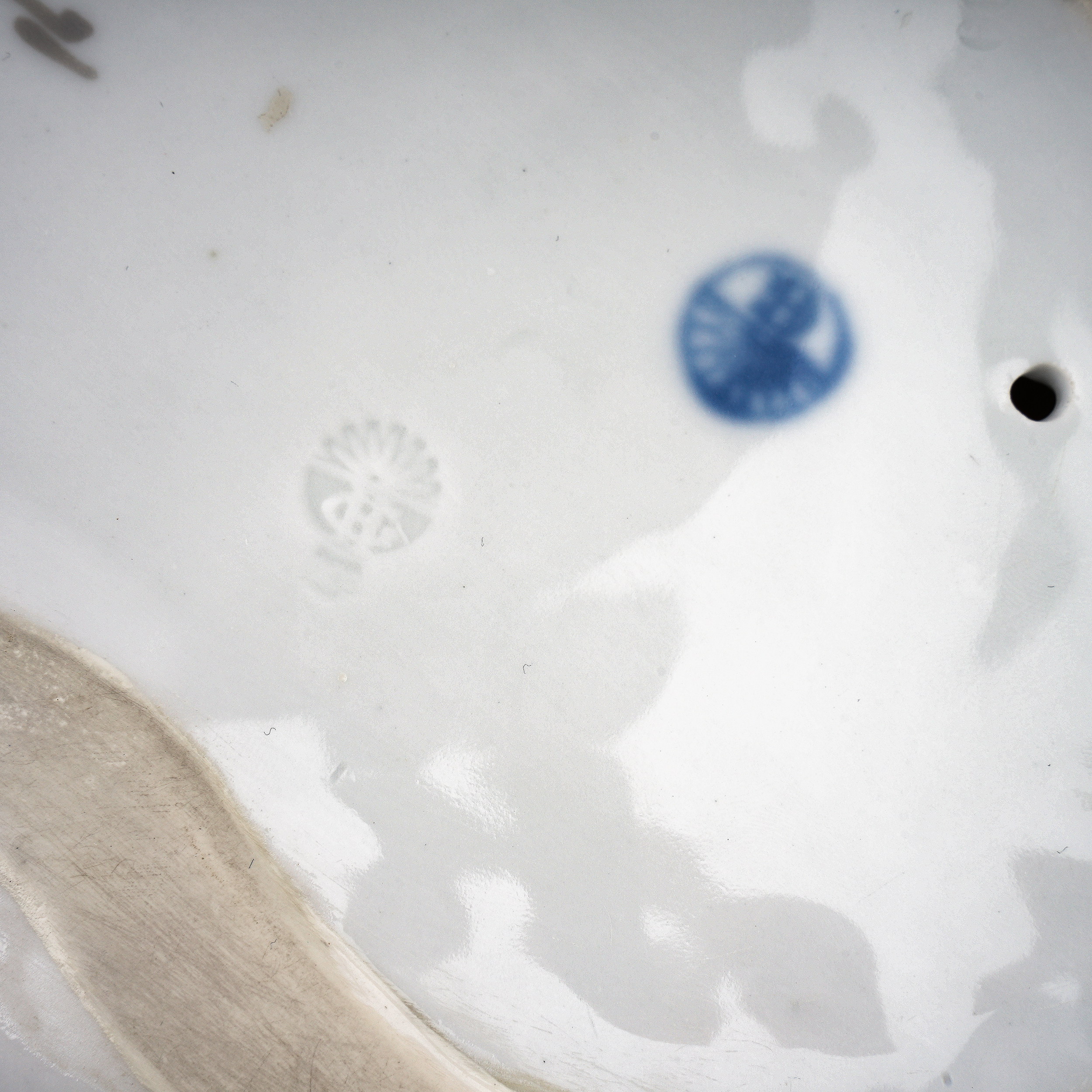 Фигура крупной формы голубой писец. Фарфор, роспись подглазурная, марка: печатная синим подглазурно, клеймо в тесте. Фарфоровая мануфактура братьев Хойбах (Heubach), Германия, начало ХХ века. Размеры: высота: 10 см, длина: 22 см.