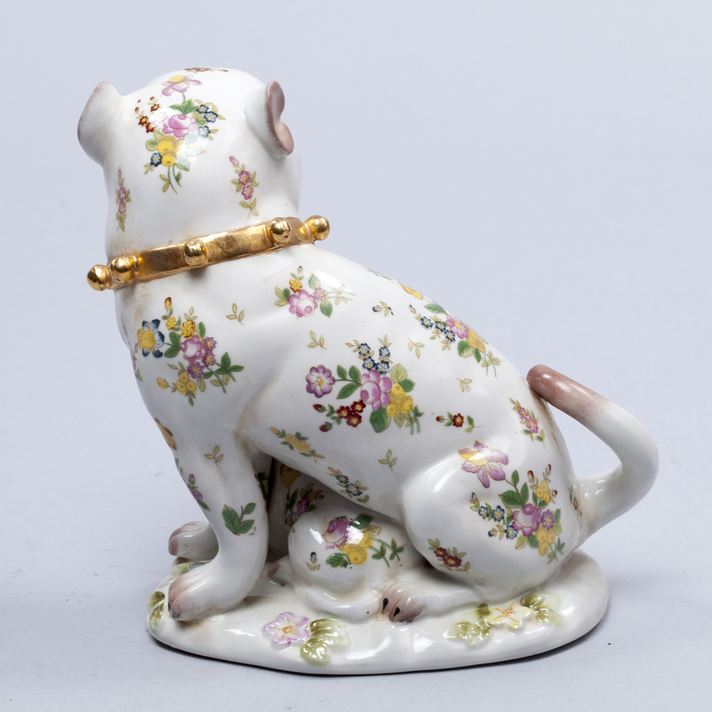 Фарфоровая группа «Мопс со щенком». Фарфор, аэрография, деколь с подрисовкой, золочение, клеймо подглазурное кобальтом в виде скрещенных мечей, Европа, XX век, высота - 19 см