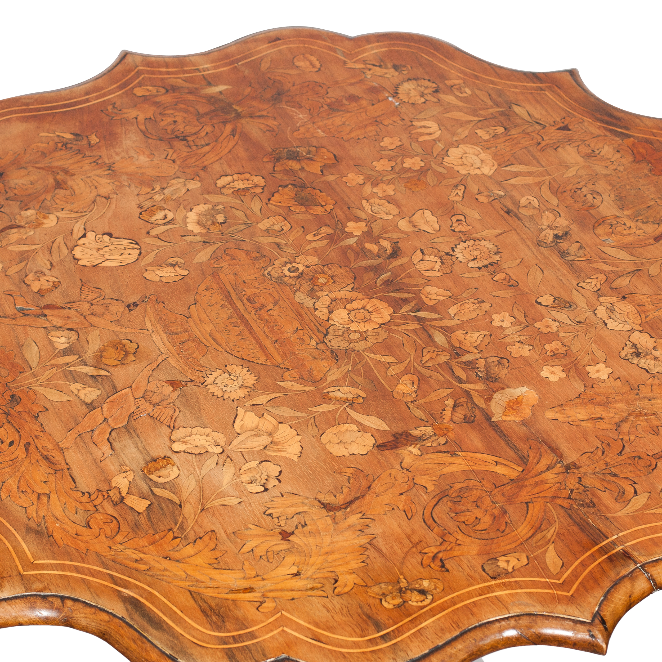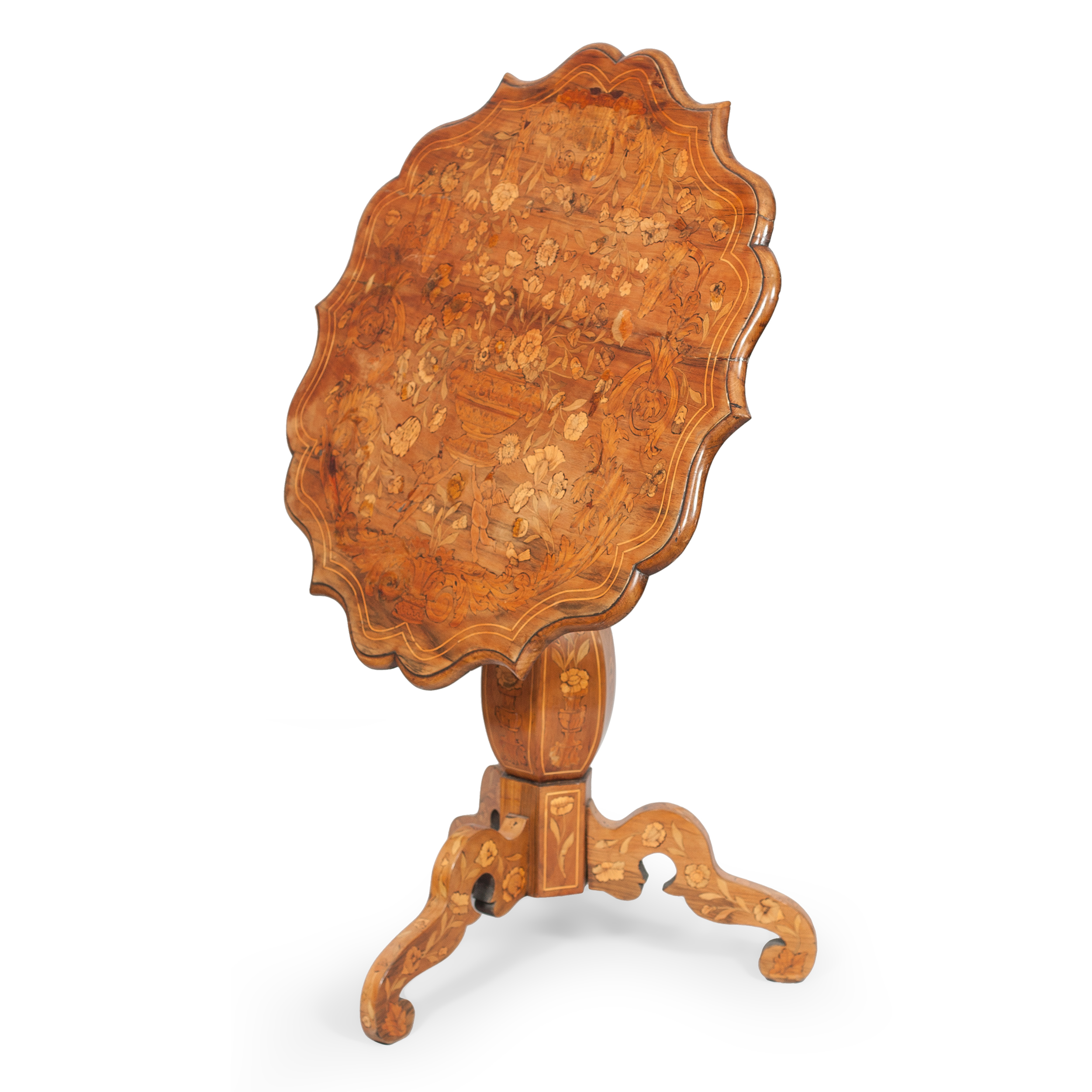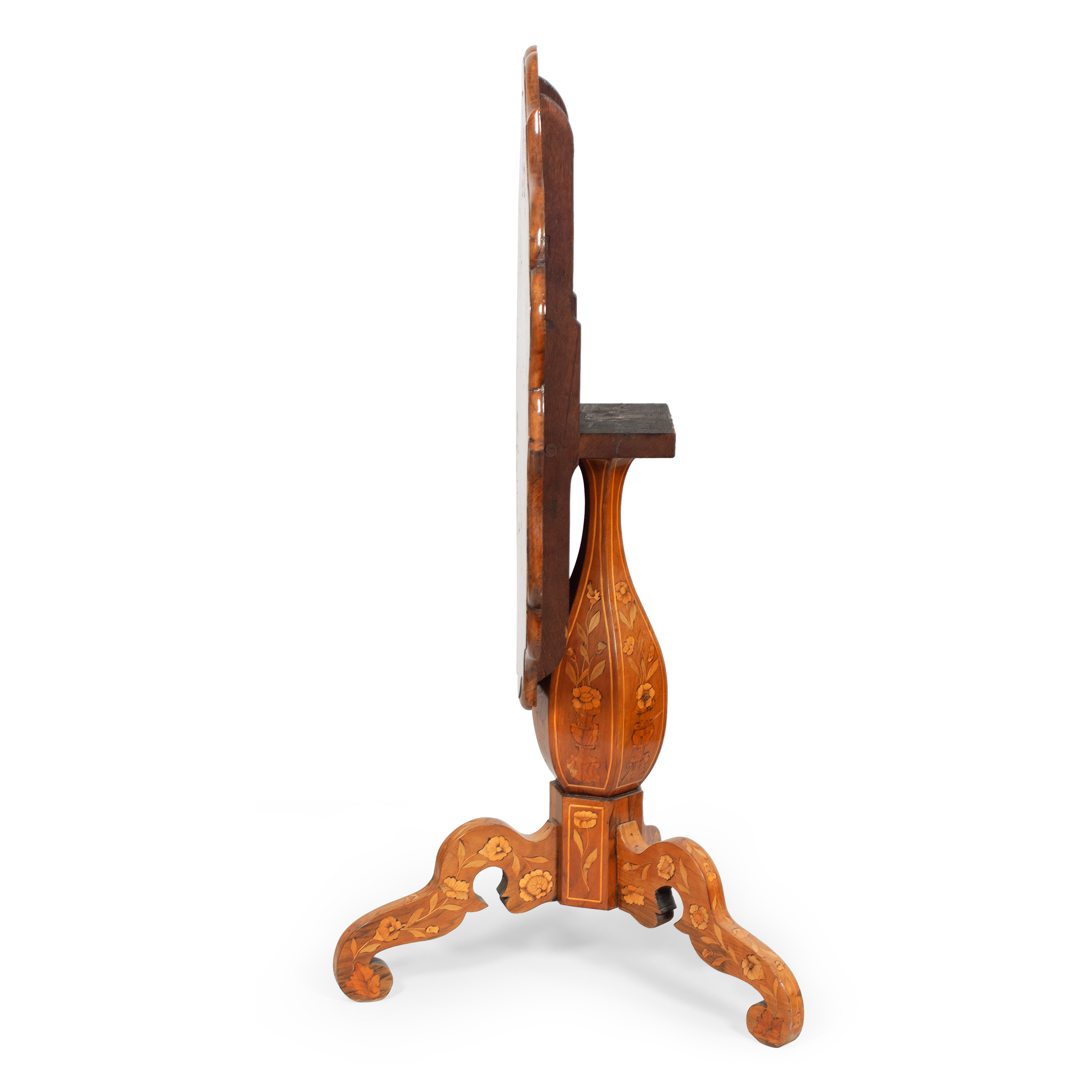 Украшением этого изящного стола выступает замысловатая композиция, выполненная в технике маркетри и помещенная на плоскость столешницы волнистых очертаний. Цветочный мотив, взятый из голландской и фламандской живописи, очень долго сохранял популярность в европейской мебели. Тонкие, флоральные орнаменты и акантовые перевивы обрамляют центральное изображение цветочного букета и античной вазы, украшенной гирляндой-драпировкой. Столешница покоится на балясине-колонне, которая переходит в основание треножник, также украшенные в технике маркетри.