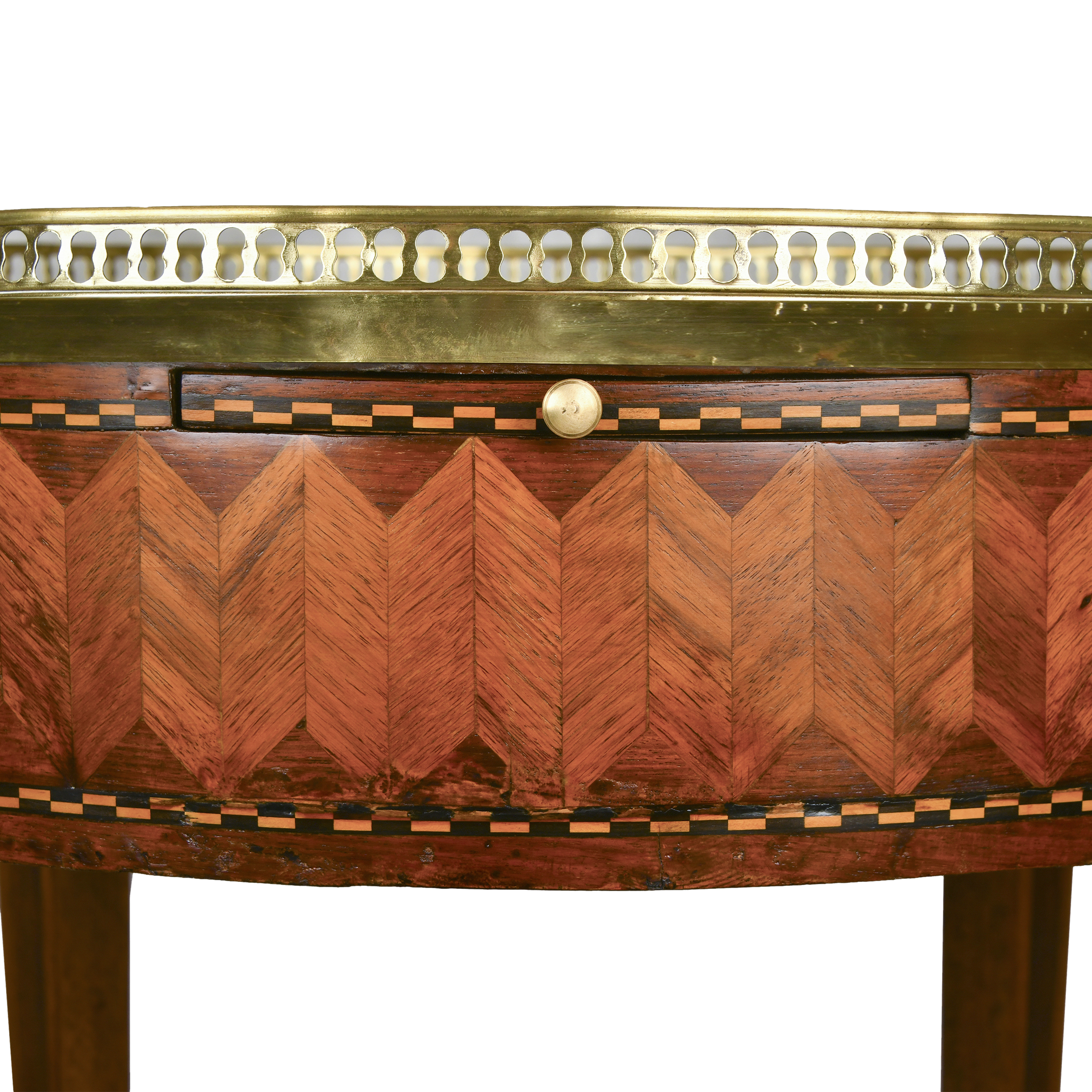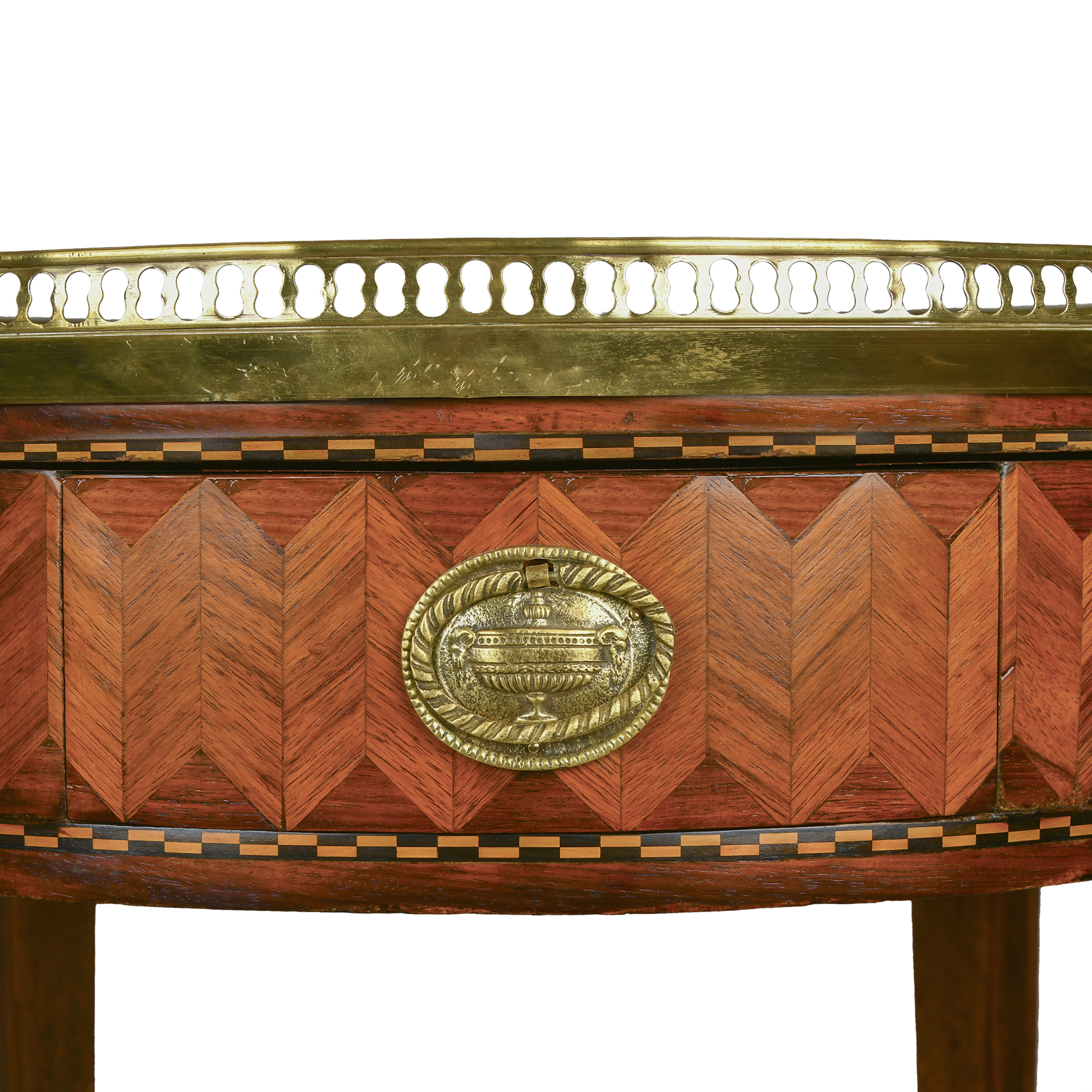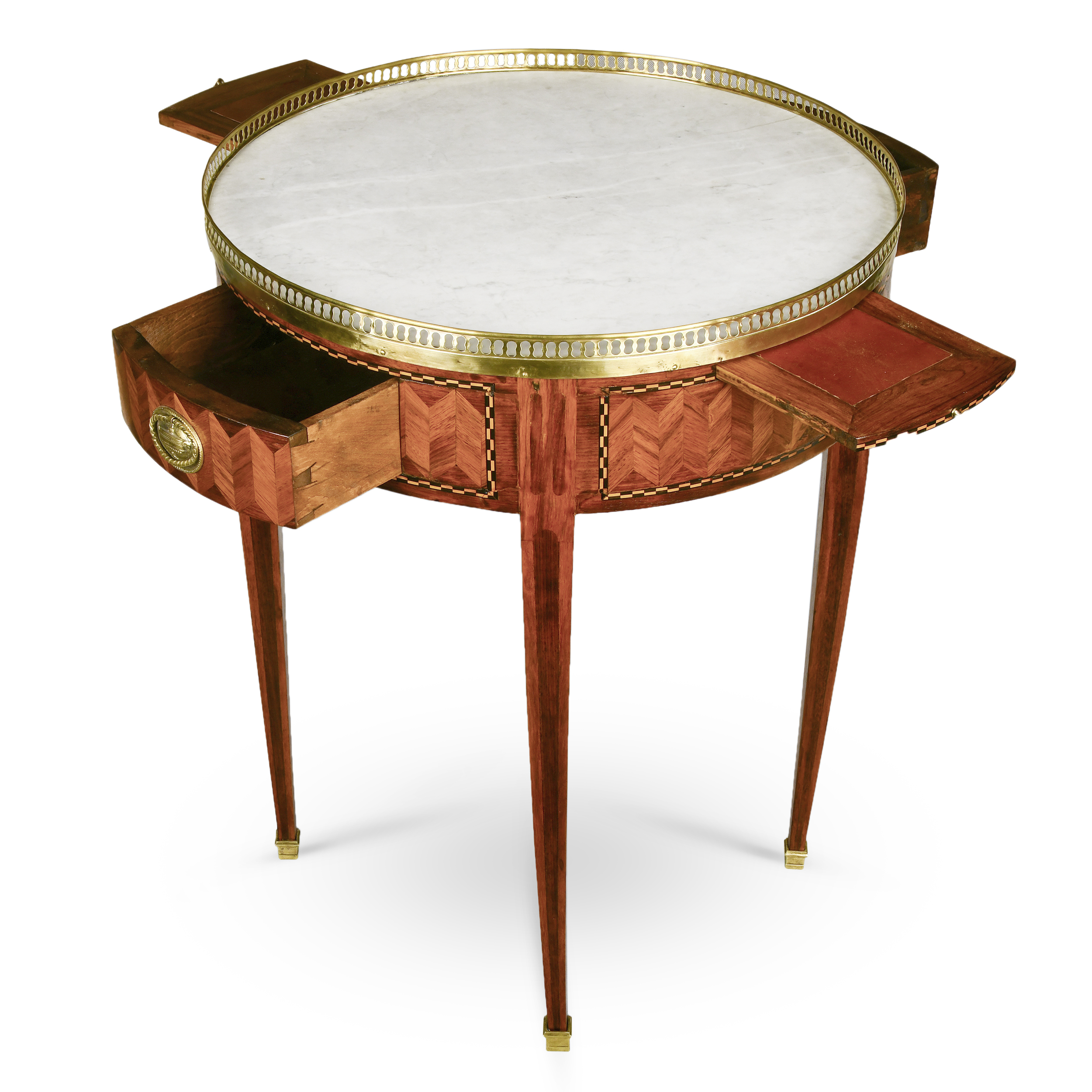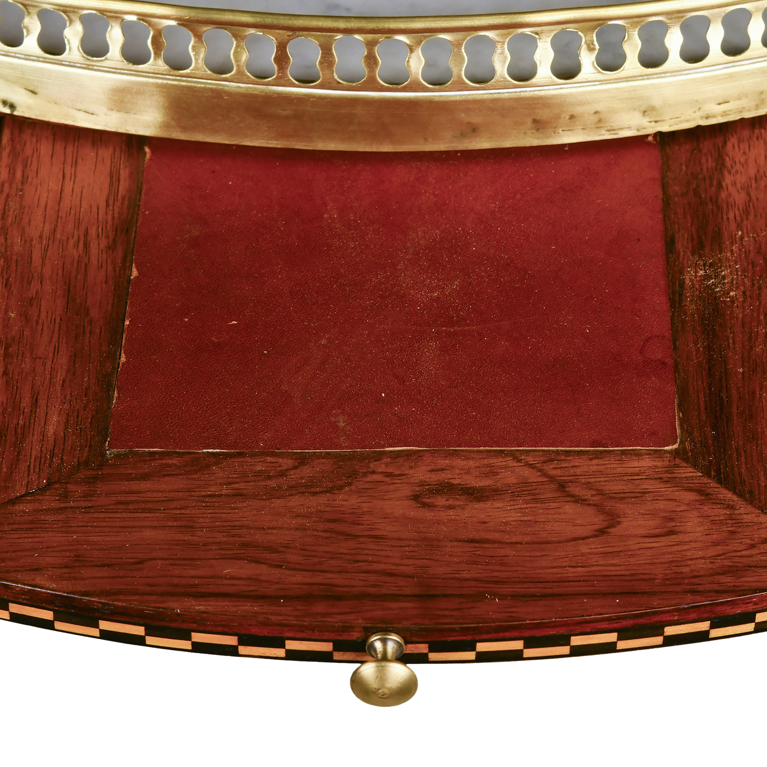 Дуб (основа), фанерование палисандром (красным деревом), паркетри, латунная фурнитура, мраморная столешница. Франция, конец XVIII века, размеры: высота 79 см, диаметр 60 см