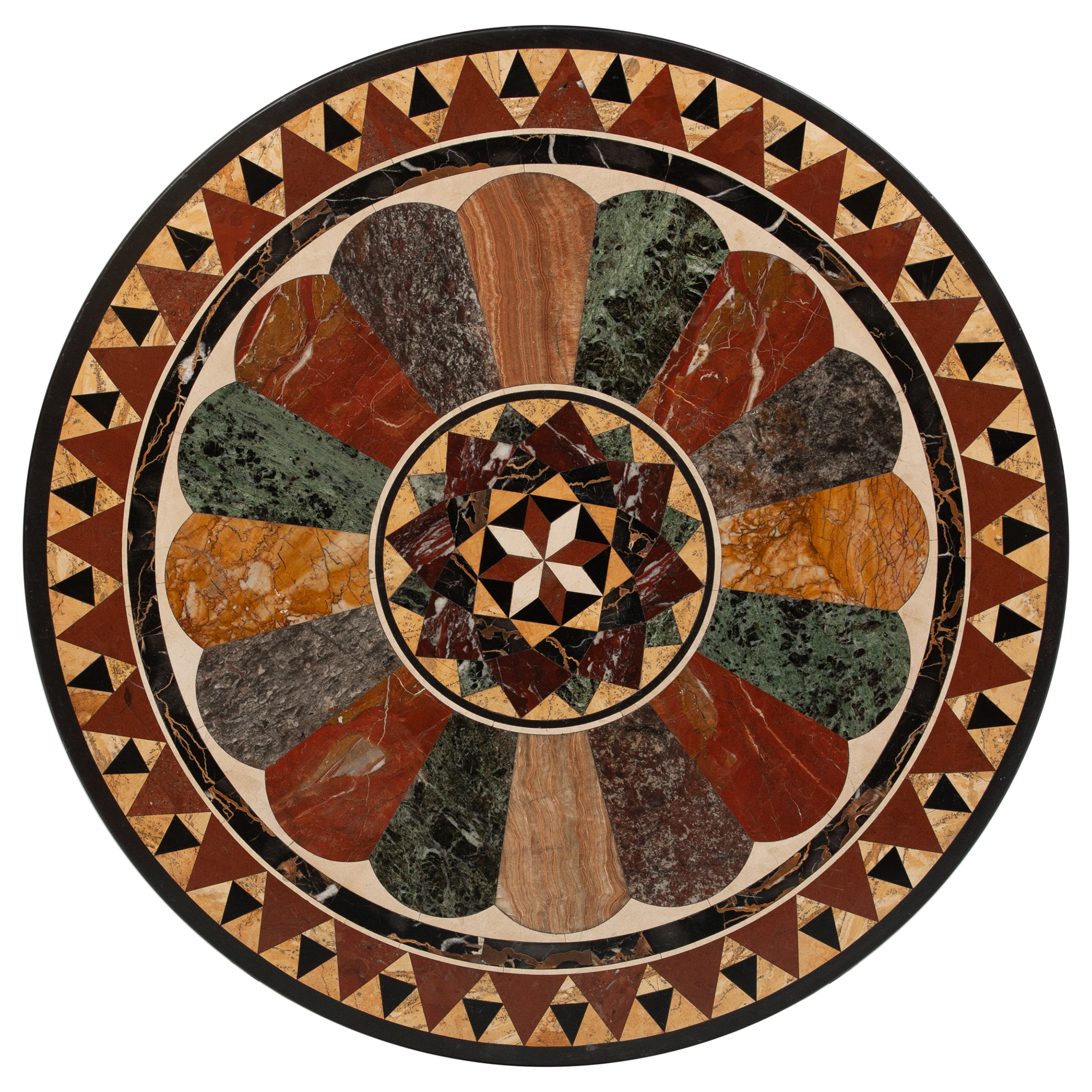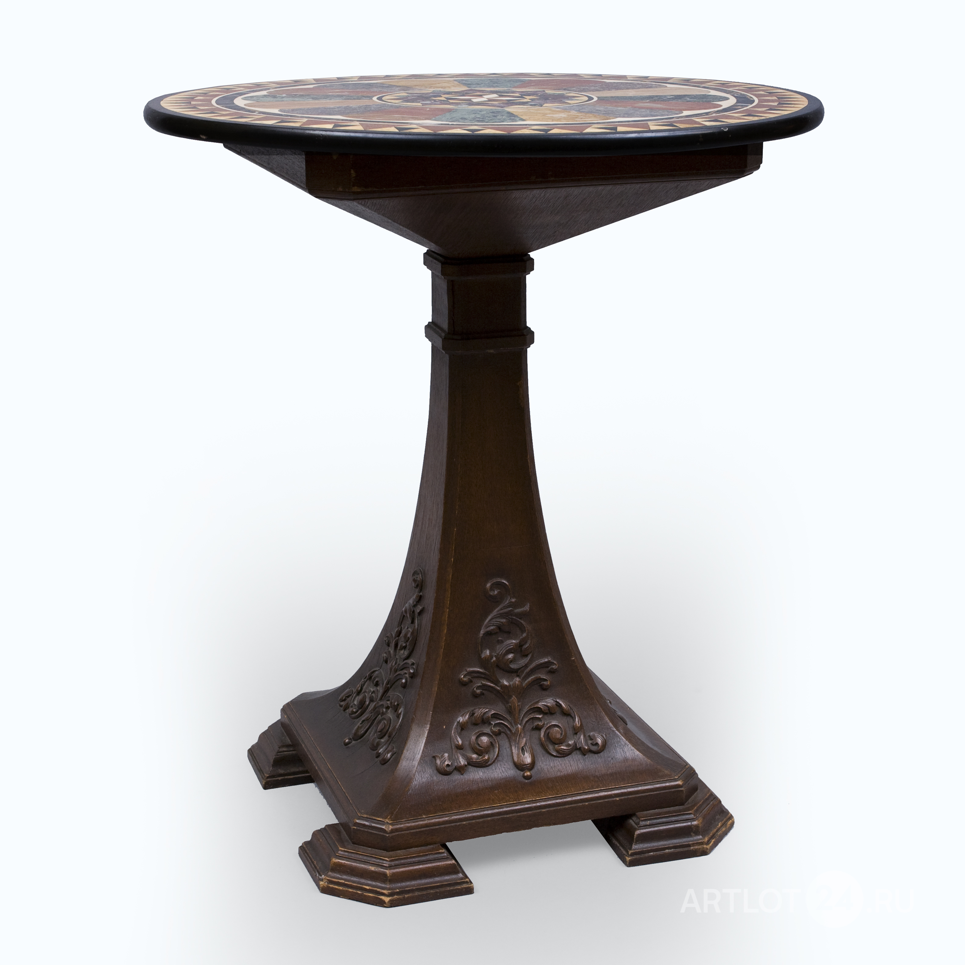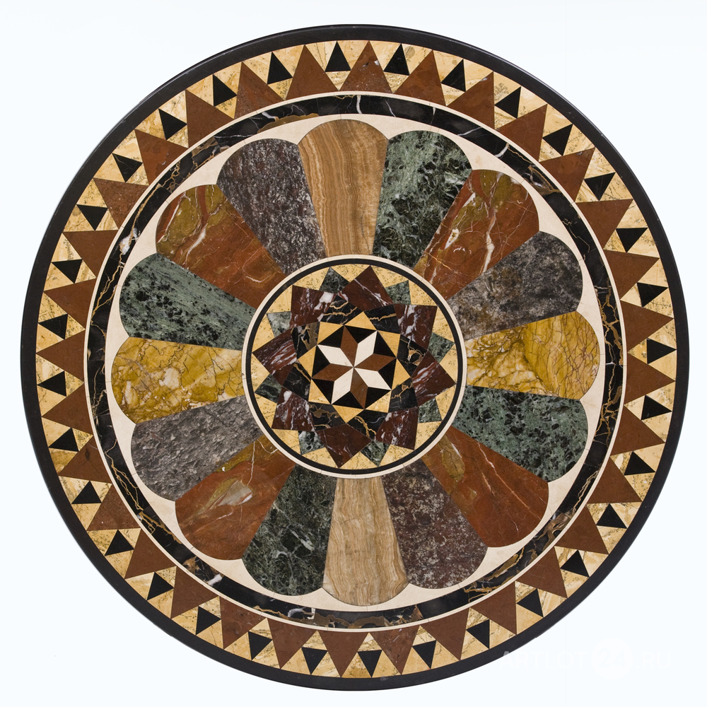Столешница – флорентийская мозаика («pietra dura» итал. «поделочный камень»), подстолье – орех, массив, резьба.