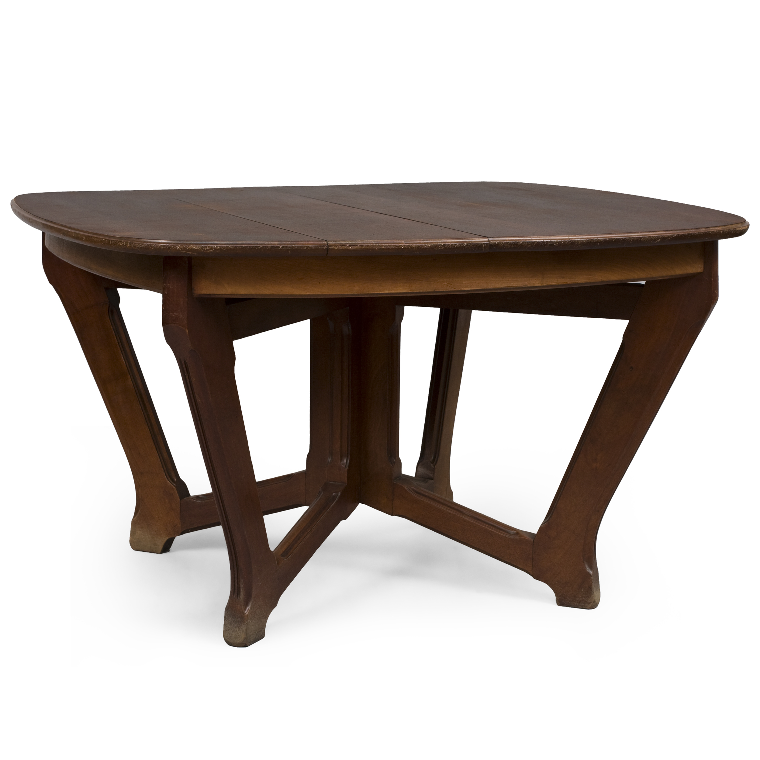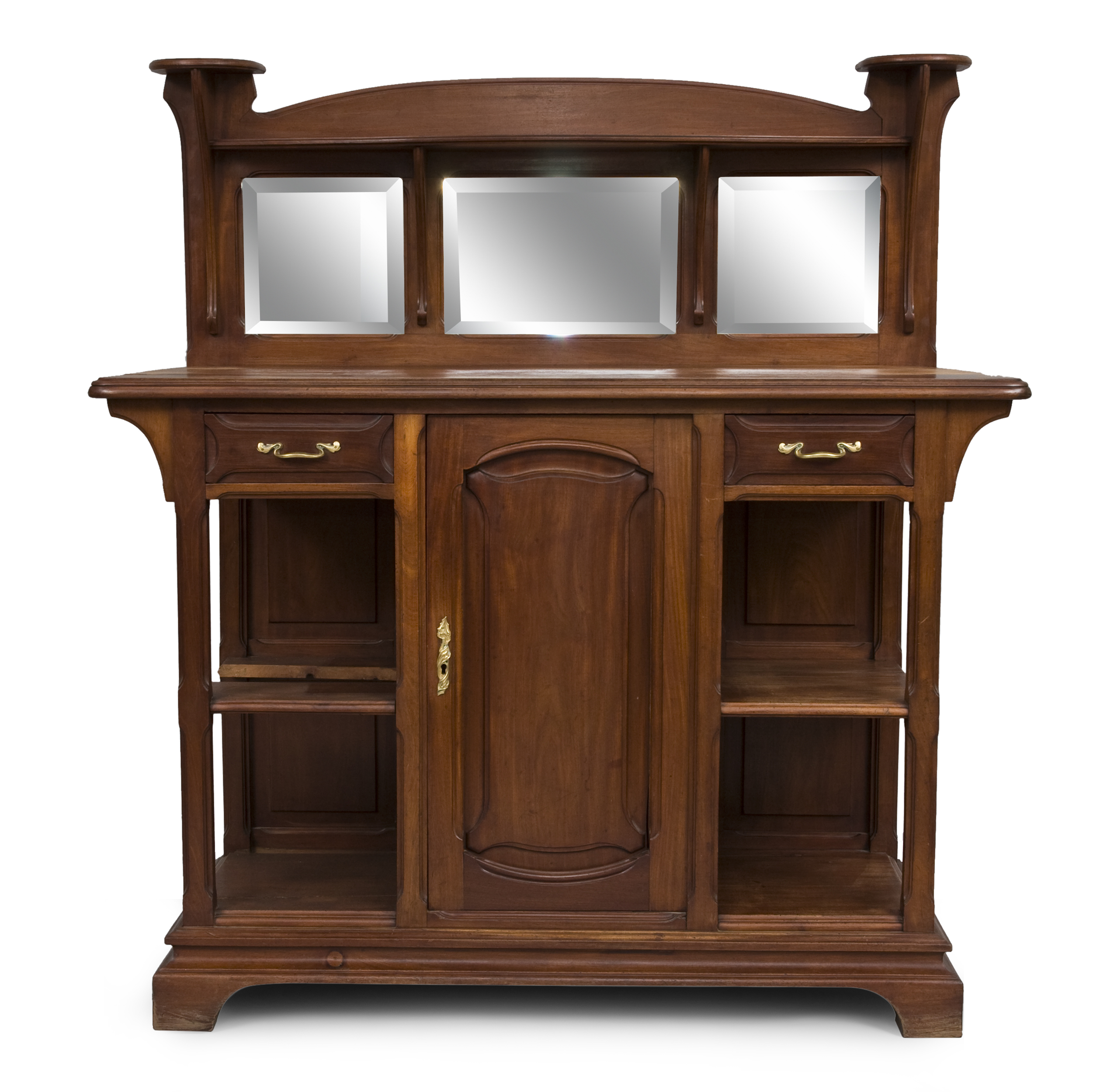 Полубуфет, стол и шесть стульев. Орех, массив, кожа, зеркала с фацетом, Франция, начало ХХ века, размеры (в/ш/г): полубуфет - 144 х 133 х 45 см,