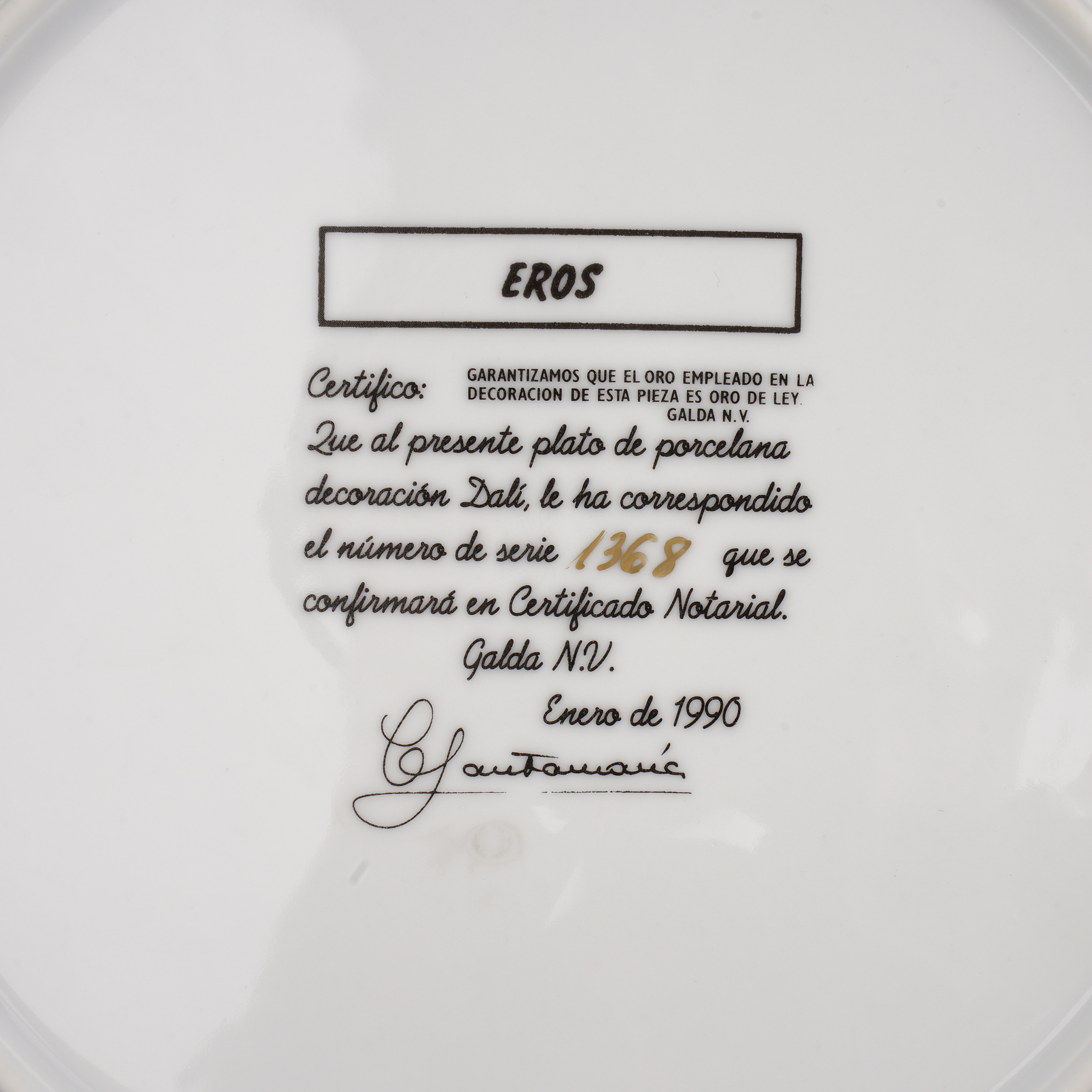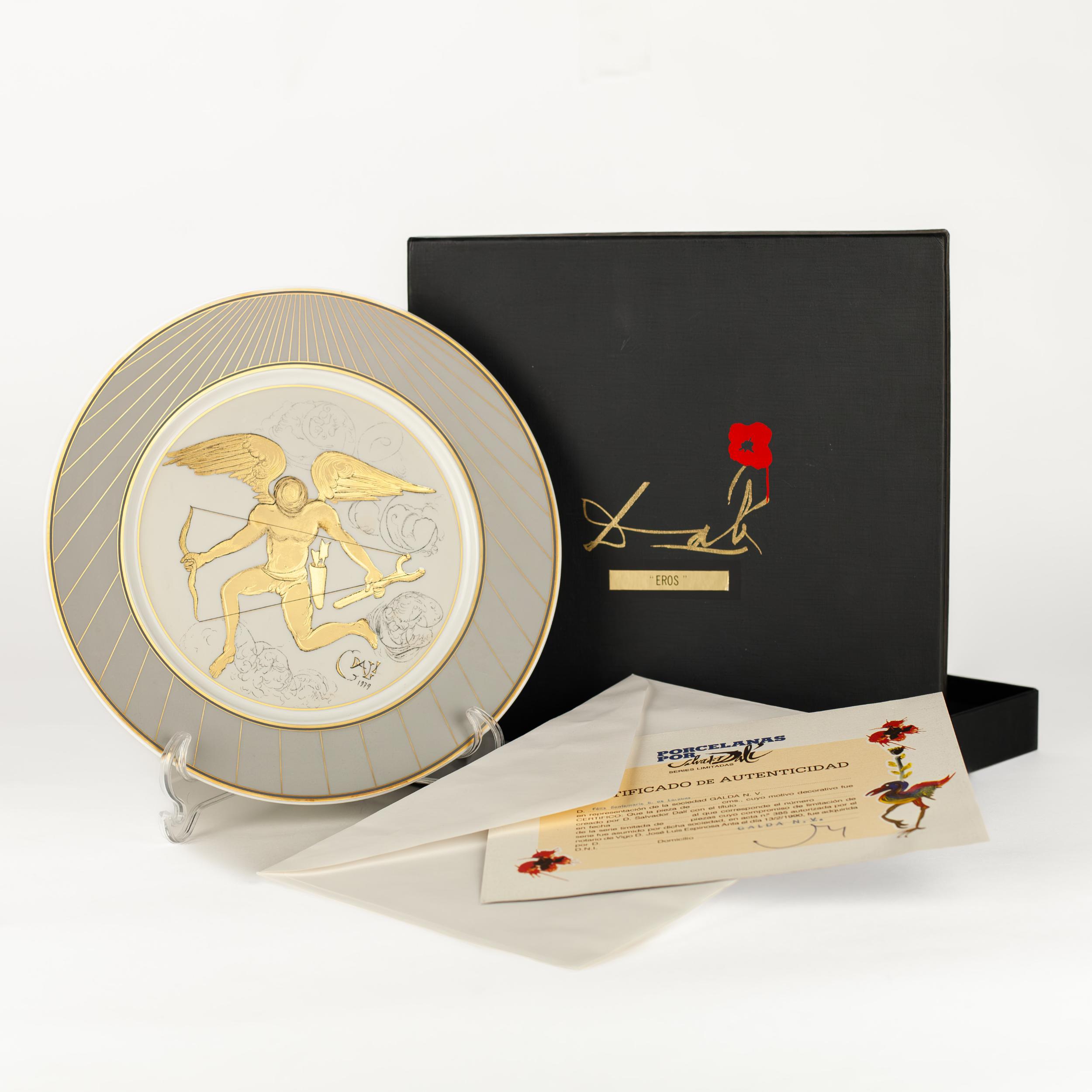 Фарфор, сериграфия, золочение, №1368 золотом на оборотной стороне, фирма «Dalí Porcelanas Galda N.V.», диаметр – 25 см. В родном картонном футляре с сертификатом подлинности.