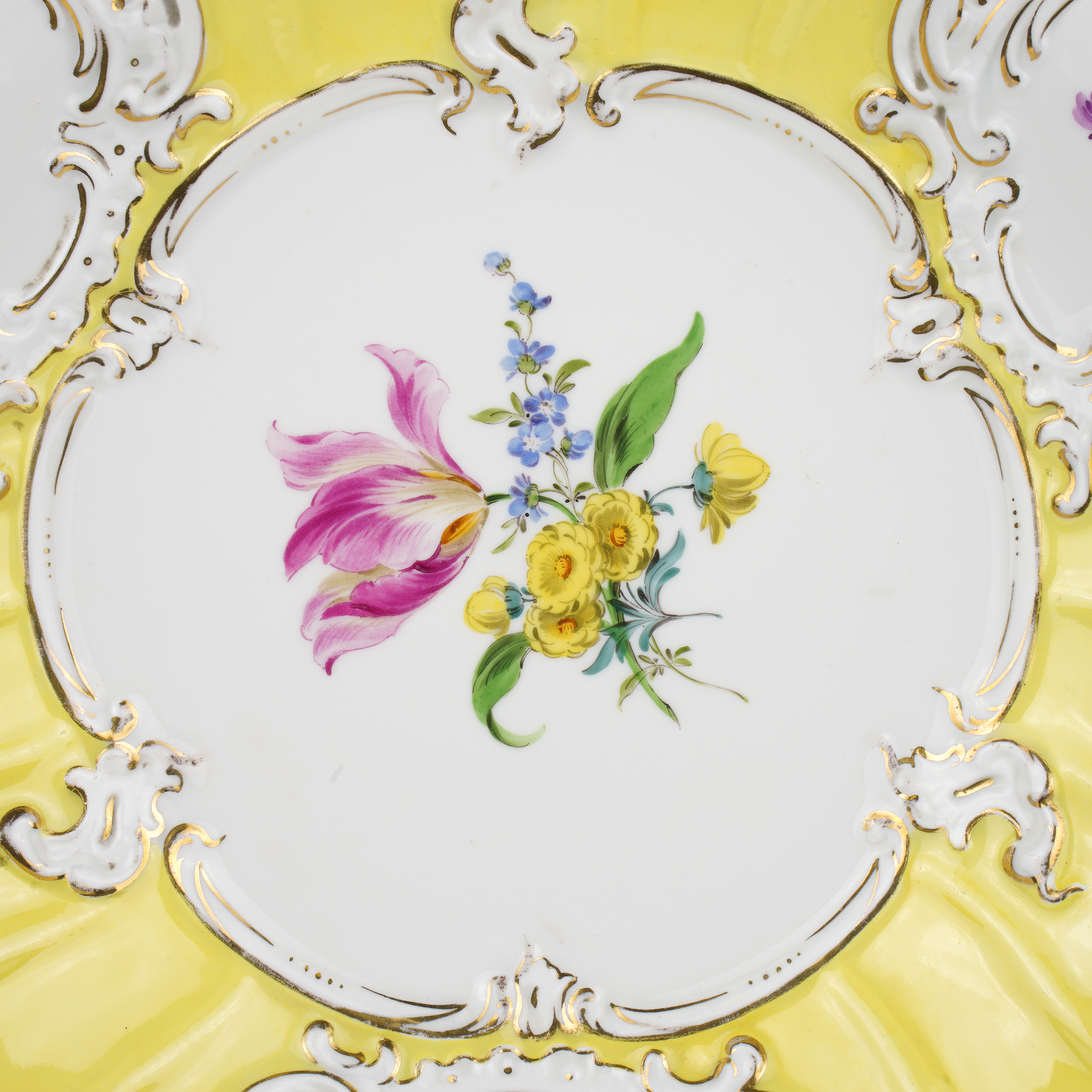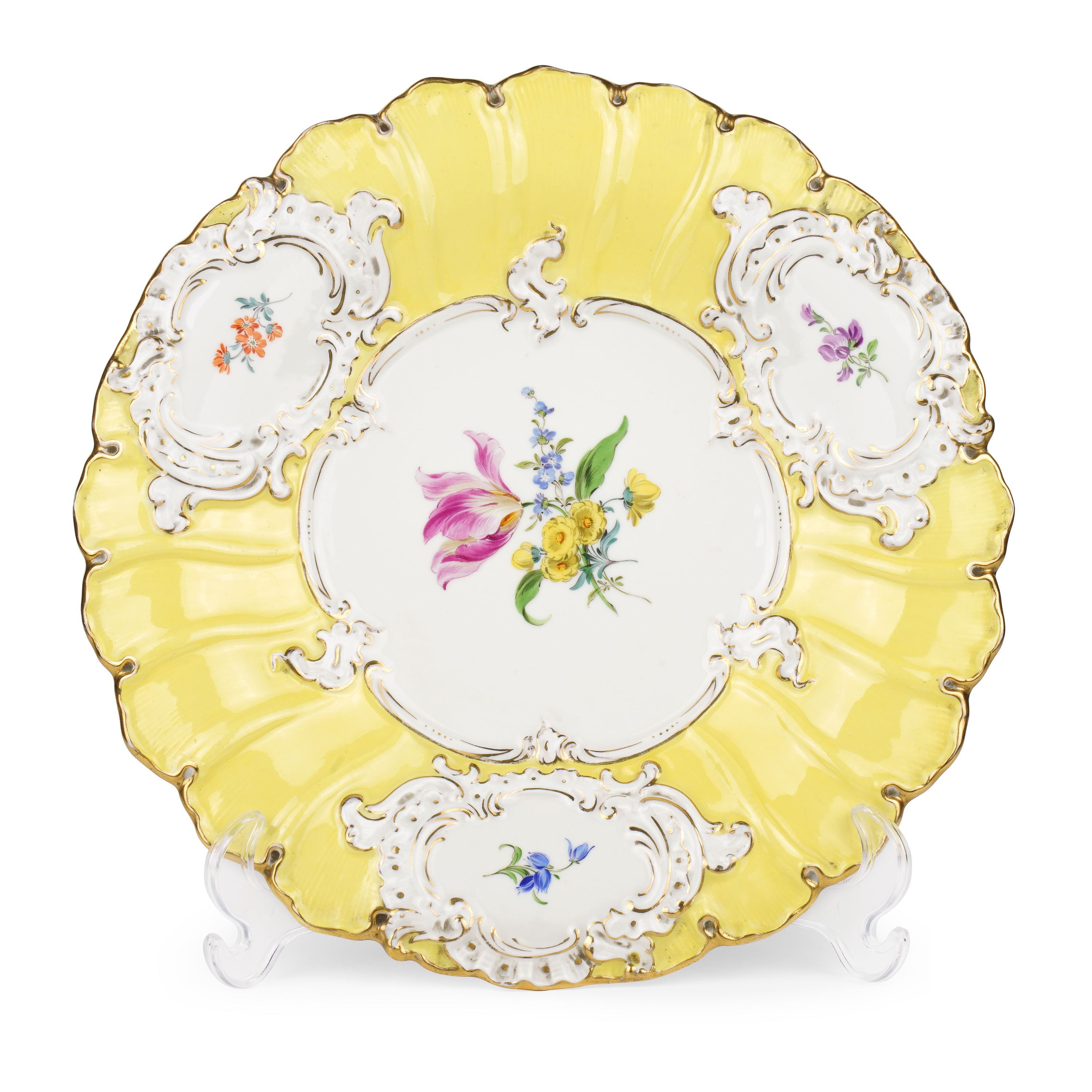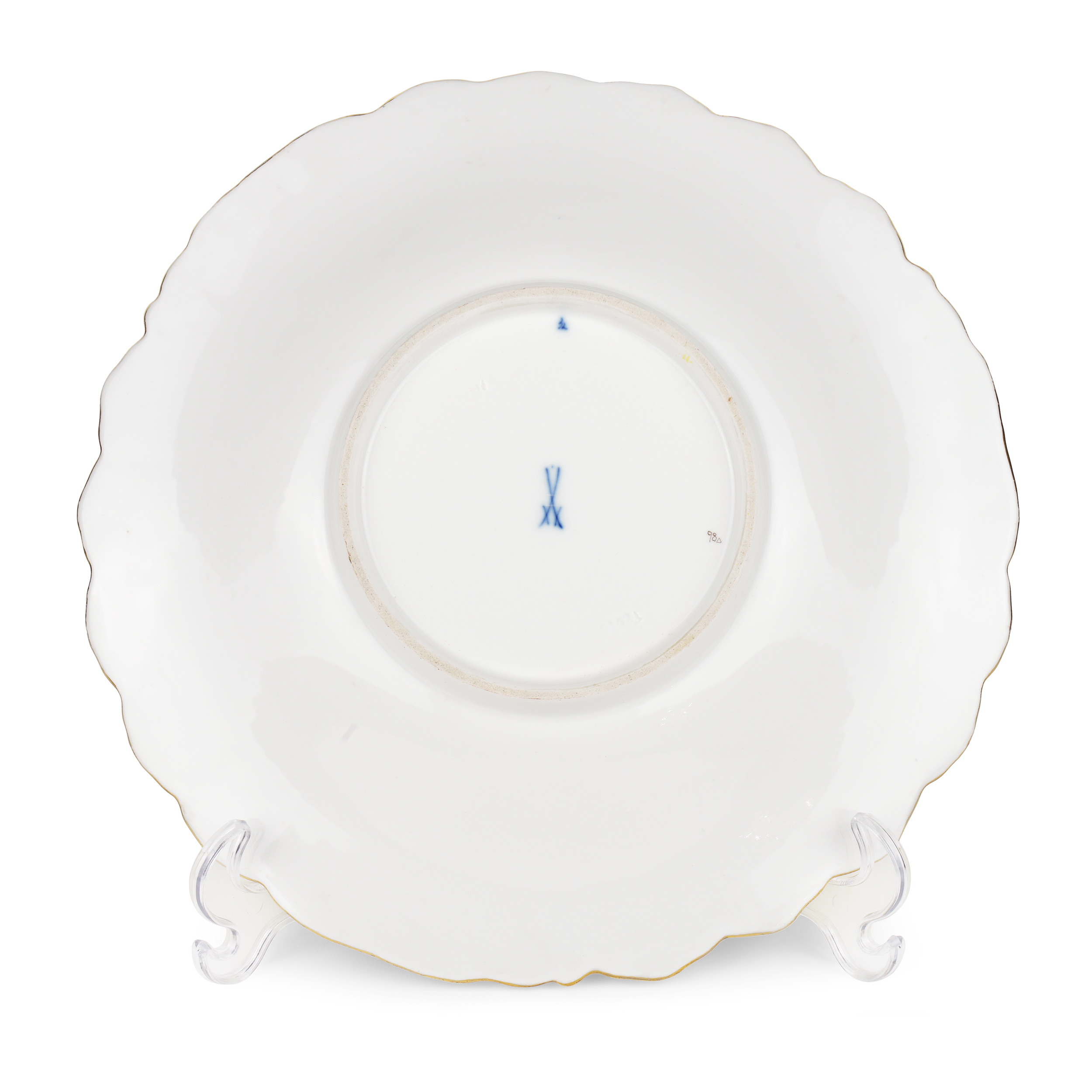 Фарфор, рельеф, монохромное лимонное крытье, полихромная надглазурная роспись, золочение; марка подглазурная кобальтом в виде скрещенных мечей (перечеркнуто дважды), «32» подглазурно кобальтом, а также метки в тесте «F152А», «158», от руки «98Δ»,