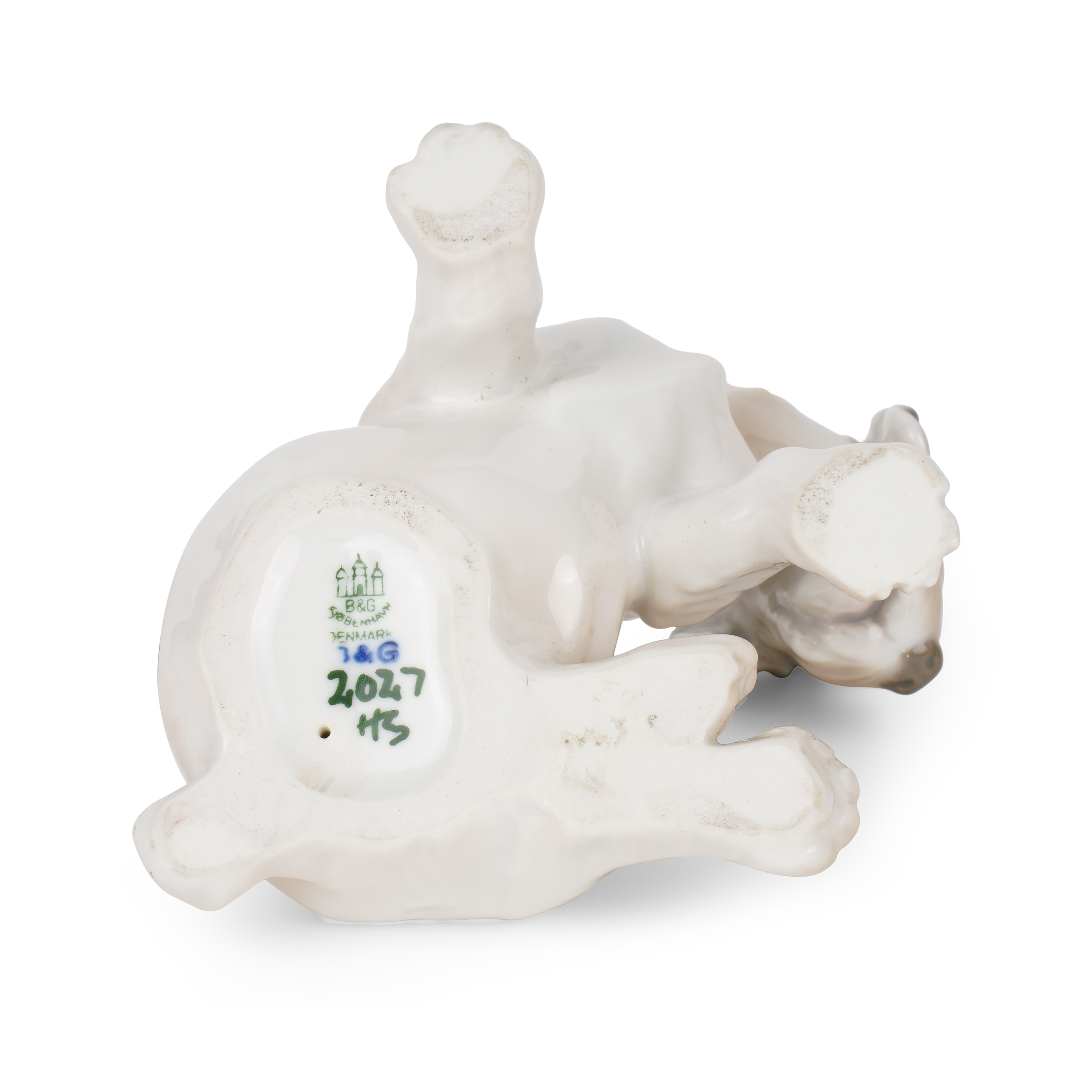 Фарфор, полихромная подглазурная роспись, подглазурная марка кобальтом «B&G», хромом «B&G kjobenhavn DENMARK», номер модели «2027», «HS» фабрики «Bing&Grondahl», размер (в/д/ш): 10 х 13,5 х 10 см.
