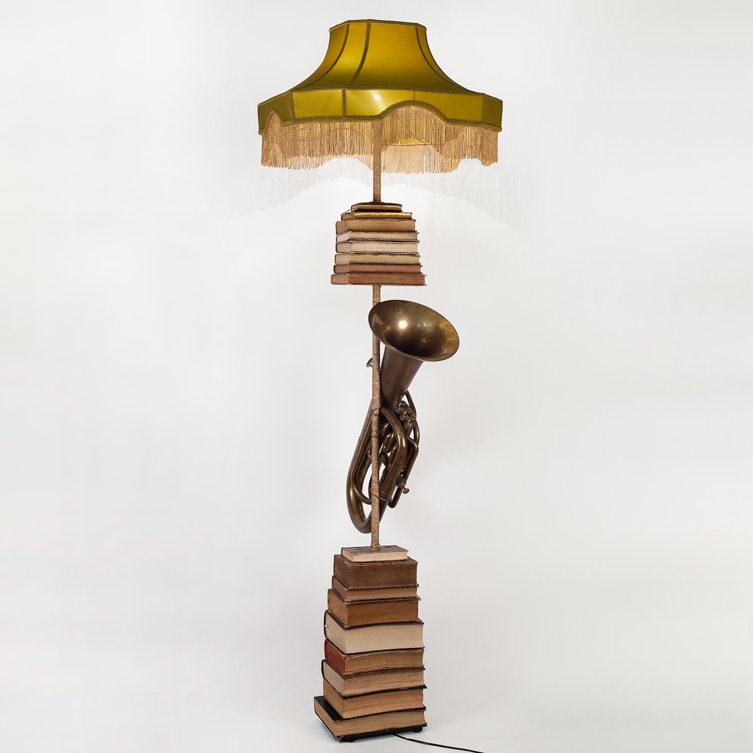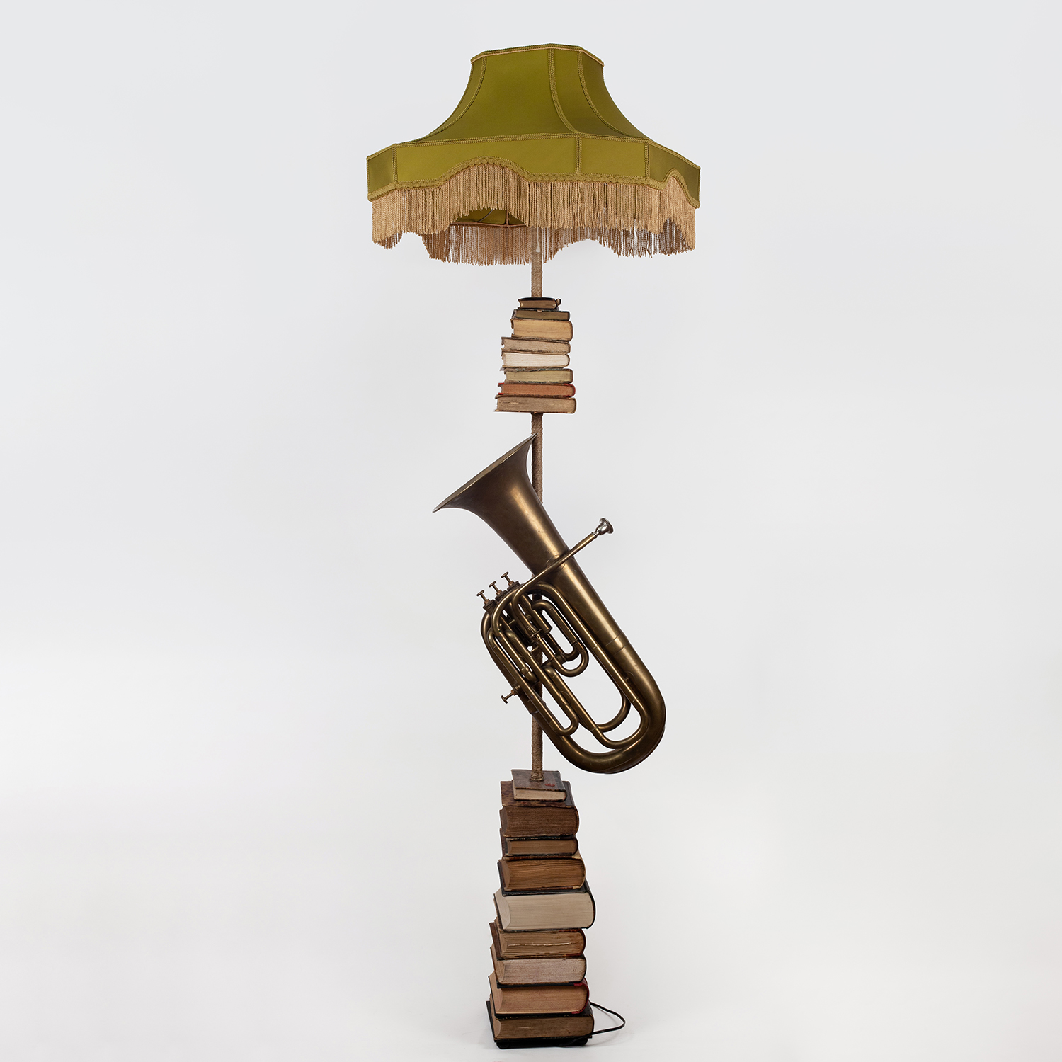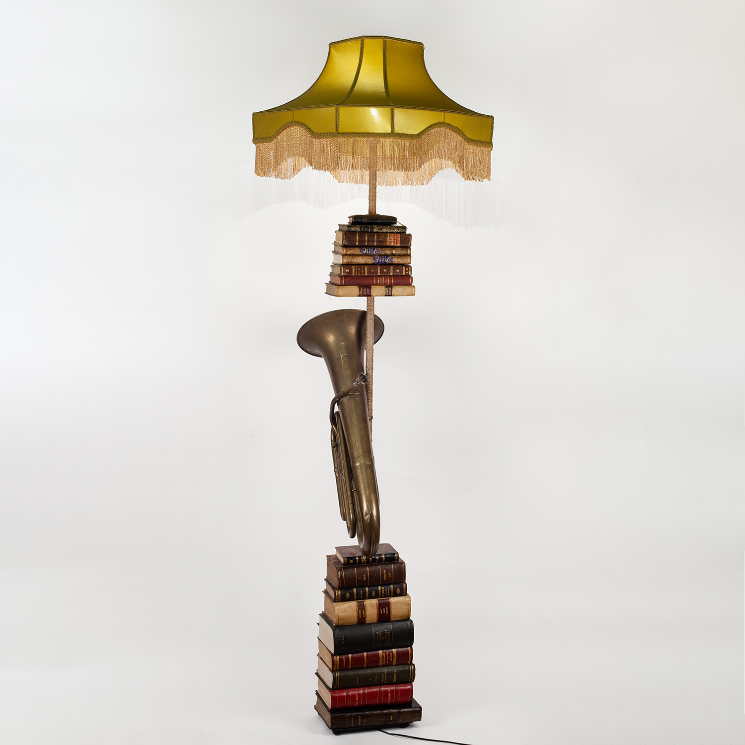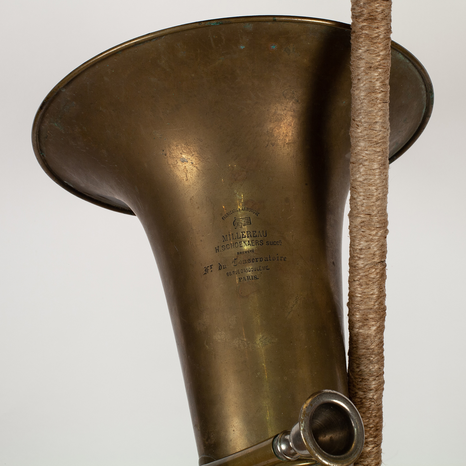 Выполнен в виде тенорной тубы (эуфониума) и стопок старинных книг. Медный сплав, папье-маше, бумага, коленкоровые переплеты с золотым тиснением по корешку; на корпусе духового инструмента штамп «FABRICATION ARTISTIQUE», «MILLEREAU H. SCHOENAERS succR, Brevete` du Conservatoire, 66 Rue D`angoule`me, PARIS», художественное производство Франсуа Миллеро, Франция, конец XIX – начало XX века, высота - 200 см, основание - 28 х 20 см, современный абажур – 60 х 60 см