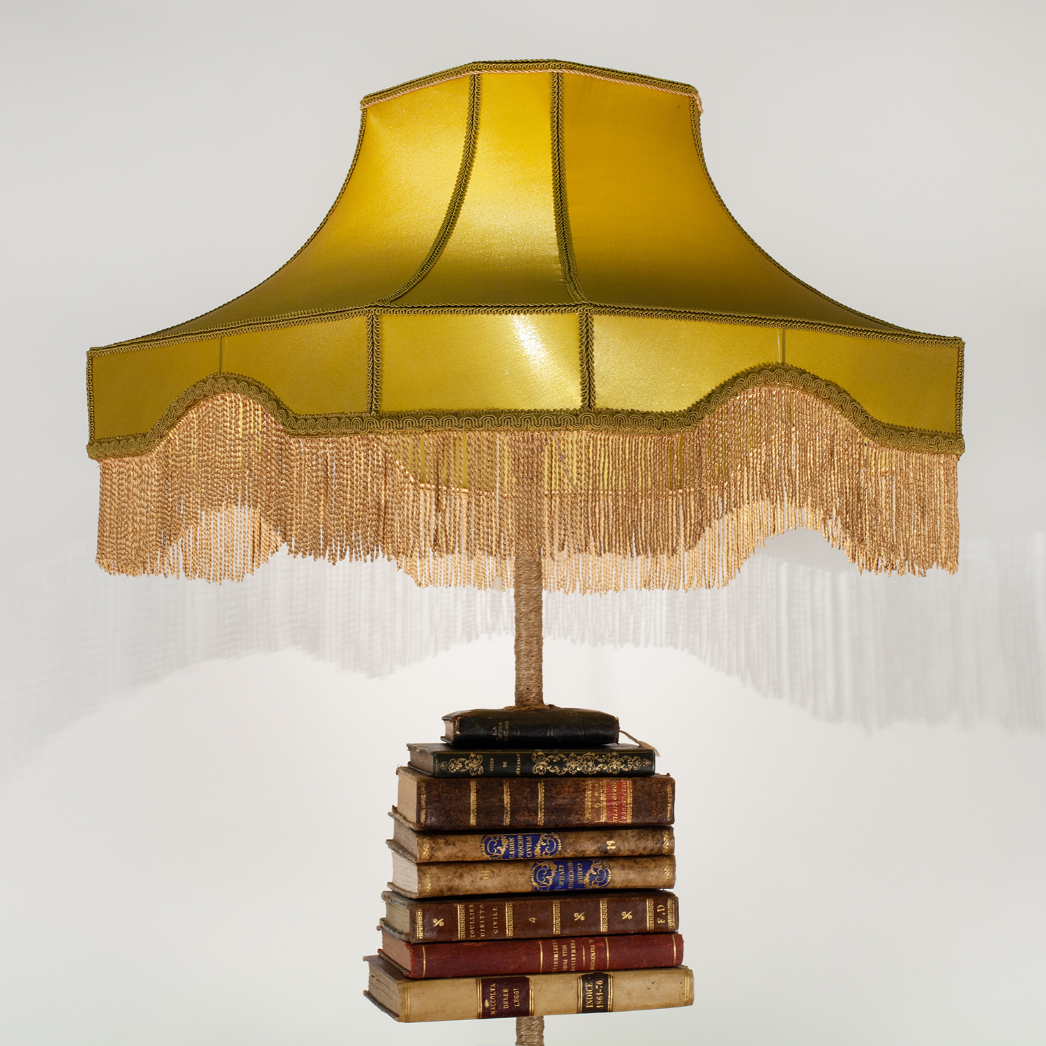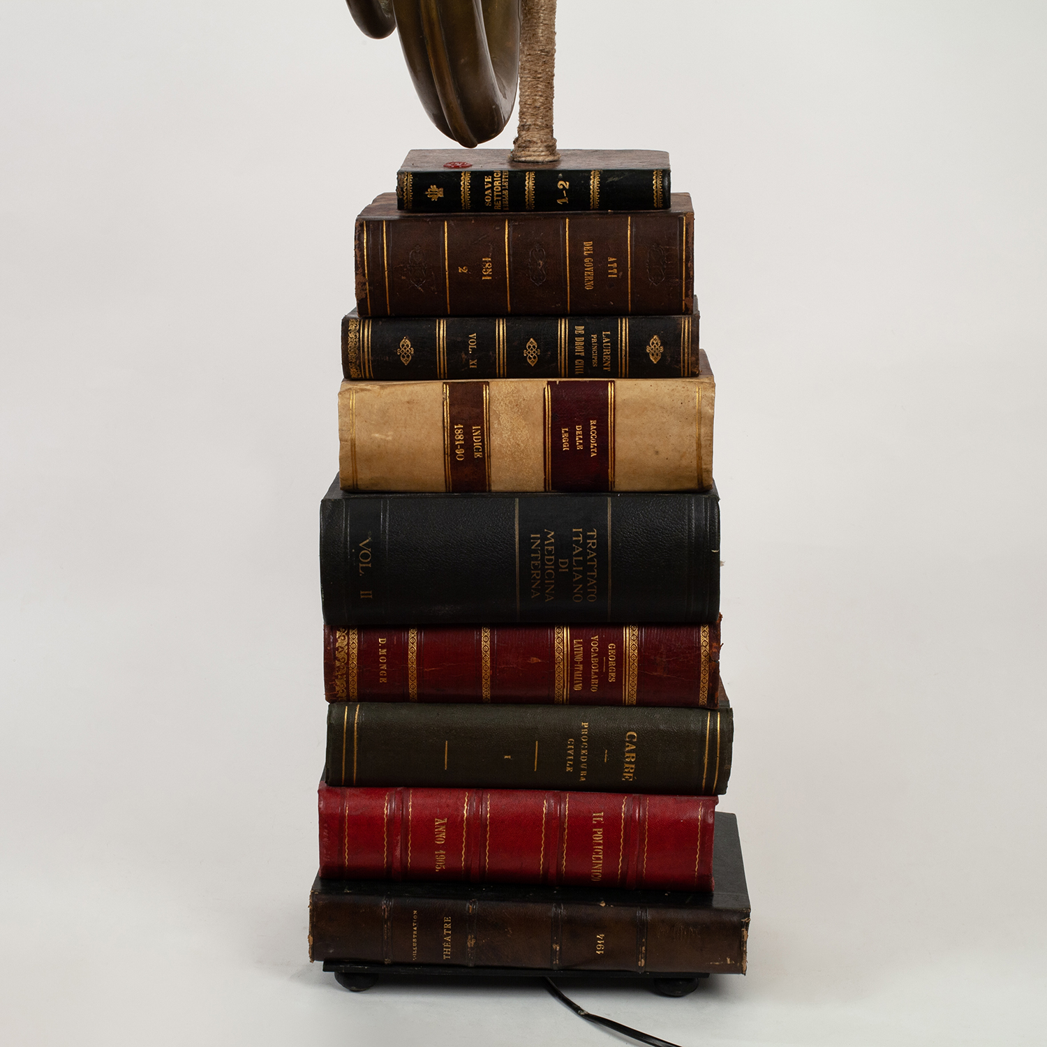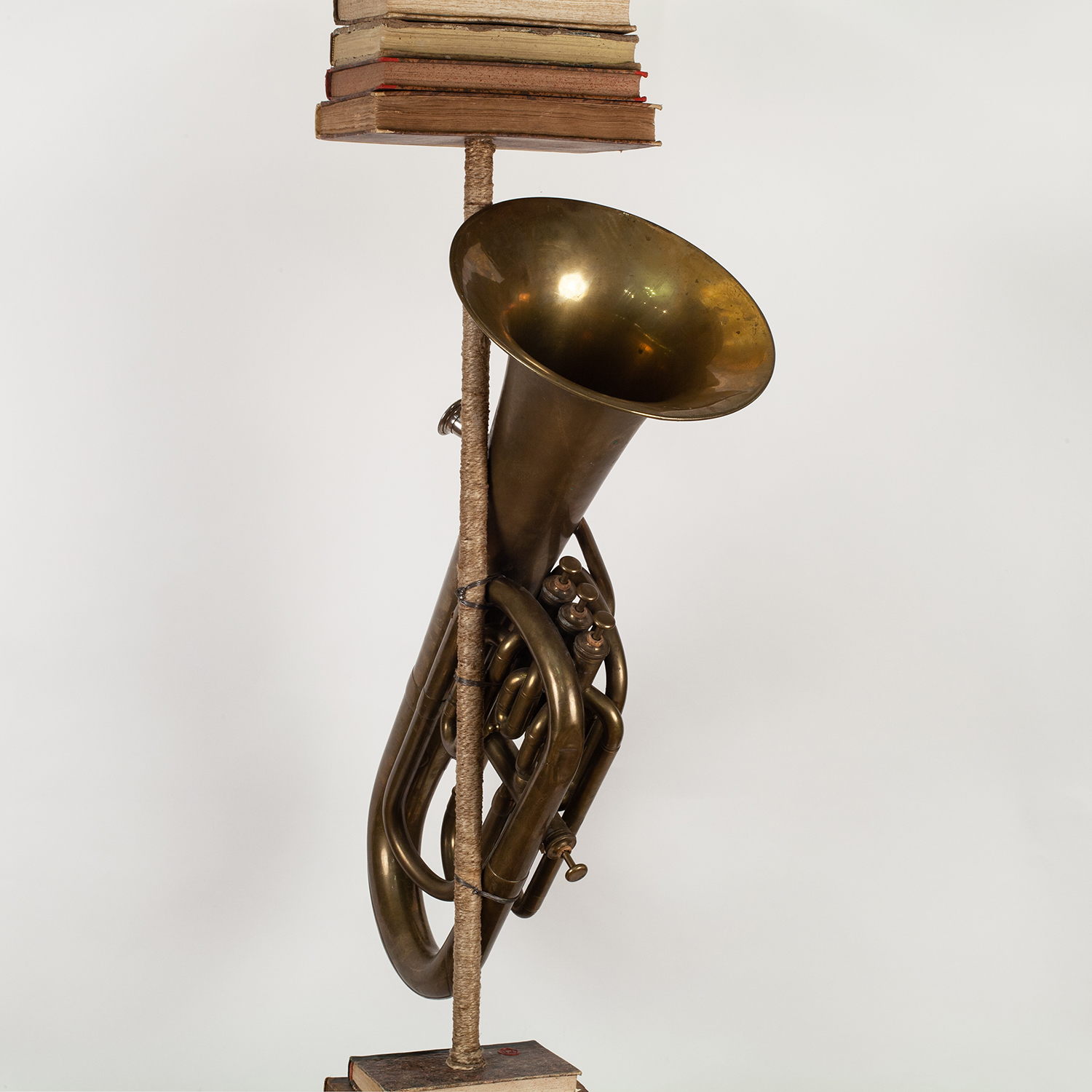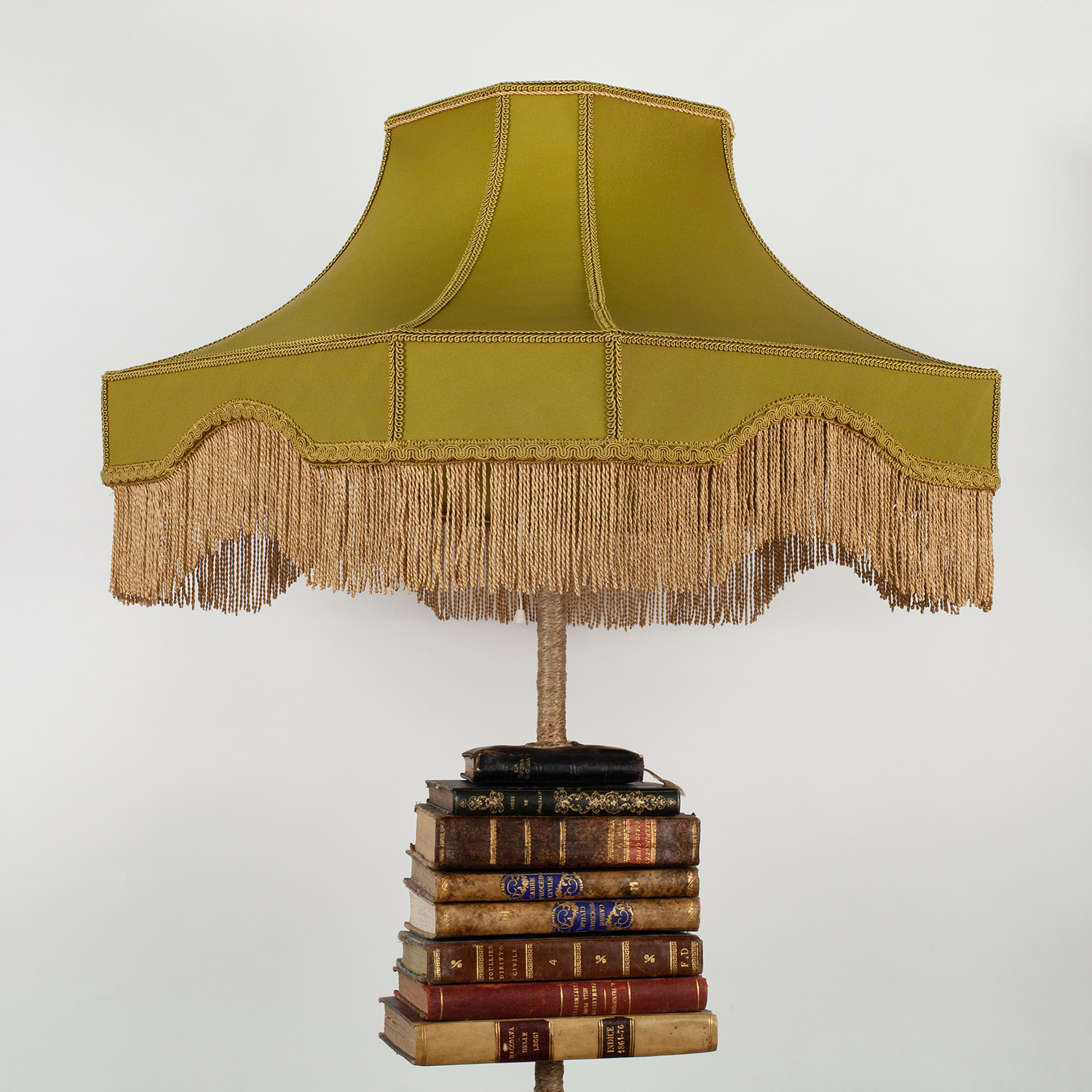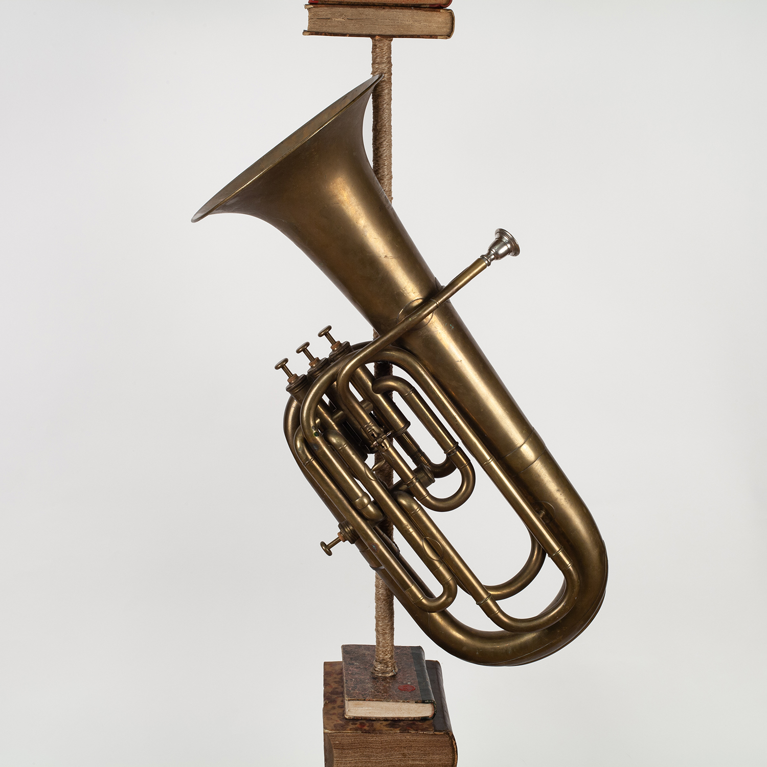 Выполнен в виде тенорной тубы (эуфониума) и стопок старинных книг. Медный сплав, папье-маше, бумага, коленкоровые переплеты с золотым тиснением по корешку; на корпусе духового инструмента штамп «FABRICATION ARTISTIQUE», «MILLEREAU H. SCHOENAERS succR, Brevete` du Conservatoire, 66 Rue D`angoule`me, PARIS», художественное производство Франсуа Миллеро, Франция, конец XIX – начало XX века, высота - 200 см, основание - 28 х 20 см, современный абажур – 60 х 60 см