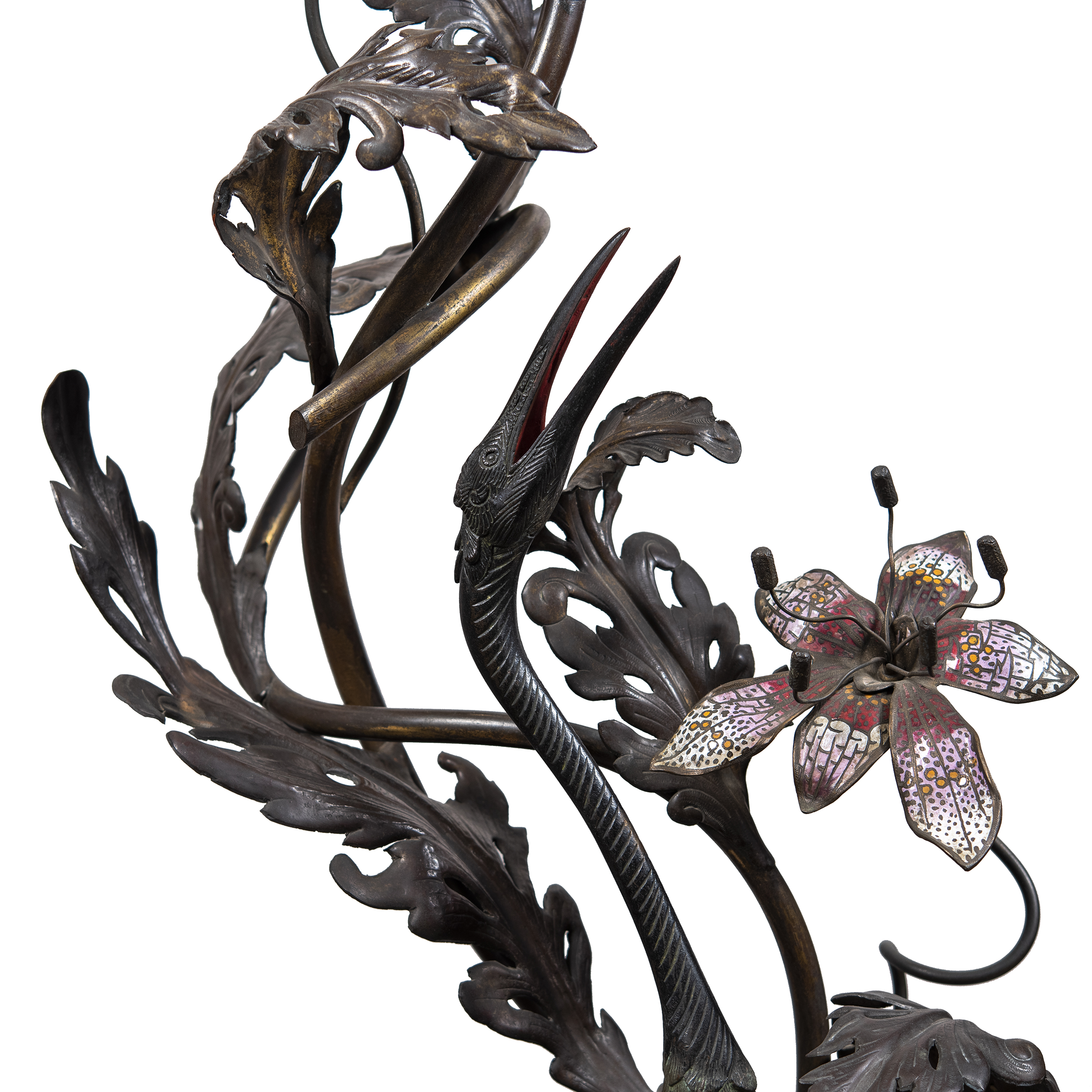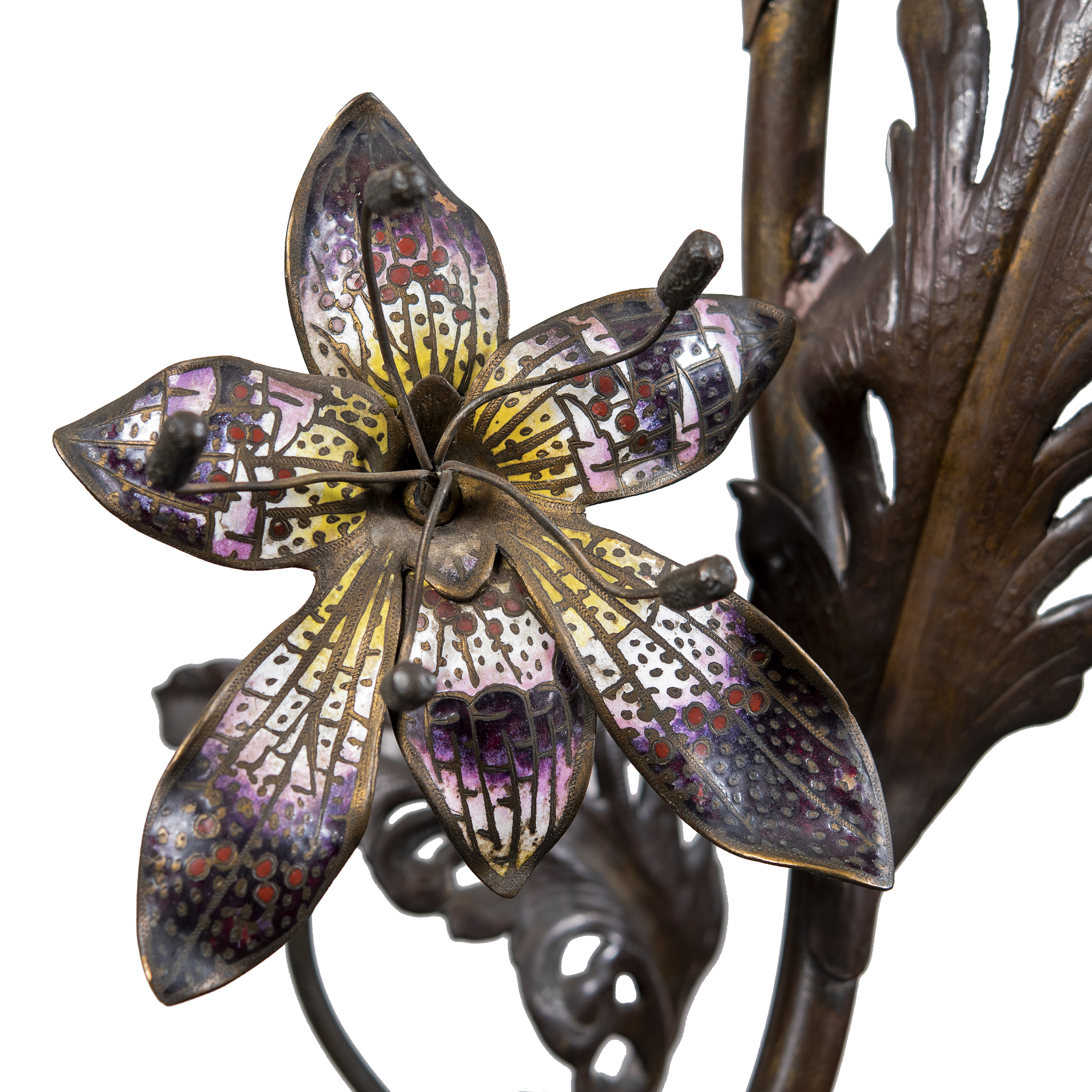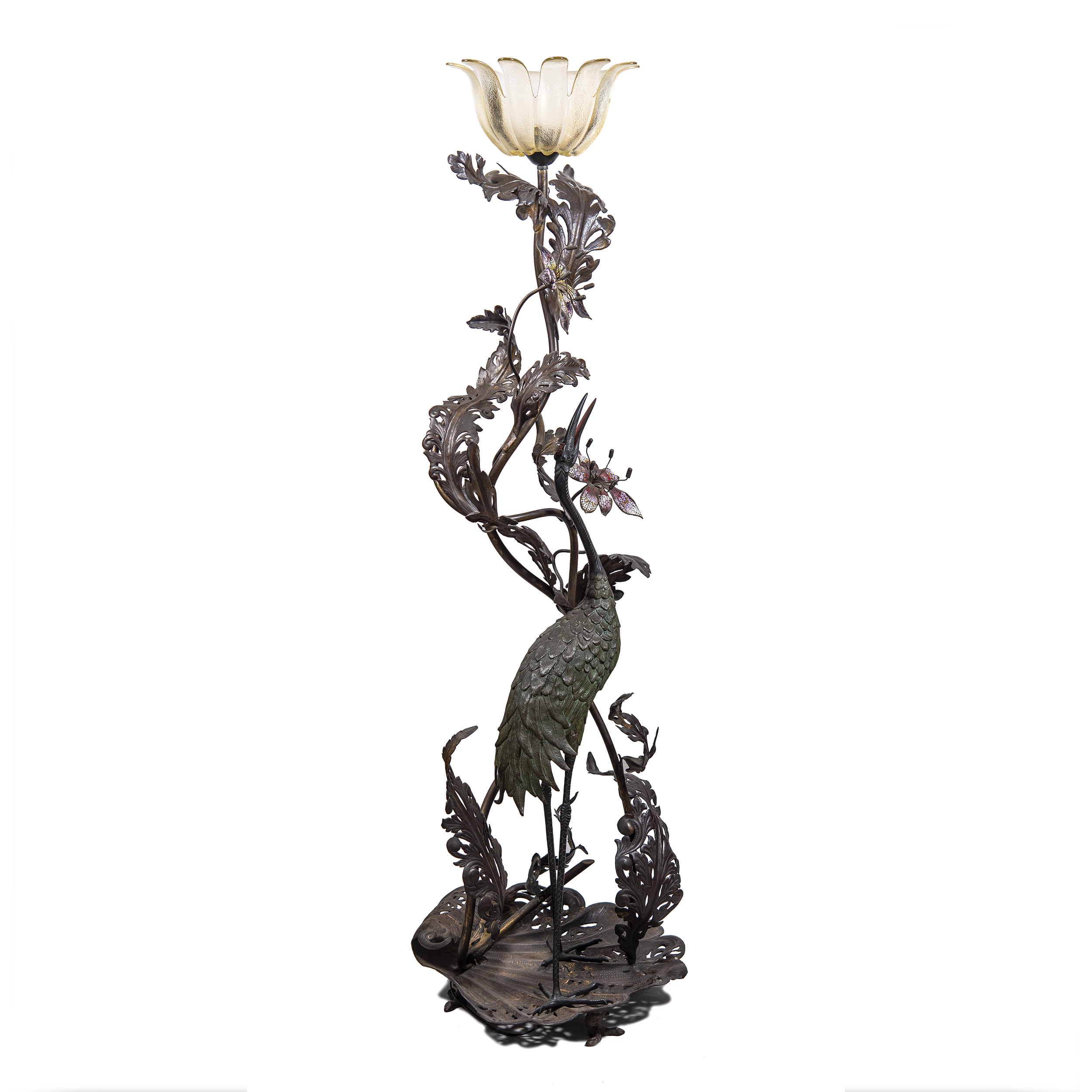 Бронза, литье, чеканка, полихромное патинирование, холодная эмаль, стекло.