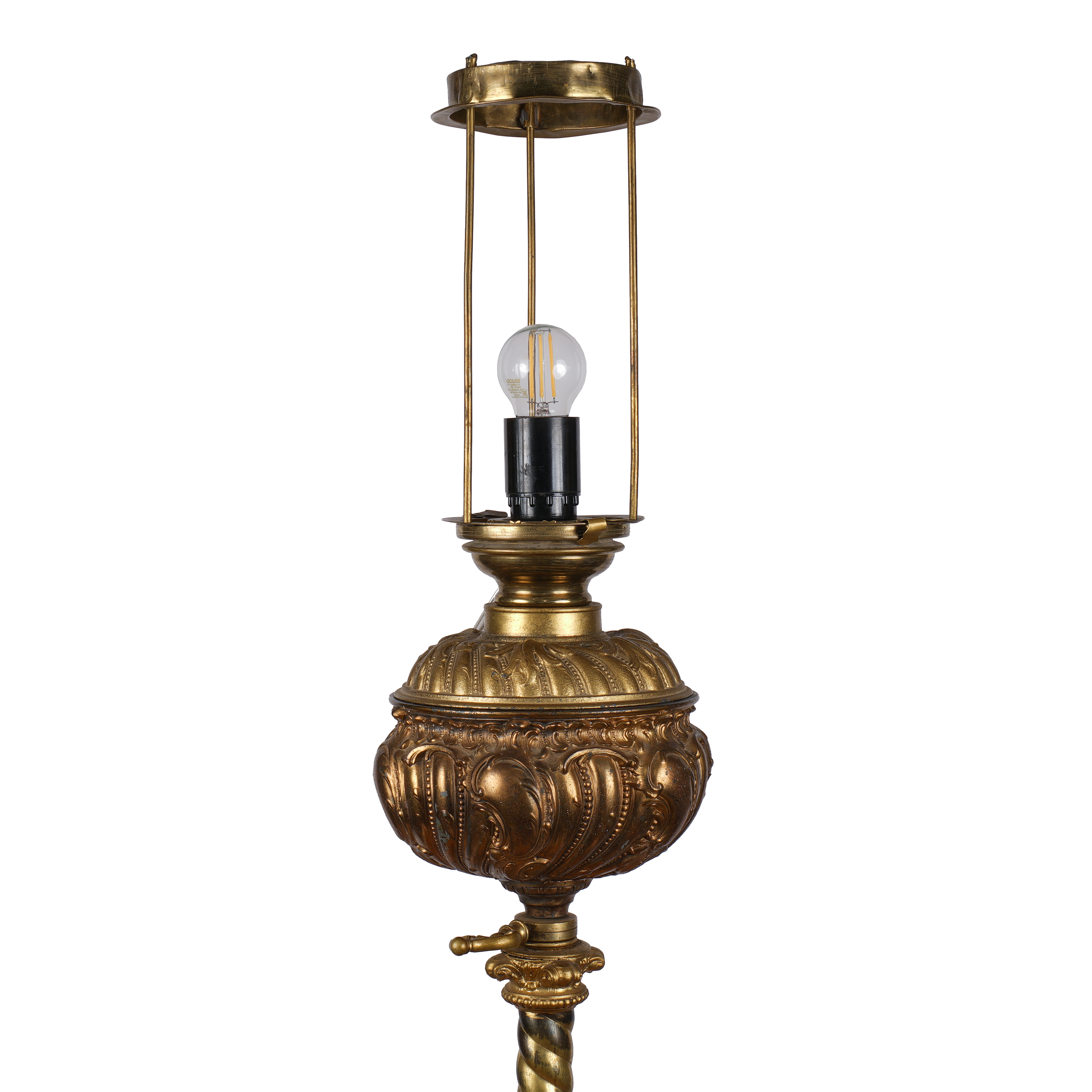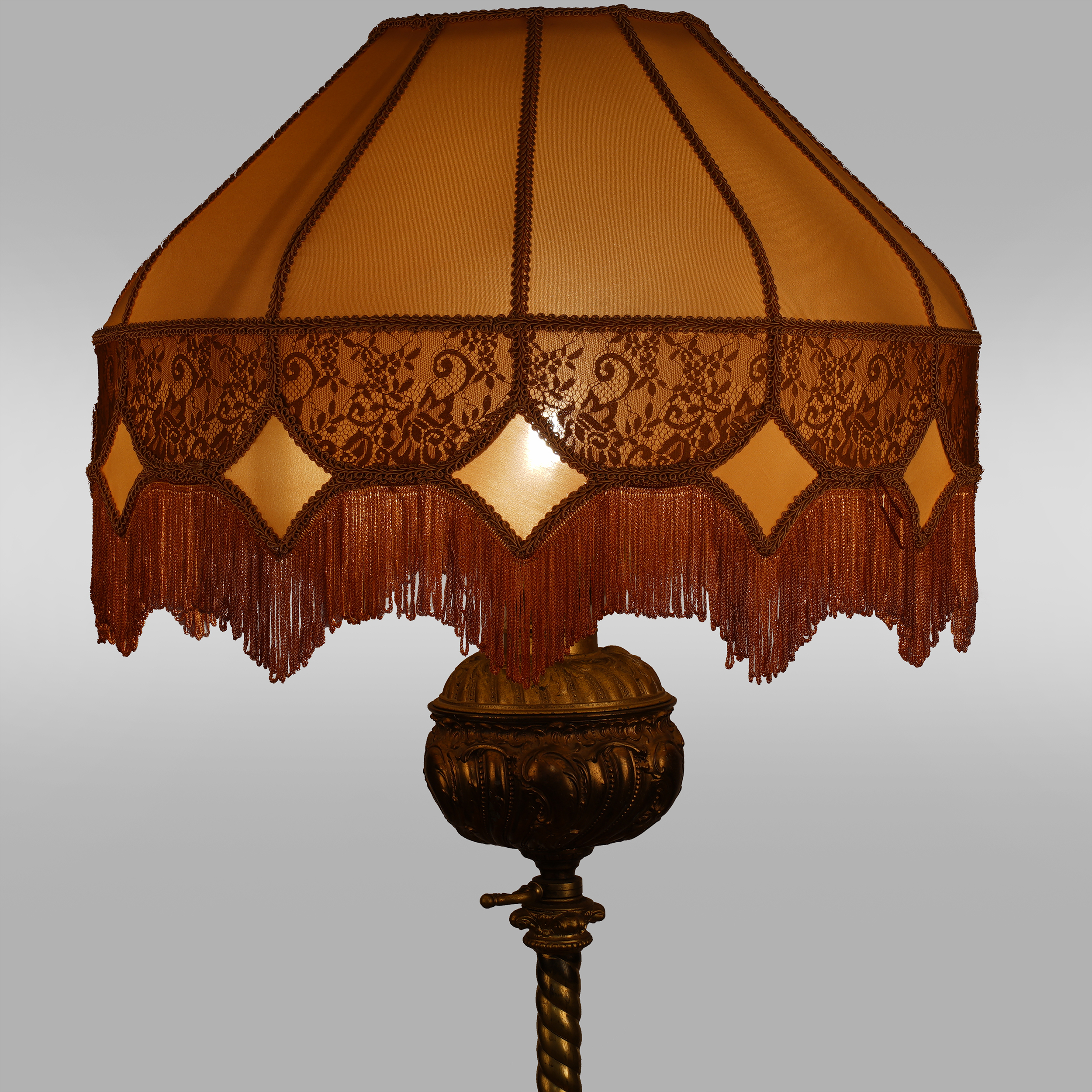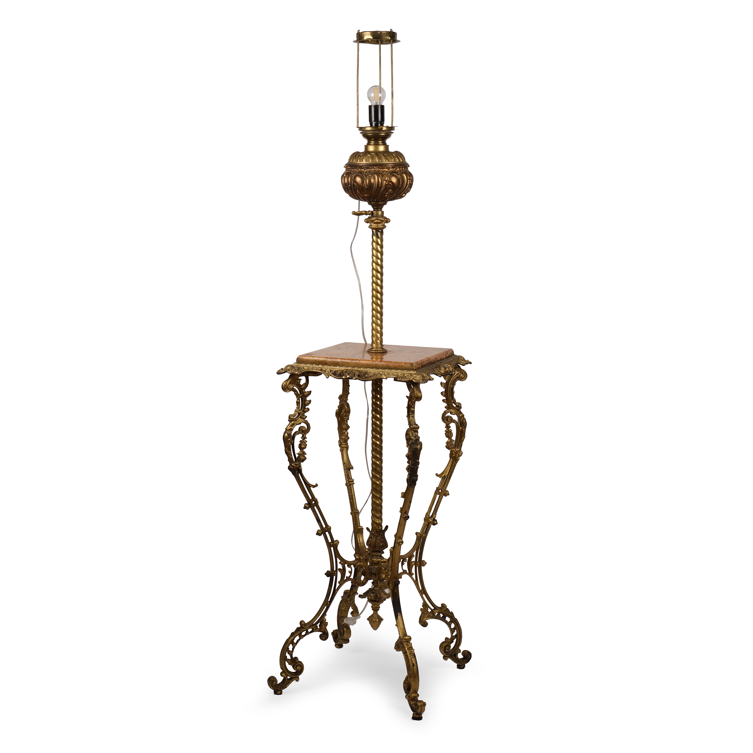 Бронза, литье, чеканка, золочение, мрамор, монтировка, штанга- телескопическая, высота регулируемая, абажур ткань, Западная Европа, конец ХIХ века, размеры (в/ш/г): 178 х 40 х 40 см