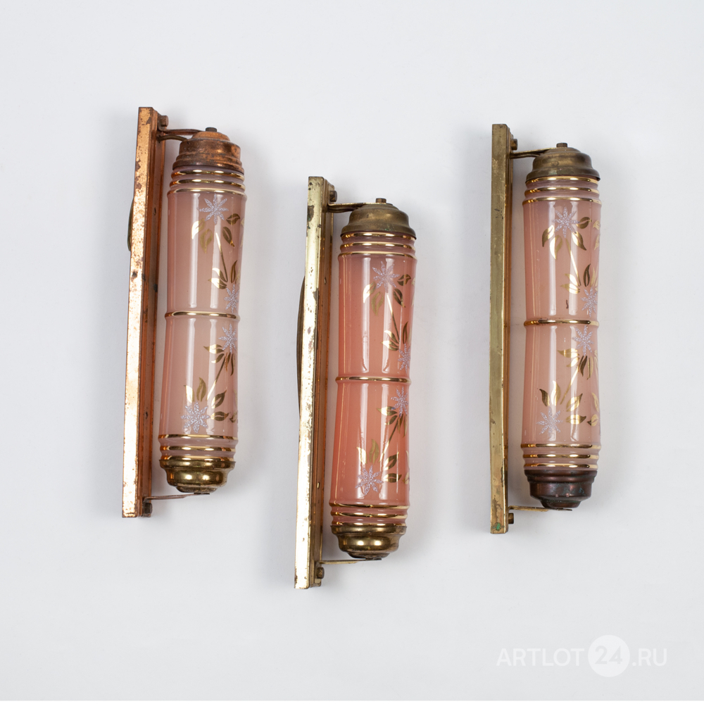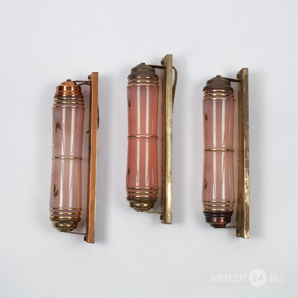 Латунь, плафоны розового стекла, роспись белой эмалевой краской, золочение, Европа, начало XX века, длина – 27,5 см, ширина по плафону – 5,5 см