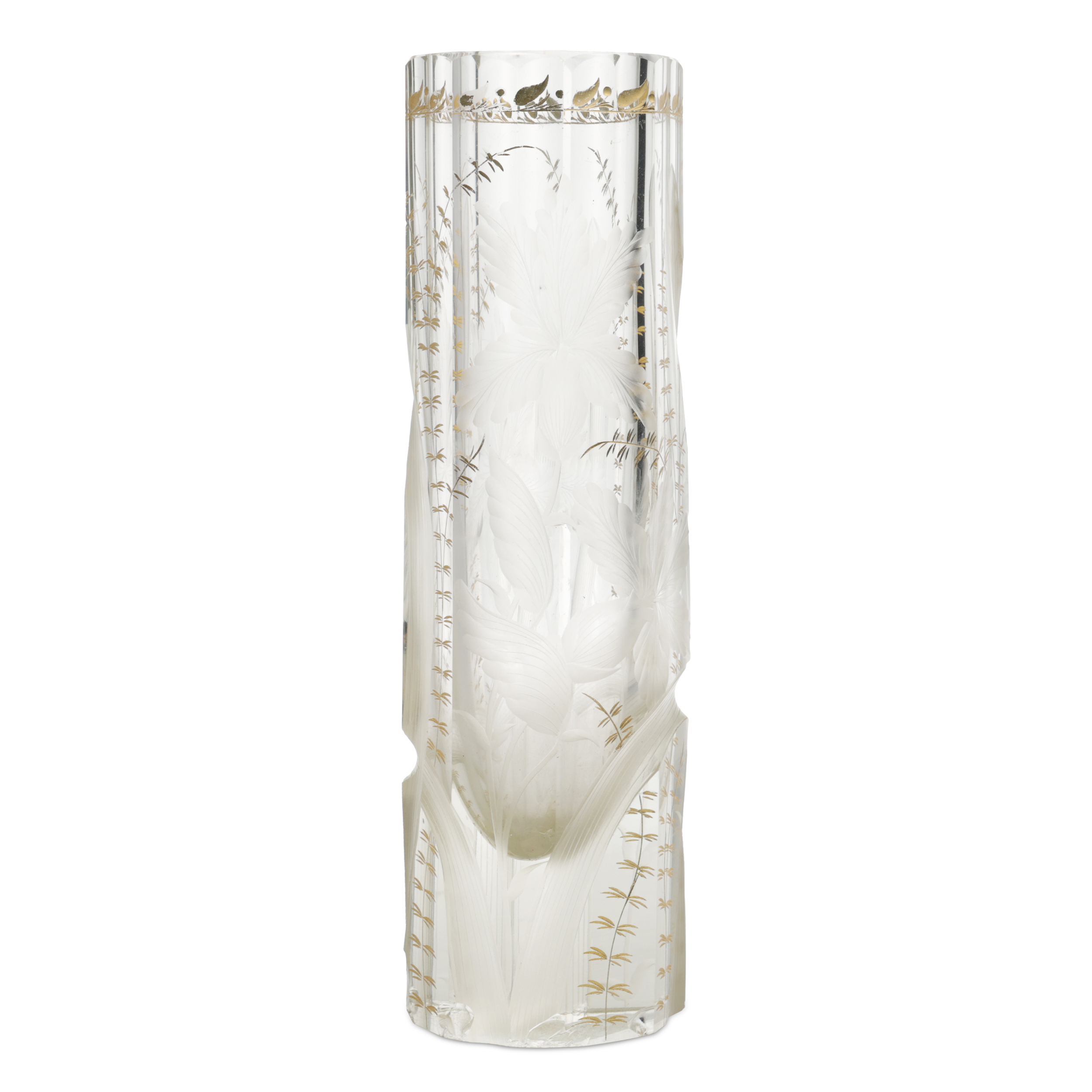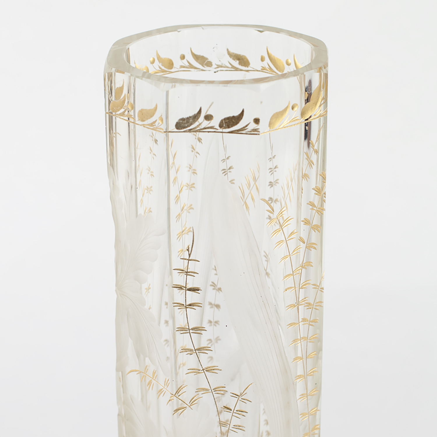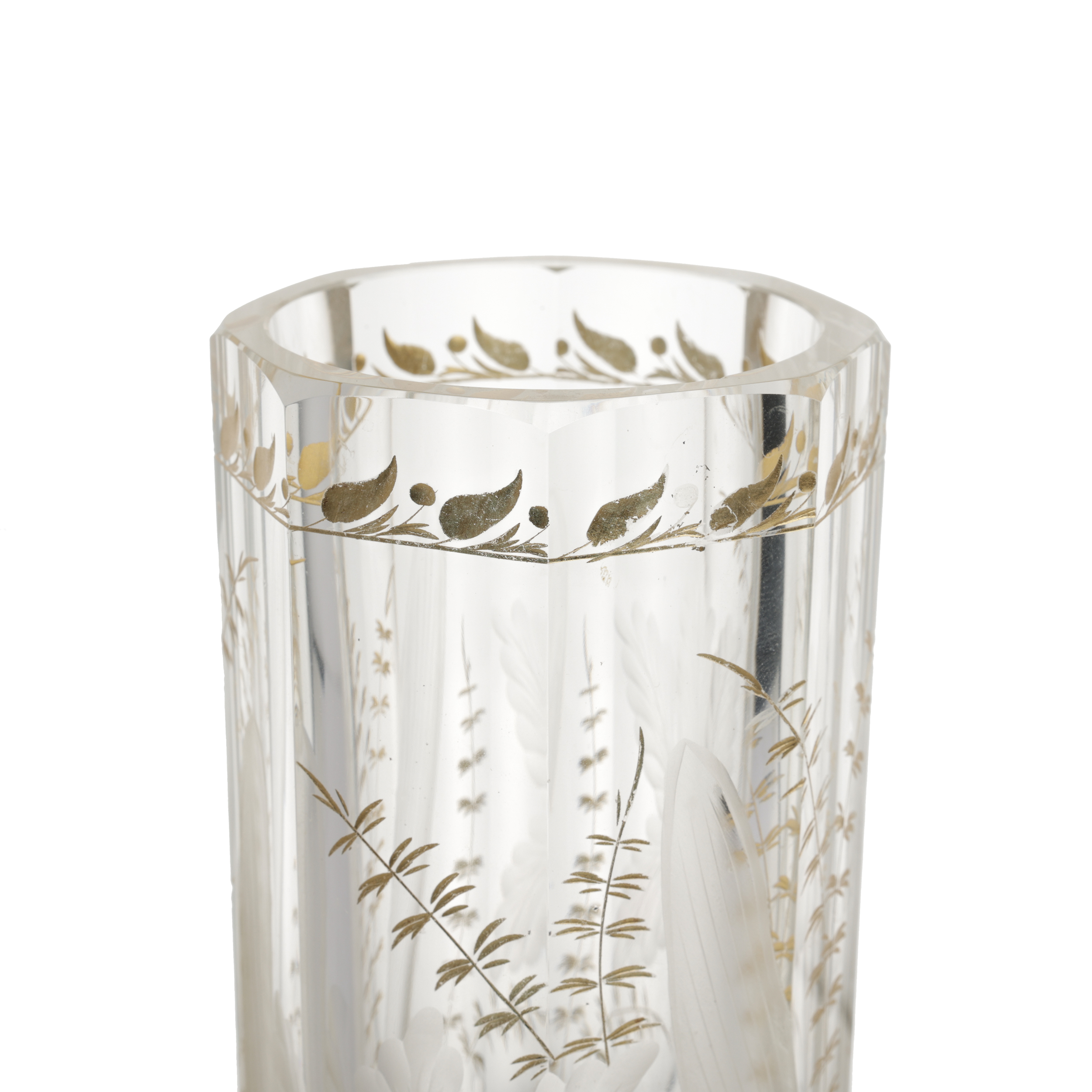 Стекло прозрачное бесцветное, гранение, шлифовка, рельефный рисунок, золочение, Россия (?), начало XX века, высота - 27 см