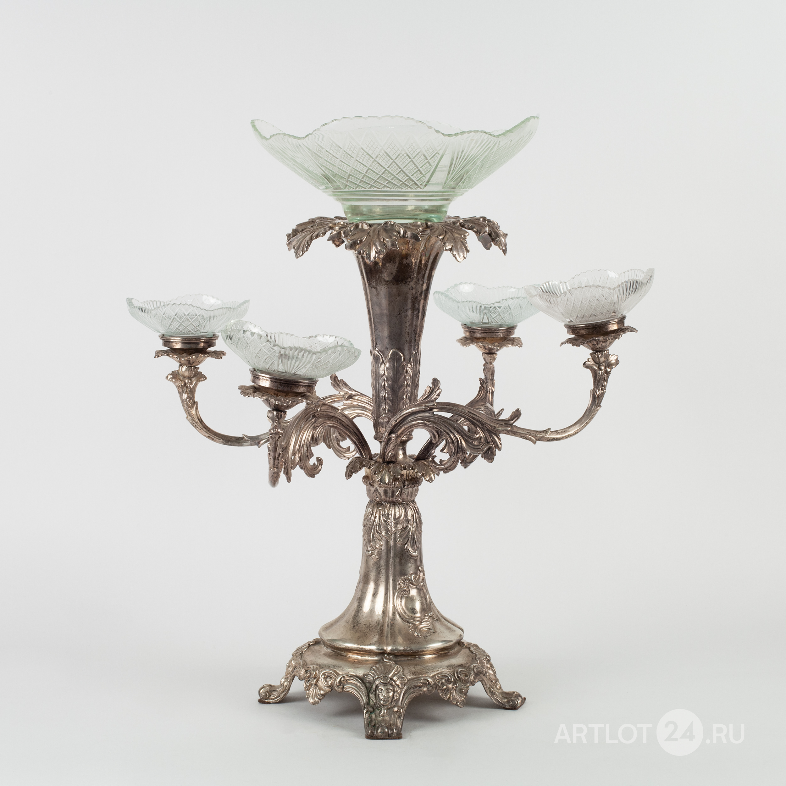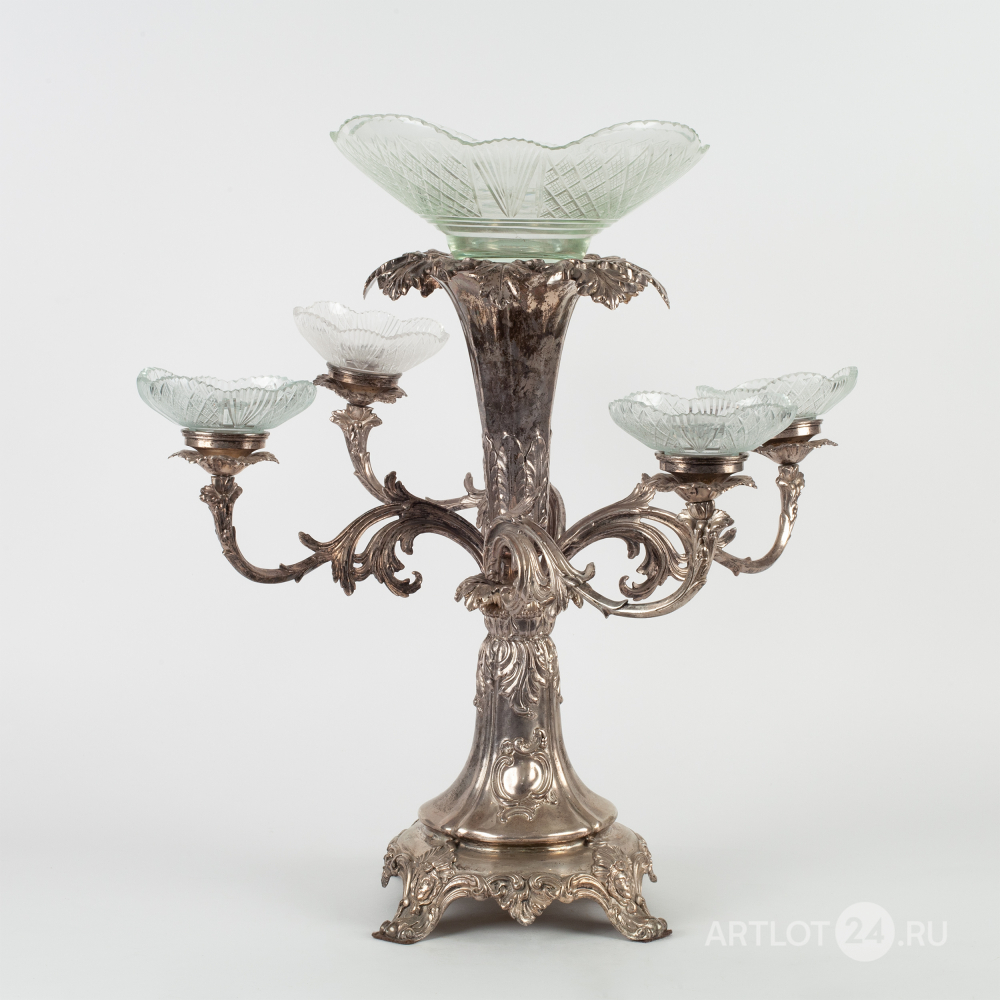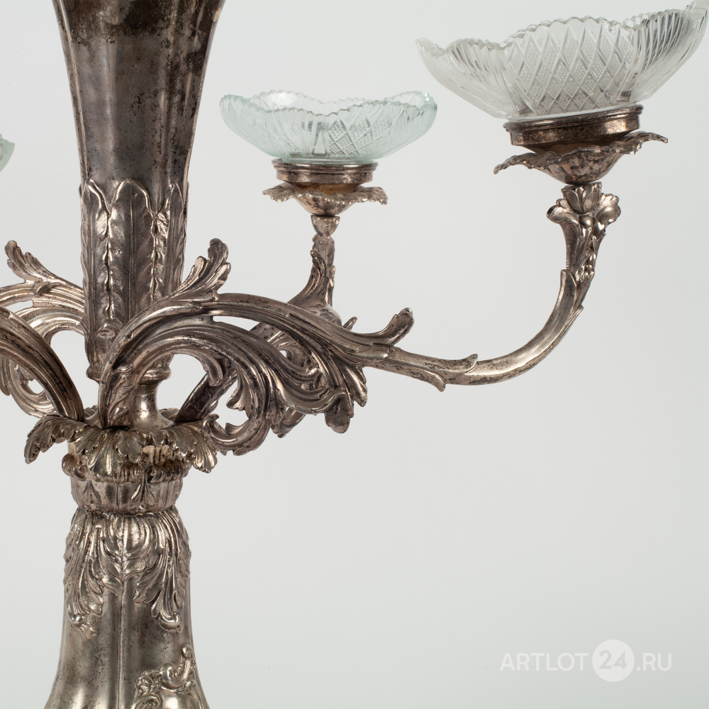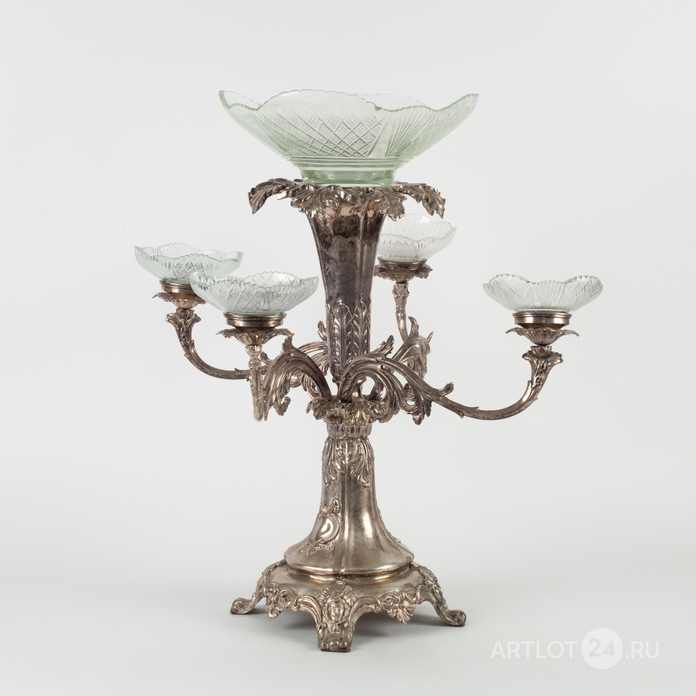 Настольное украшение или «сюрту-де-табль» с хрустальной чашей и четырьмя розетками на фигурных рожках.