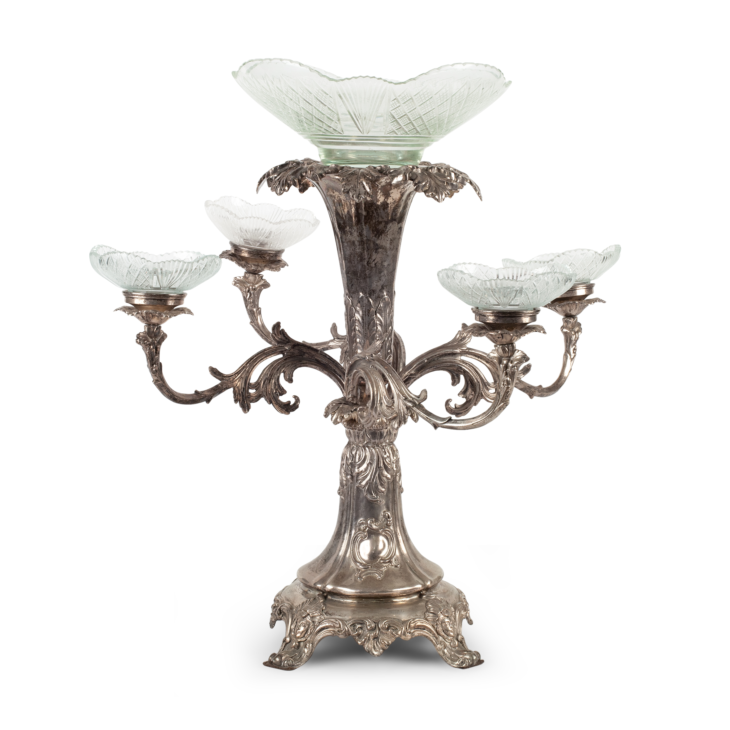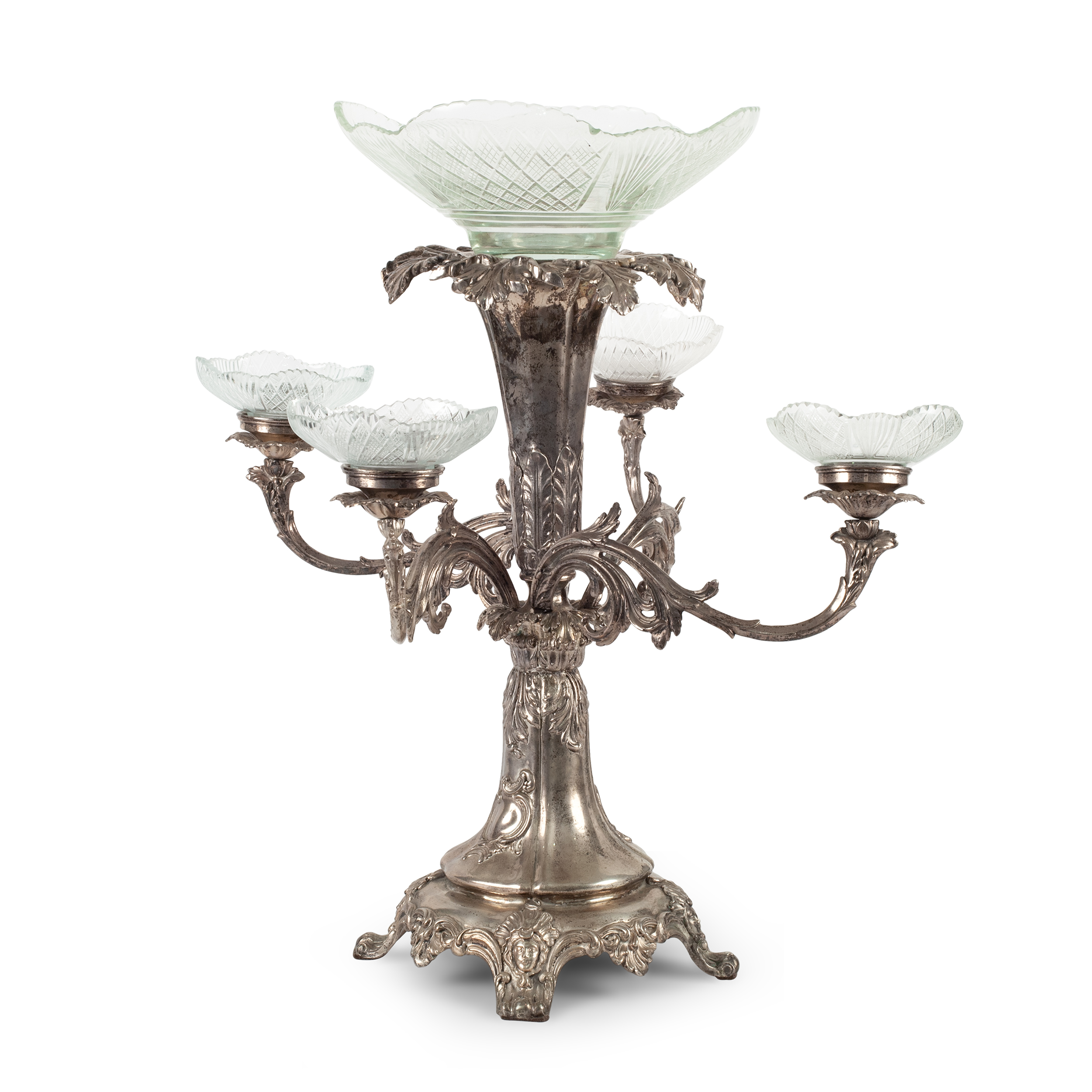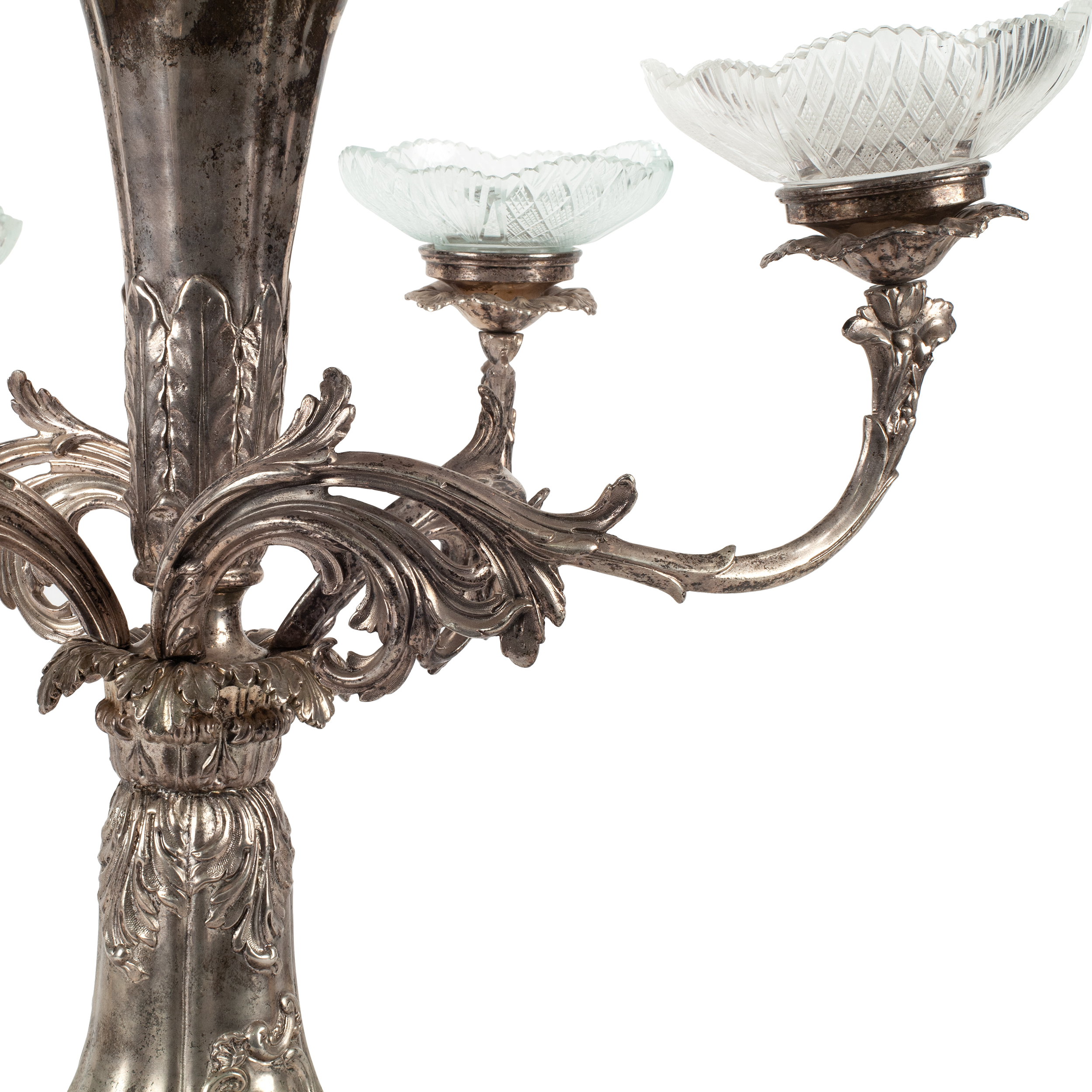 Настольное украшение или «сюрту-де-табль» с хрустальной чашей и четырьмя розетками на фигурных рожках.