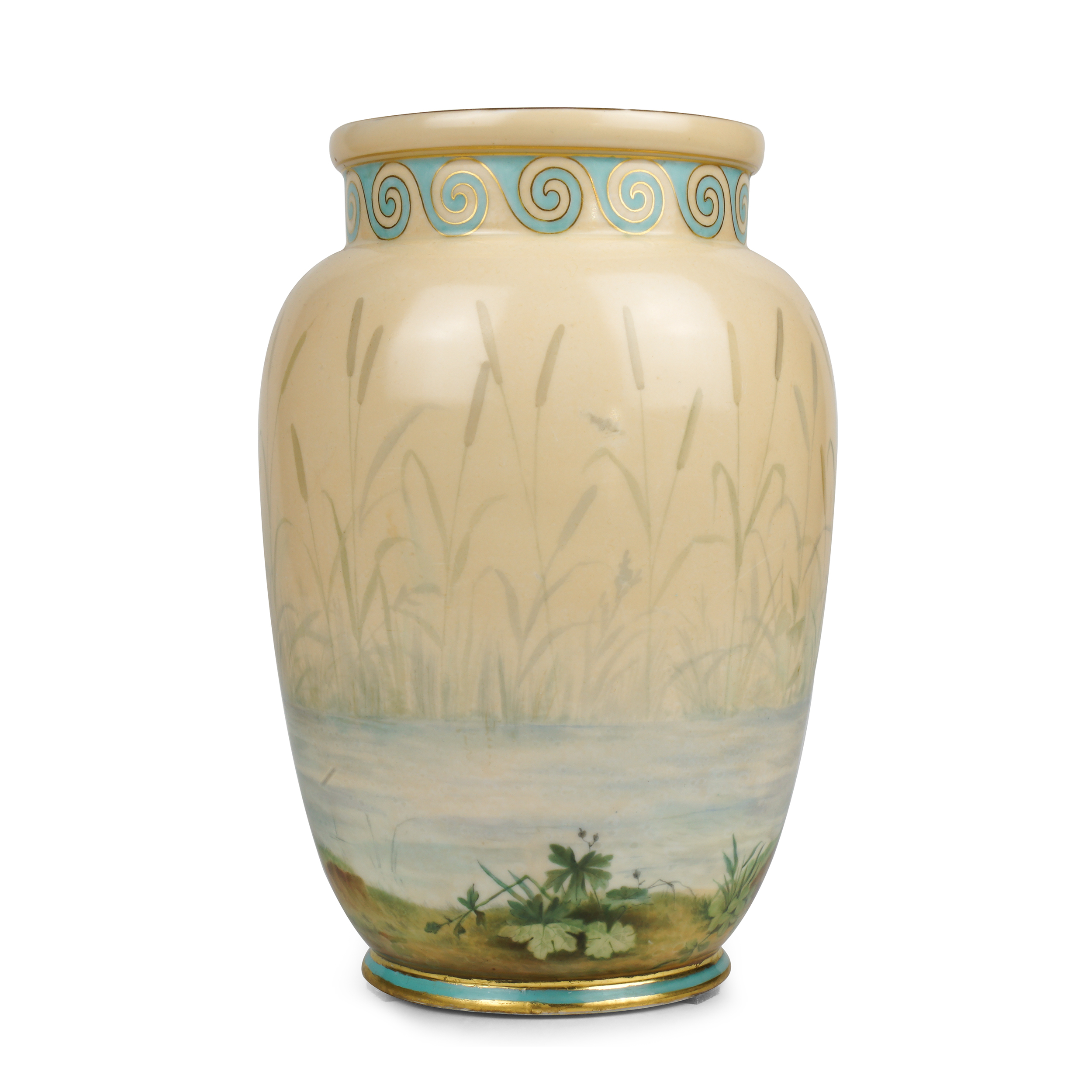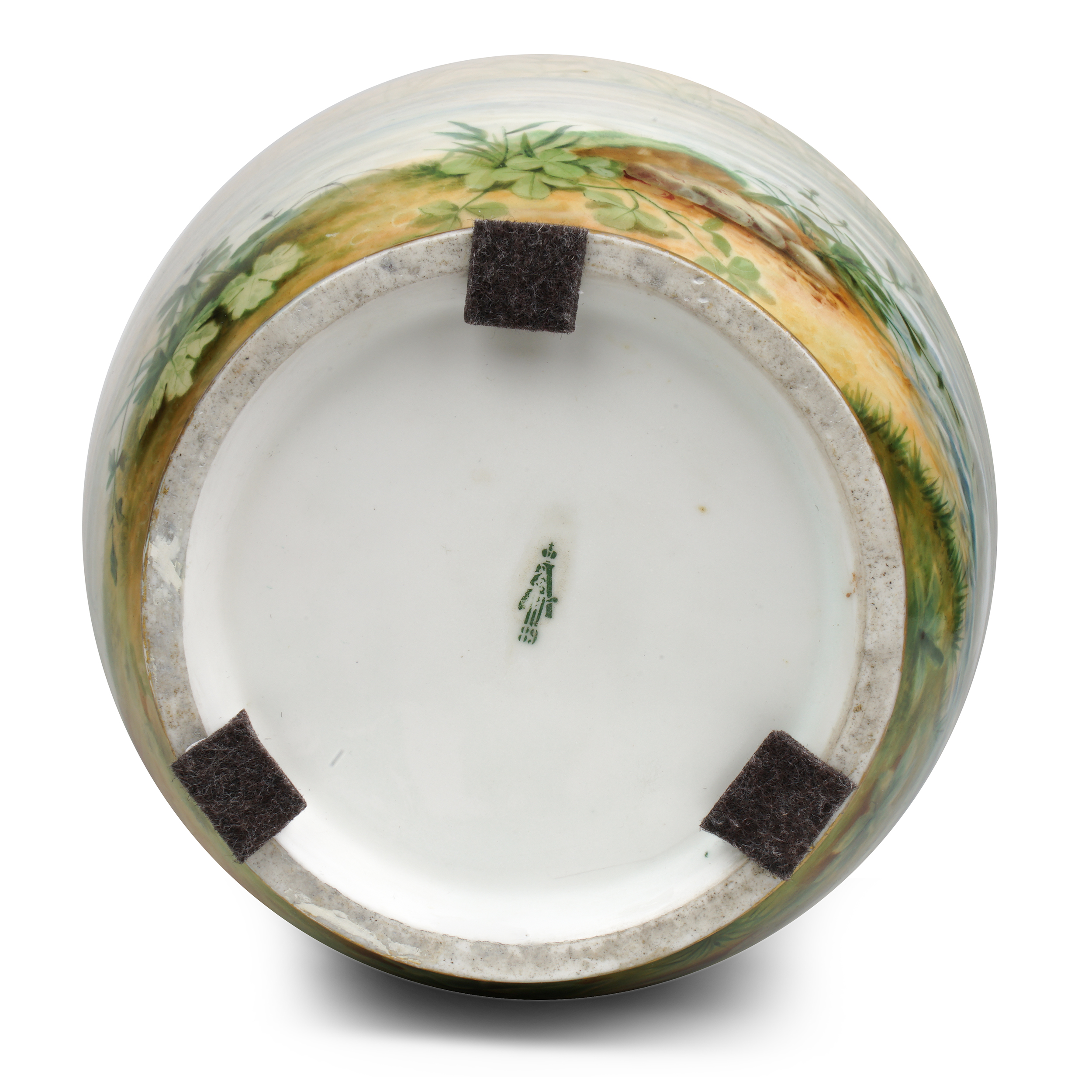 Фарфор, полихромная надглазурная роспись муфельными красками, горло вазы украшено орнаментом «бегунок», зеленая подглазурная марка штампом «А III 89 под короной»; высота – 26 см, диаметр – 17, 5 см.