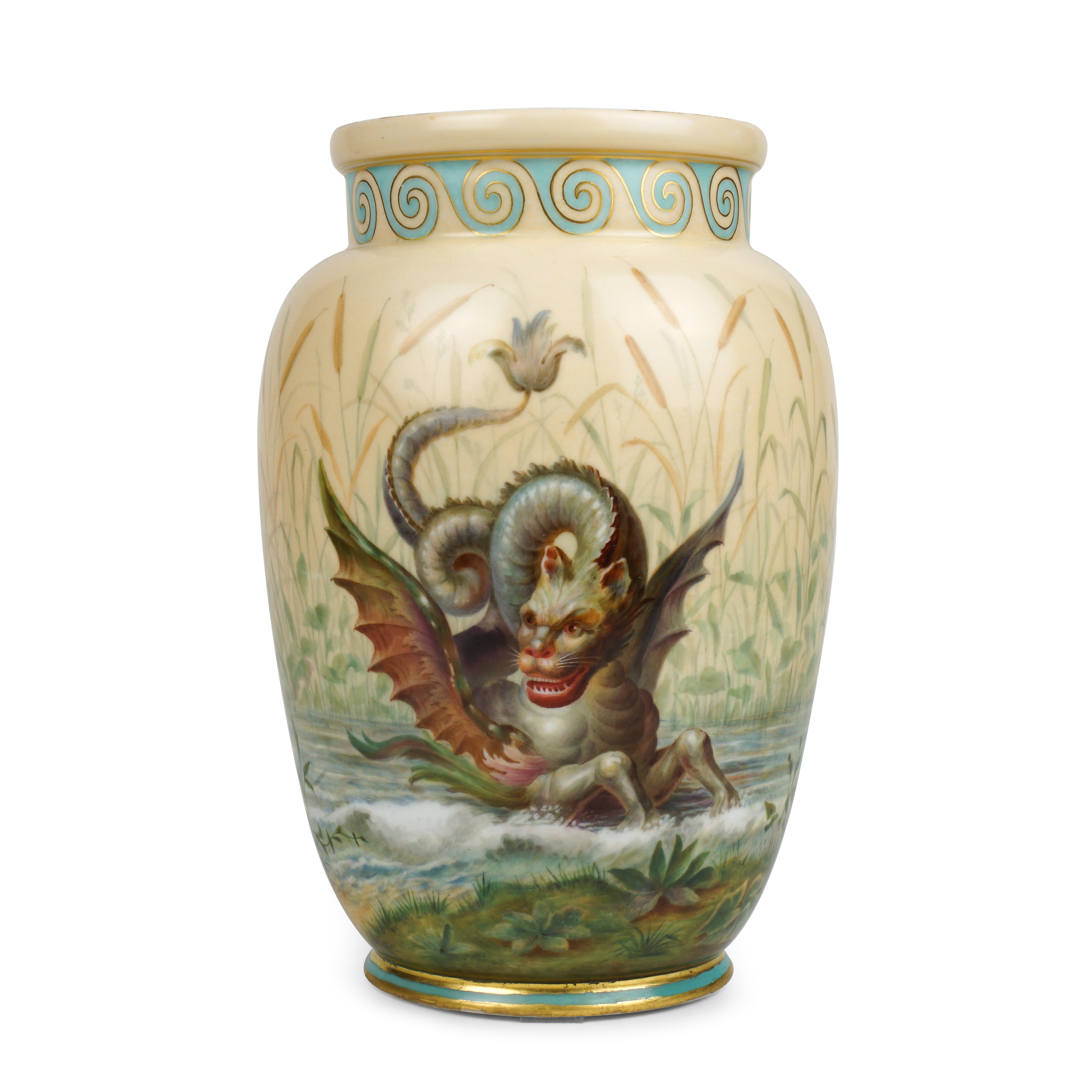 Данная фарфоровая ваза 1889 года с изображением ихтиокентавра является подлинным произведением Императорского завода, исполнявшего фарфор по заказам императорского Двора для убранства царских резиденций и подарков приближенным. Она является интересным произведениям переходного периода от историзма с его интересом к ретроспективным образам и экзотическим сюжетам к модерну, который проявляется использовании обобщенных дальневосточных вазовых форм, свободной панорамной композиции росписи, холодной палитре зеленых и голубых тонов.