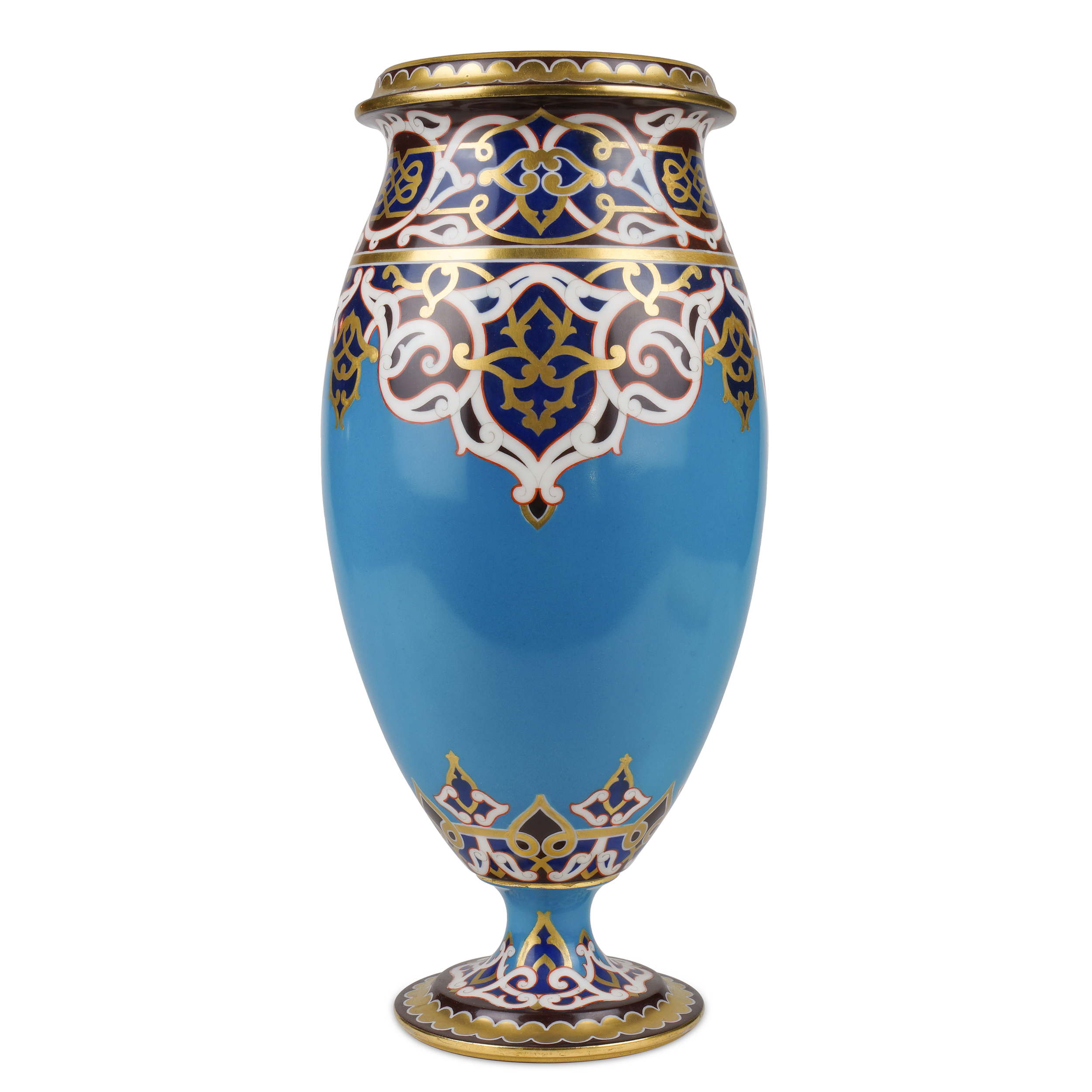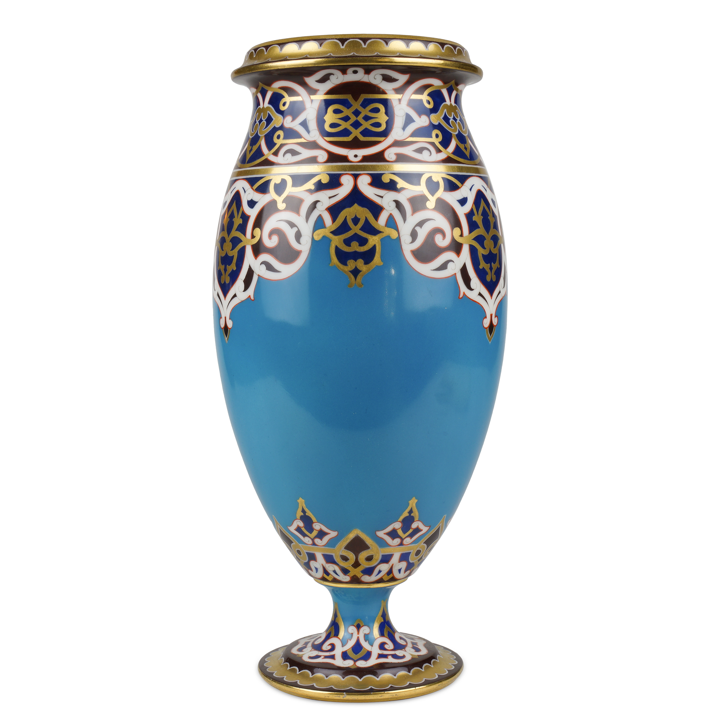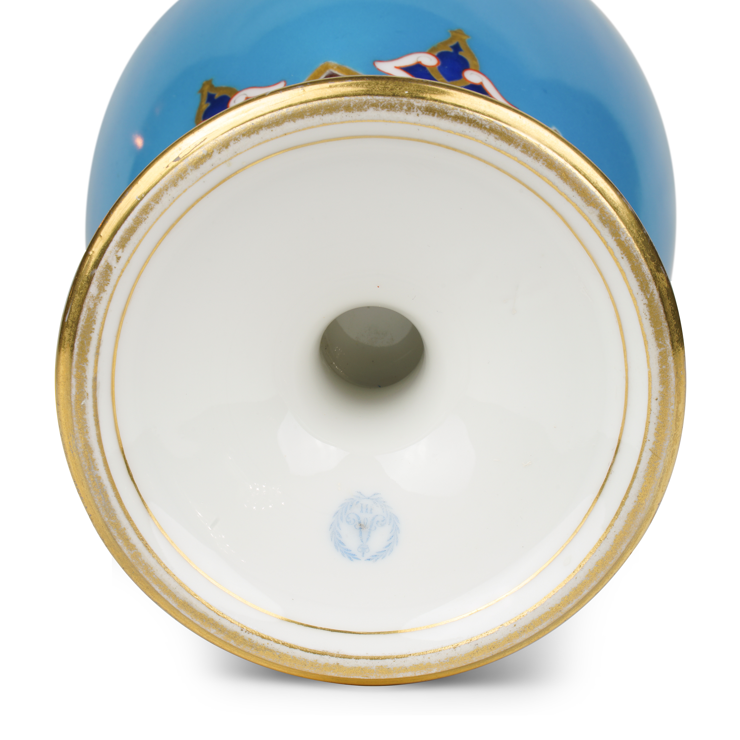 Автор росписи В.Д. Тарачков. Фарфор, полихромное крытье, орнаментальное золочение; клеймо печатное надглазурное «А III под короной в лавровом венке»; Россия, высота – 32,4 см, диаметр горловины – 11 см.