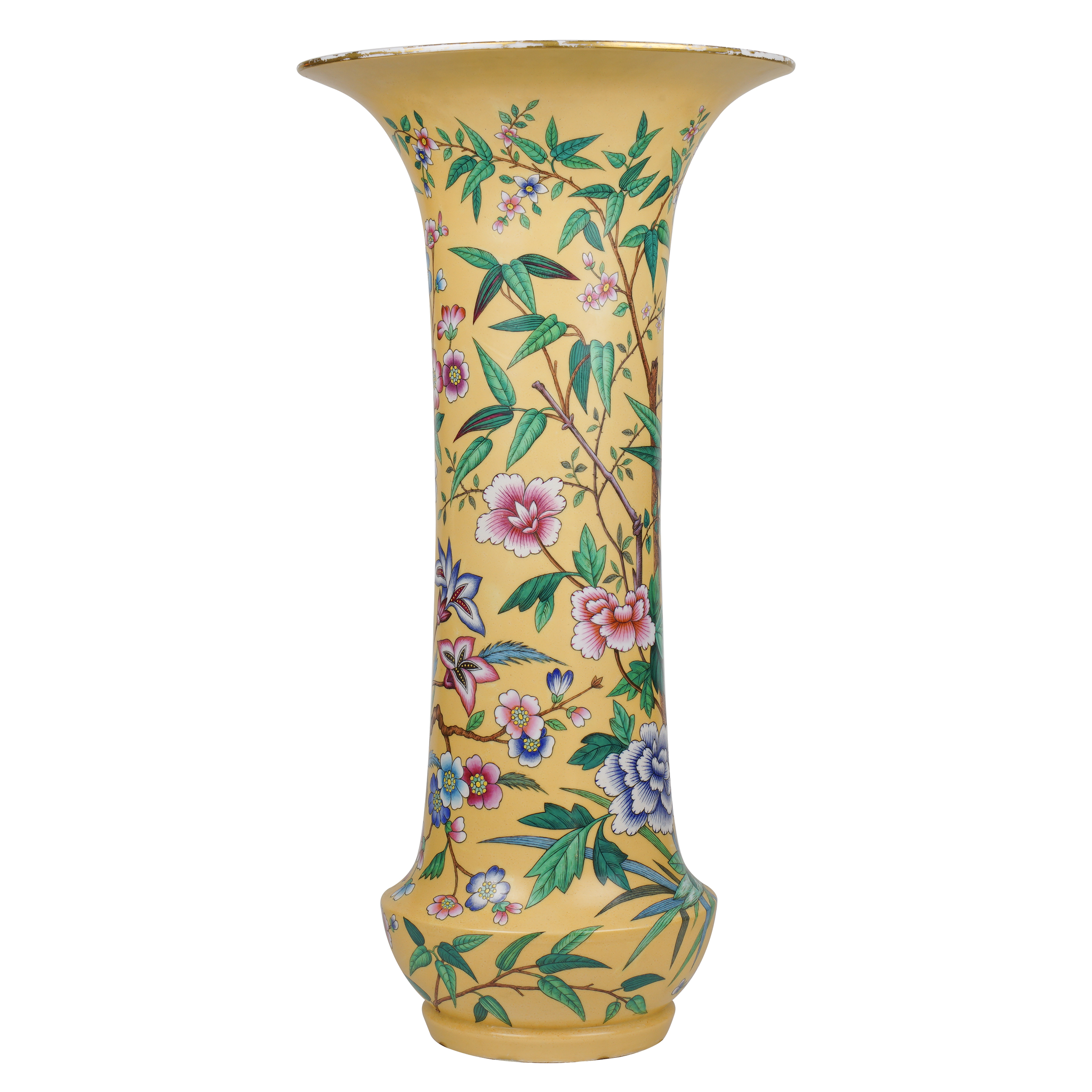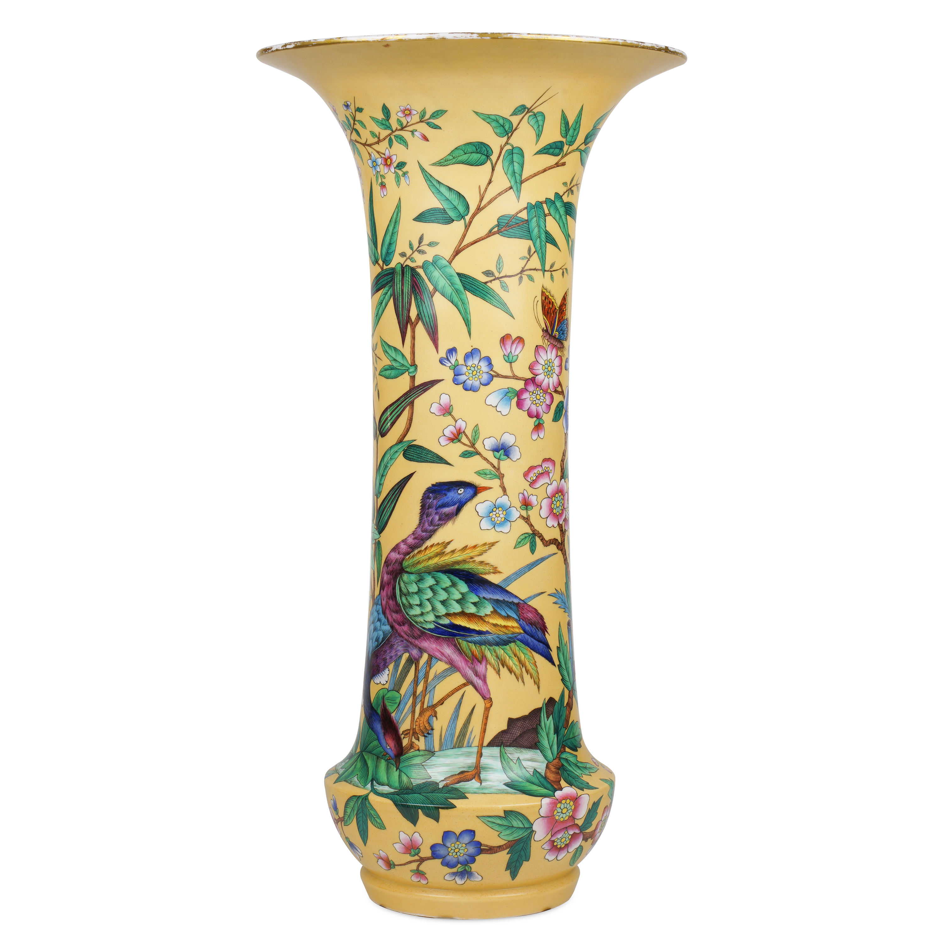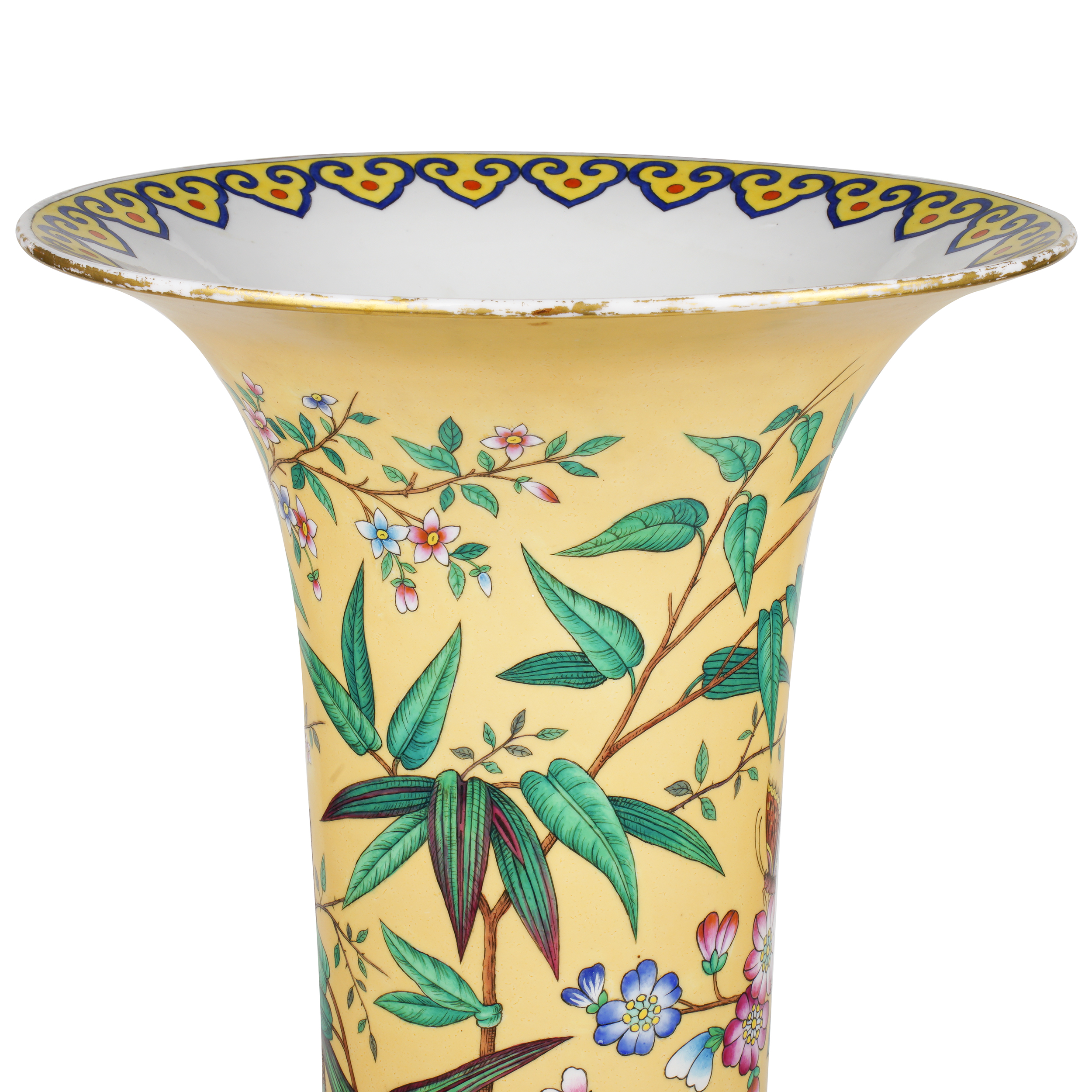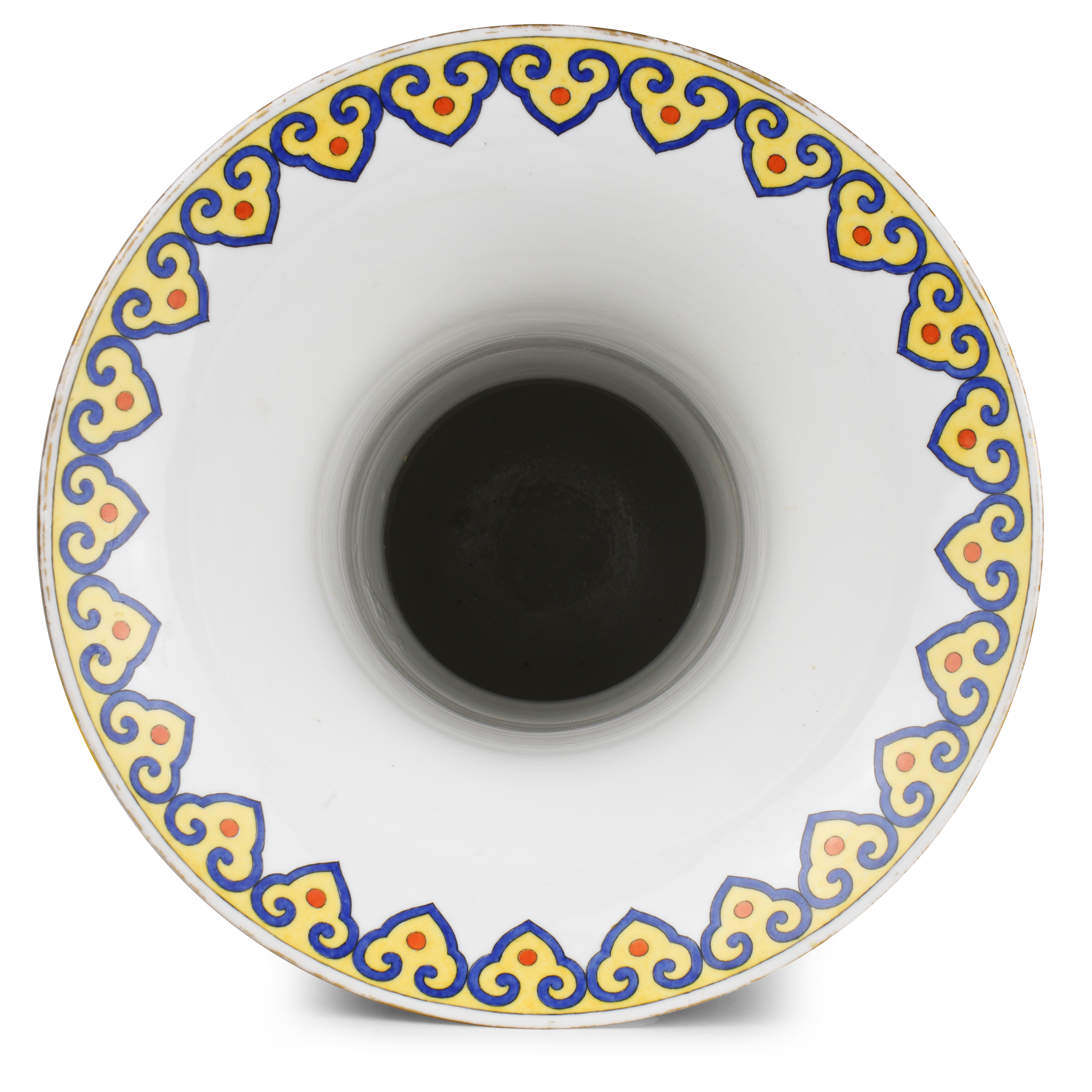 Цилиндрическая форма данной вазы с расширением в нижней части и широким раструбом горловины восходит к японскому фарфору XVII – начала XVIII веков из мастерских Арита. Арита – селение на острове Кюсю в Японии, в котором с XVII века начали производить фарфор для экспорта.