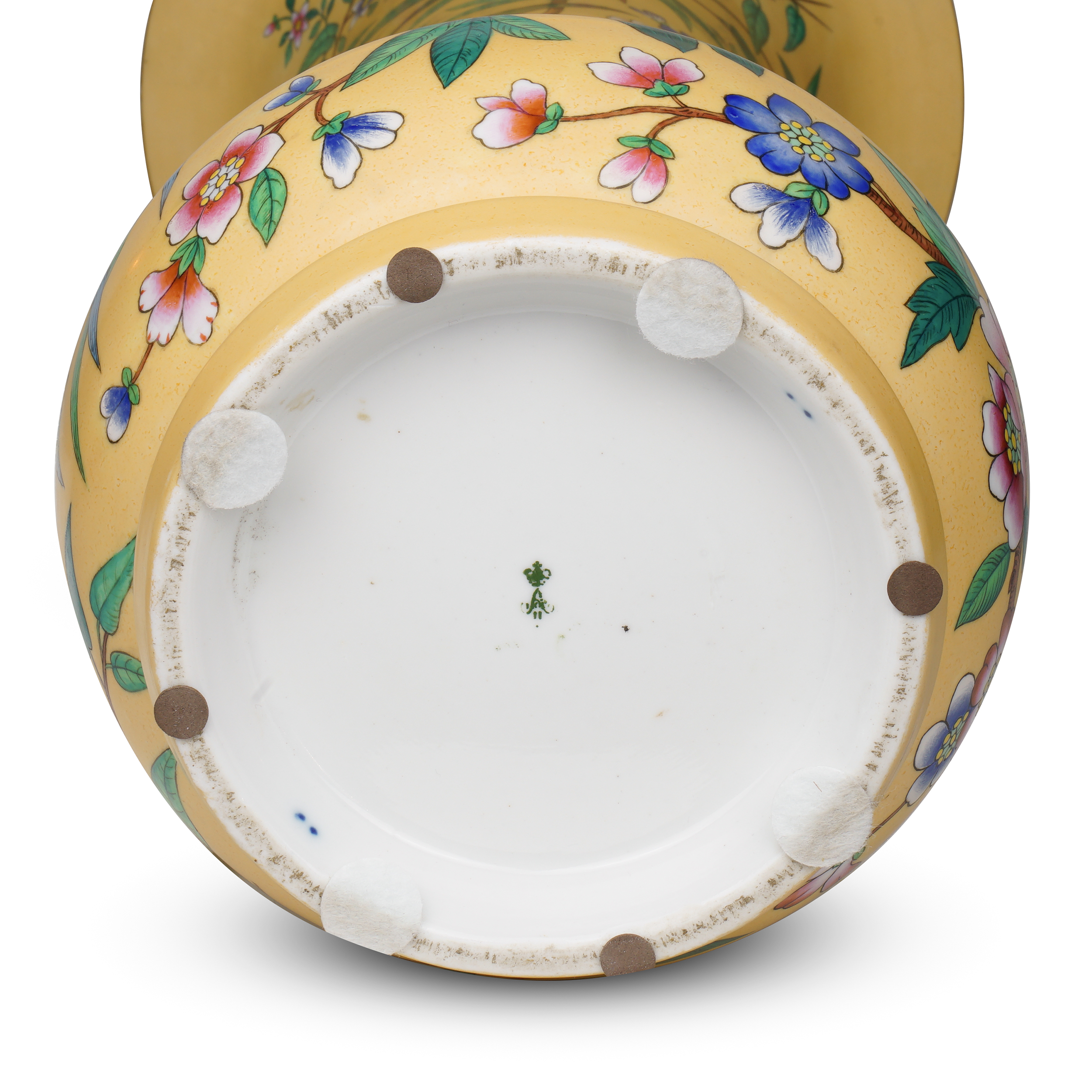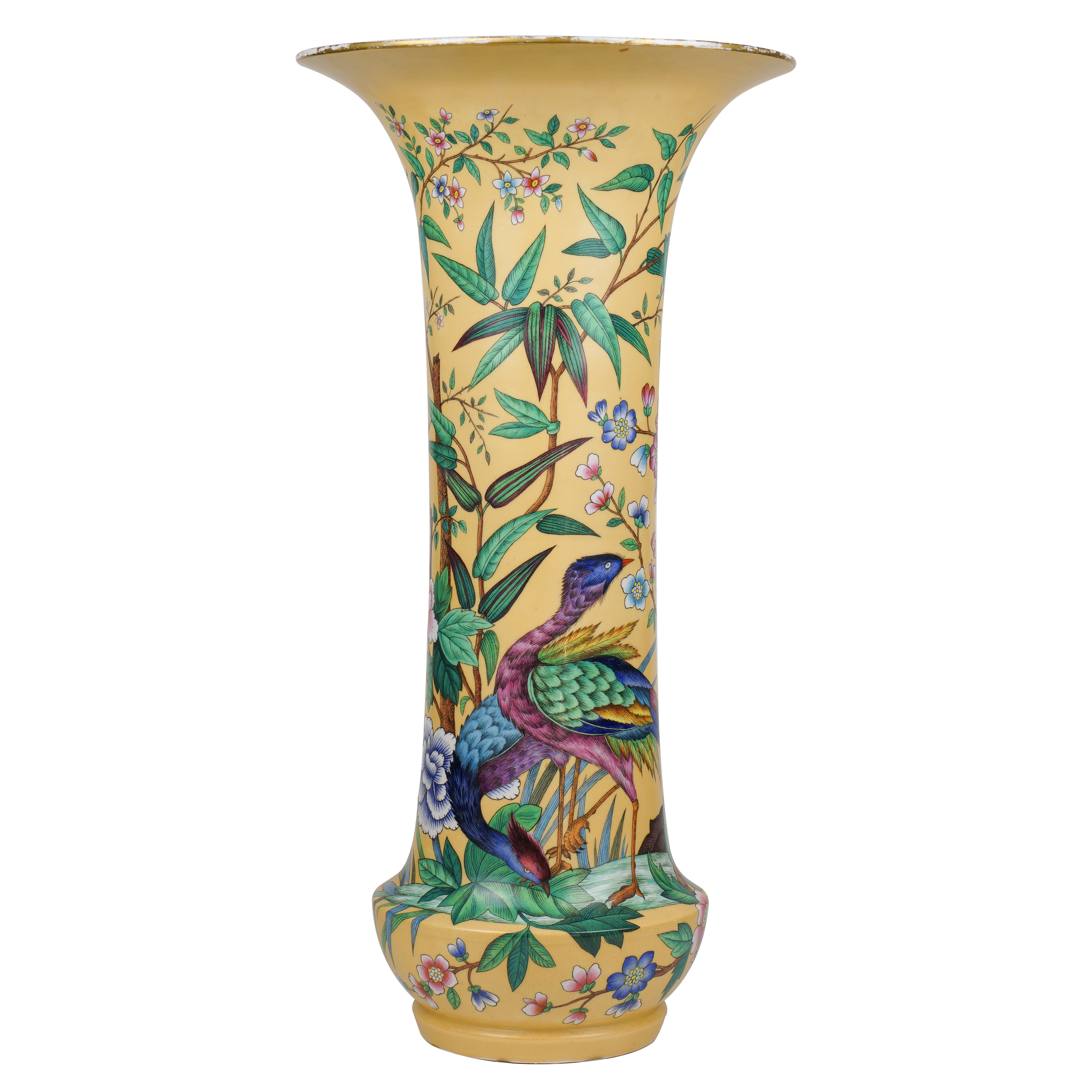 Роспись по рисунку художника А.С. Васильева, ученика В. Босе. Фарфор, полихромное крытье, надглазурная полихромная роспись, золочение; подглазурная марка «А II» под короной с точкой хромом, точки кобальтом в основании; период правления Александра II, Россия; высота – 59,54, диаметр – 30 см.
