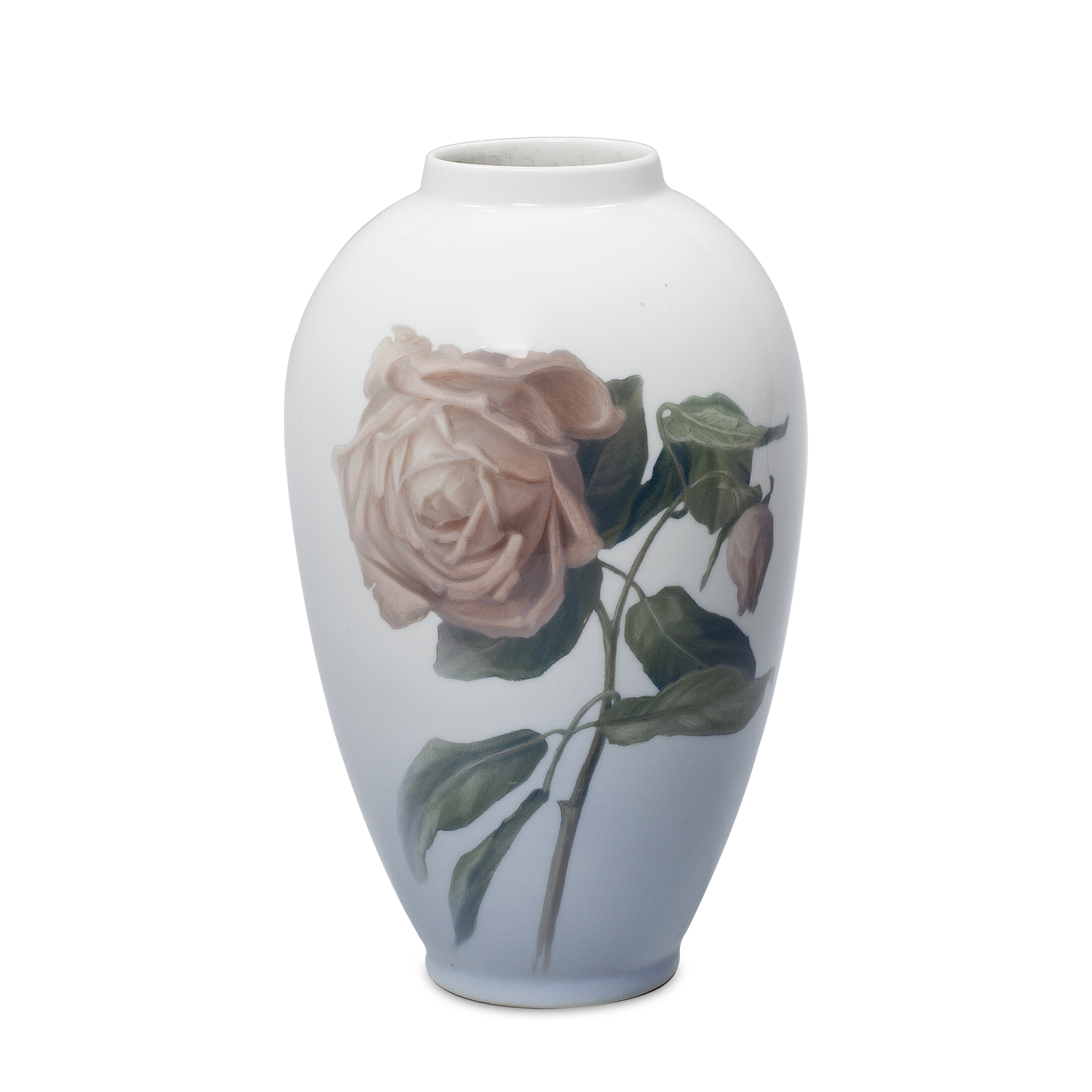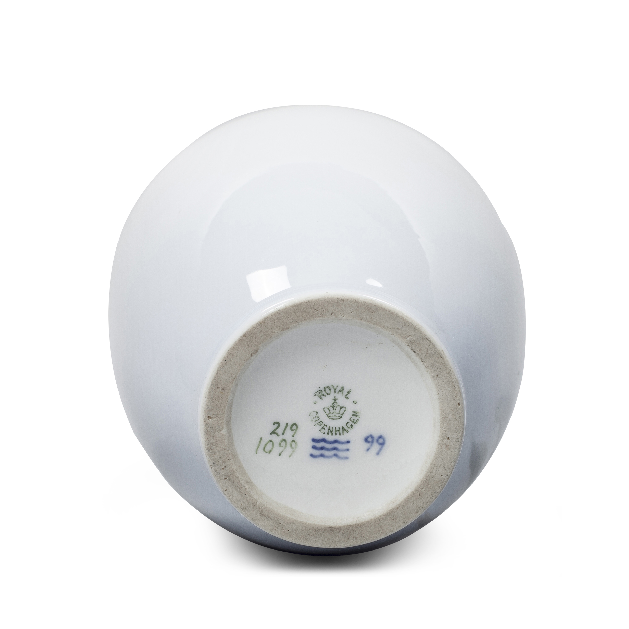 Фарфор, подглазурная роспись, марки: печатная хромом «Royal Copenhagen Denmark» с короной и номером 219 и 1099, кобальтом «три волны», «99» - номер художника расписавшего вазу, Тира Беата Кристиана Маникус-Хансен (Ch Manicus-Hansen, 1872-1954), работала на фабрике с 1903 по 1922 годы. Датская Королевская мануфактура, Копенгаген, начало ХХ века, высота - 26 см