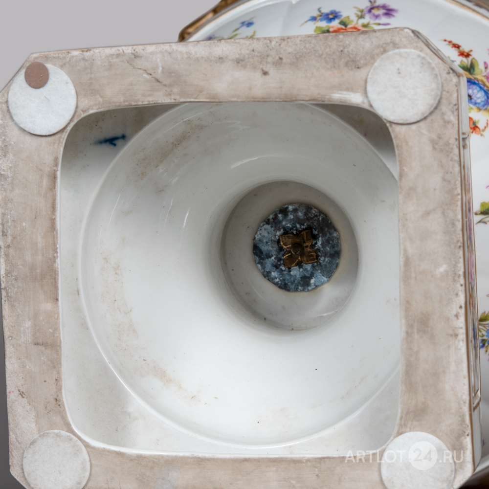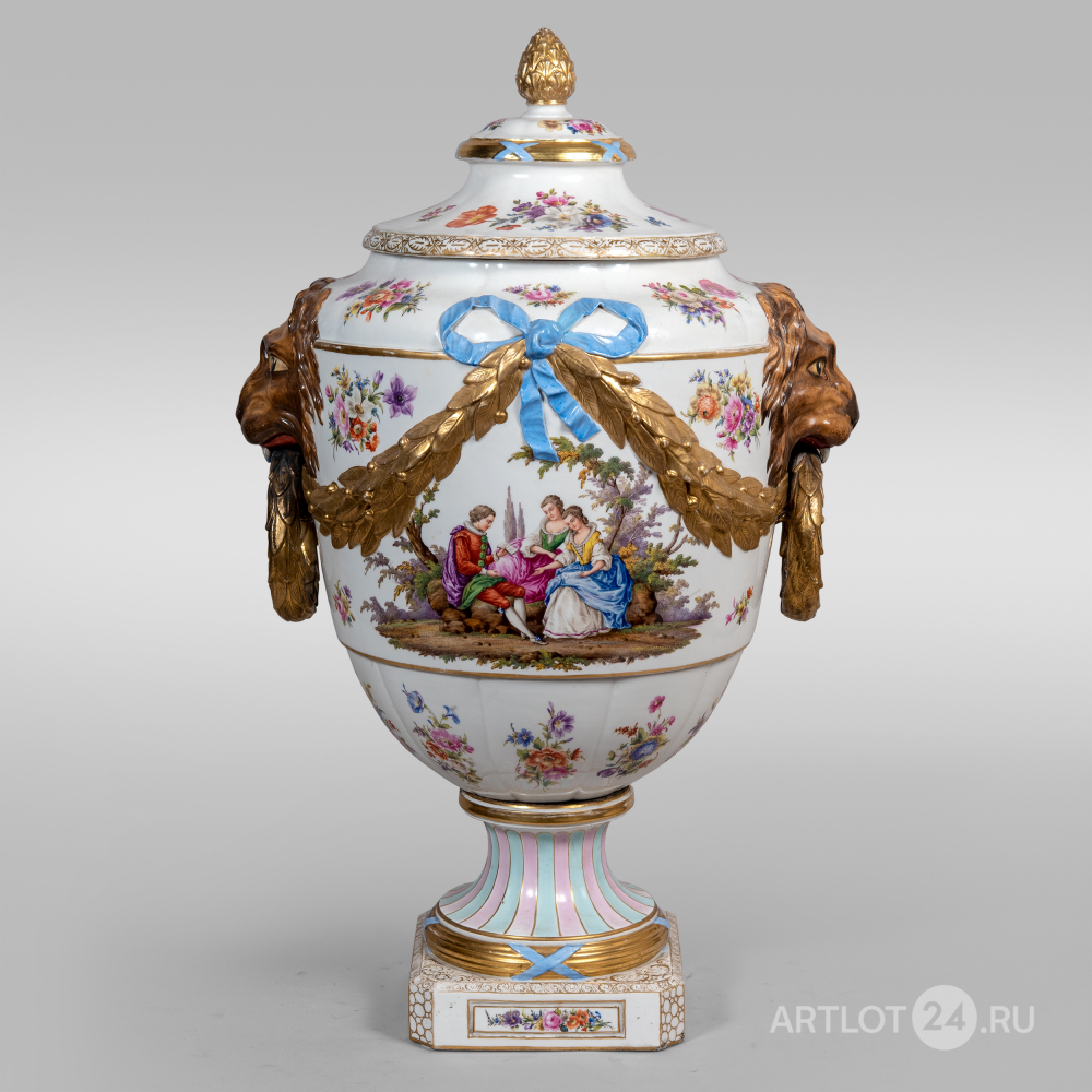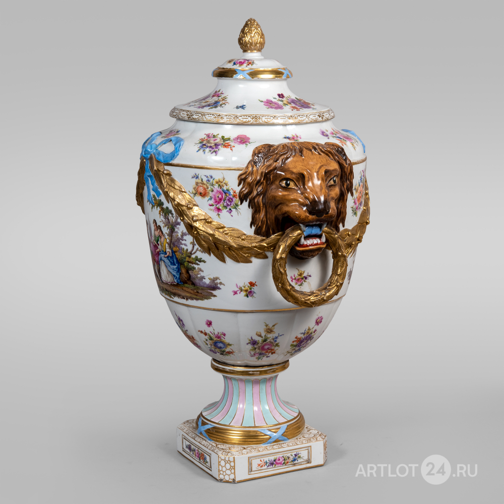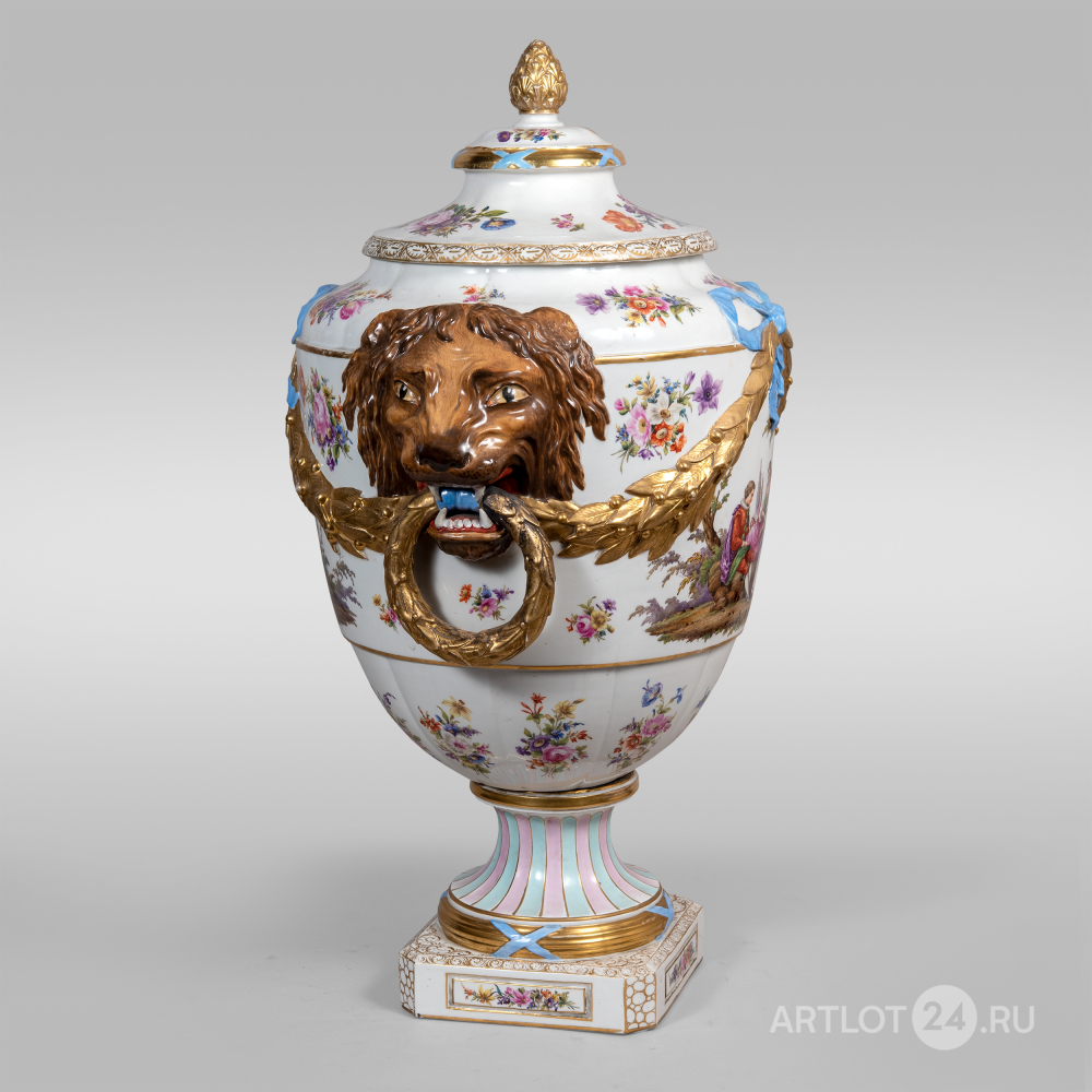 С декоративными гирляндами в виде лавровых ветвей. Фарфор, лепка, надглазурная полихромная роспись, золочение, цировка, ручки выполнены в виде львов-маскаронов, клеймо подглазурное кобальтом в виде «жезла» Королевской Берлинской мануфактуры (Konigliche Porzellan Manufaktur), Германия, конец XIX - первая четверть XX века, высота – 68 см
