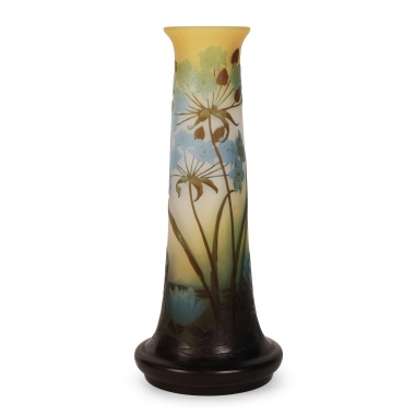 Двуцветное стекло, свободное выдувание, техника венецианской филиграни с использованием полосок крученой золотой нити; Италия, предположительно фирма «Salviati & C.», высота - 23 см, диаметр - 15 см.