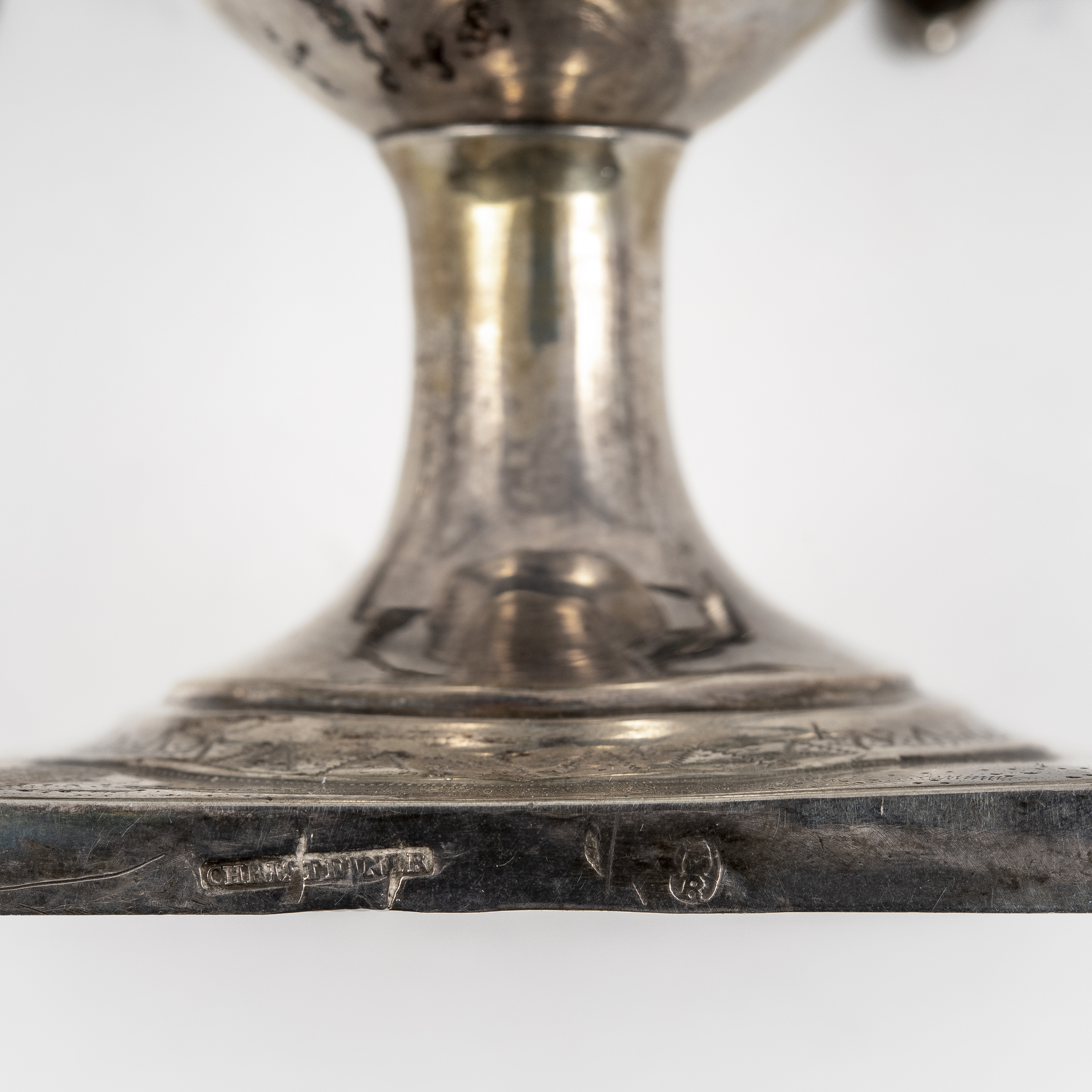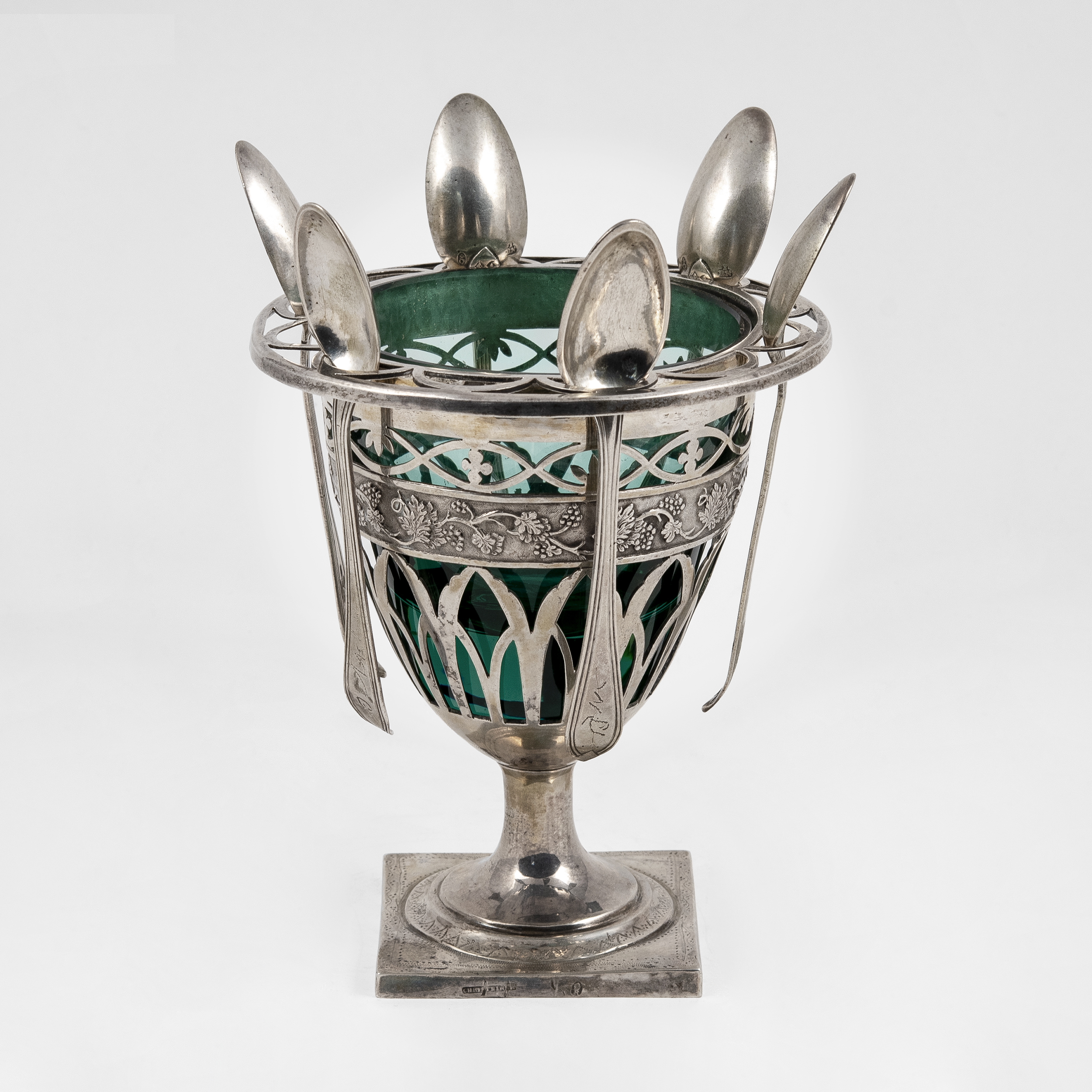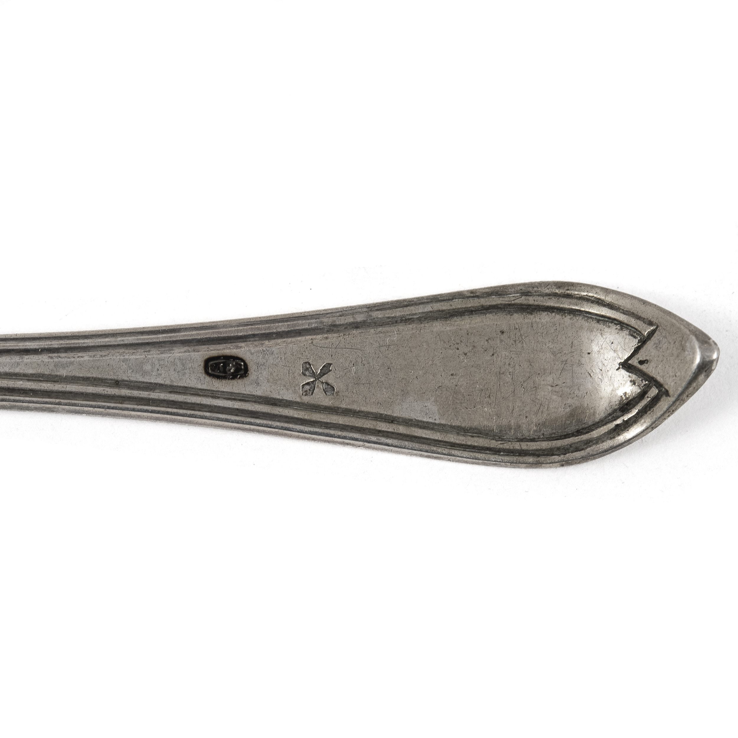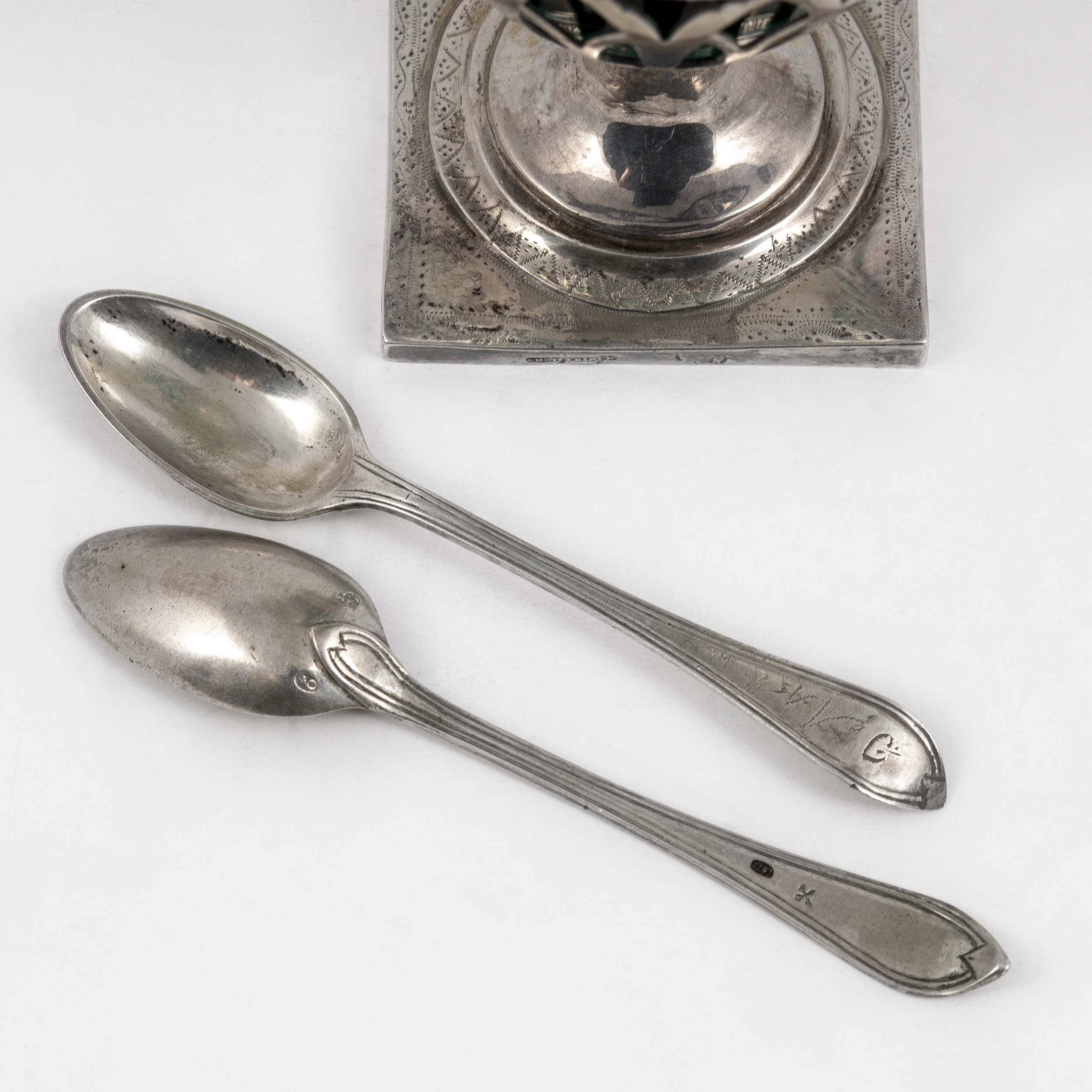 Клеймо мастера «CHRISTRINER» Иоганна Зигмунда Кристайнера (Christeiner Johann Sigmund, ок.1776 – 1831), годовое клеймо «R под шишкой» в фигурной щитке; клейма на ложках 800 (перепробир.), мастера гравера «IEN» - Иоганн Эсайас Ниггус (Johann Esaias Niggus, 1768-1815), «Q» под короной;