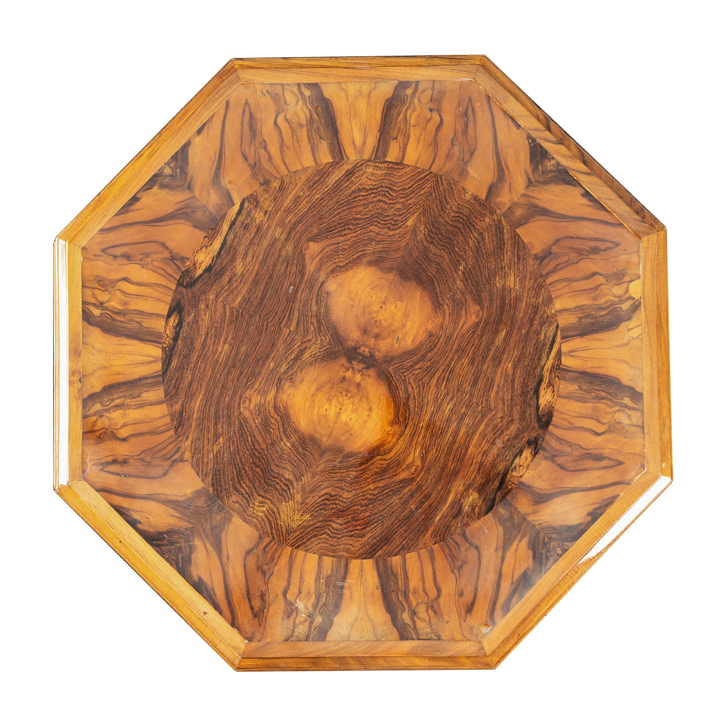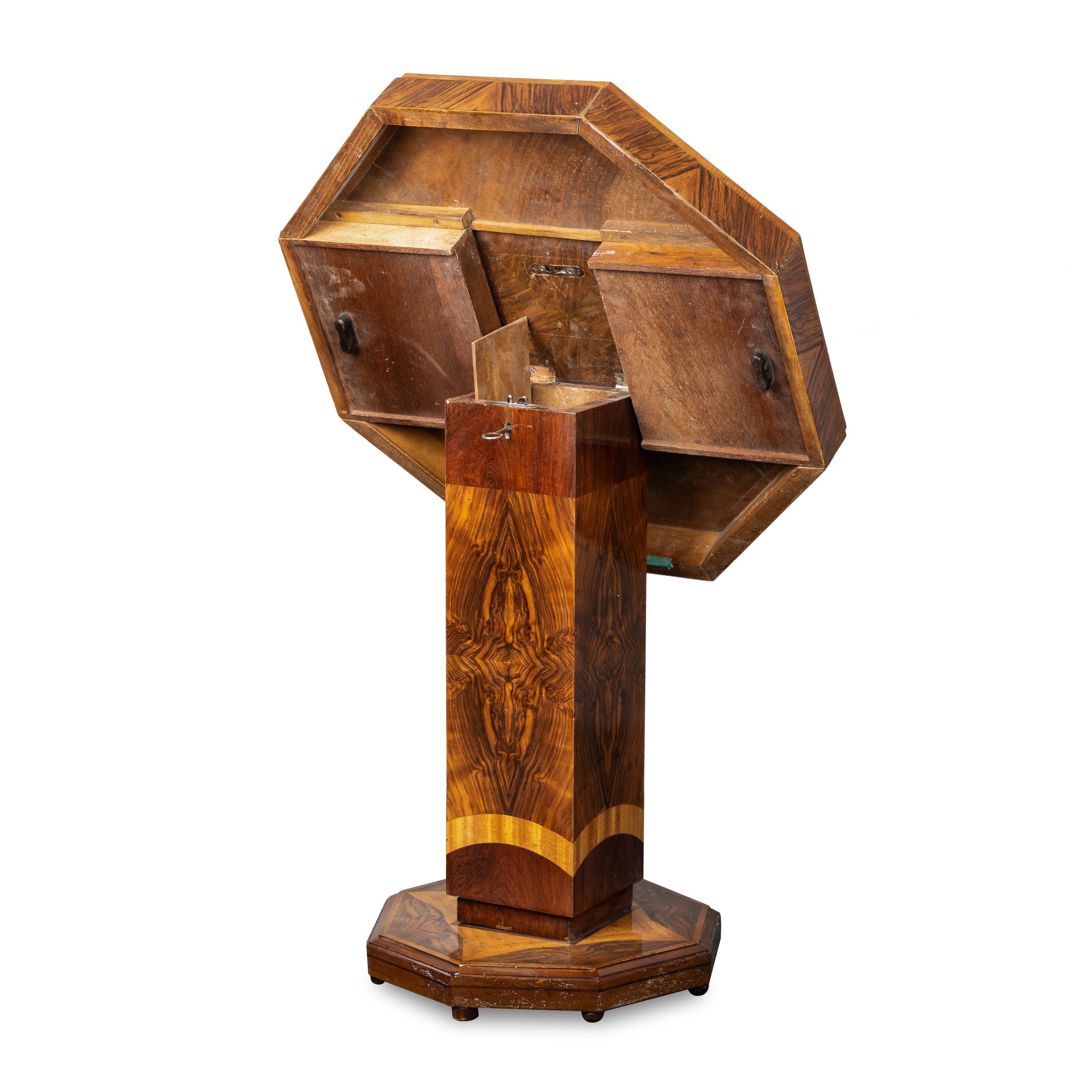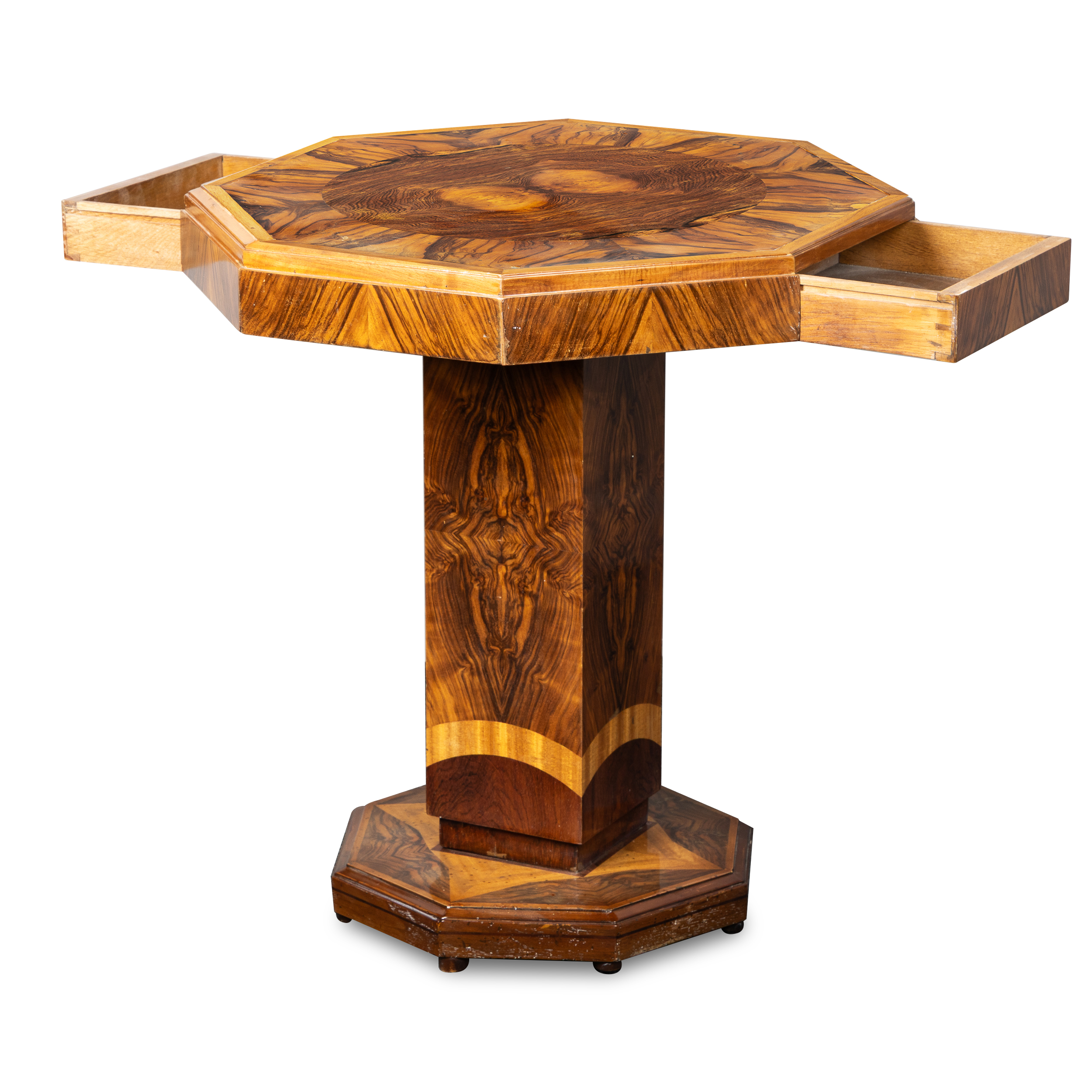 С двумя выдвижными ящиками. Волнистый орех (кап), возможно палисандр (в центре). Высота – 70 см, столешница – 65 х 65 см, основание – 40 х 40 см.