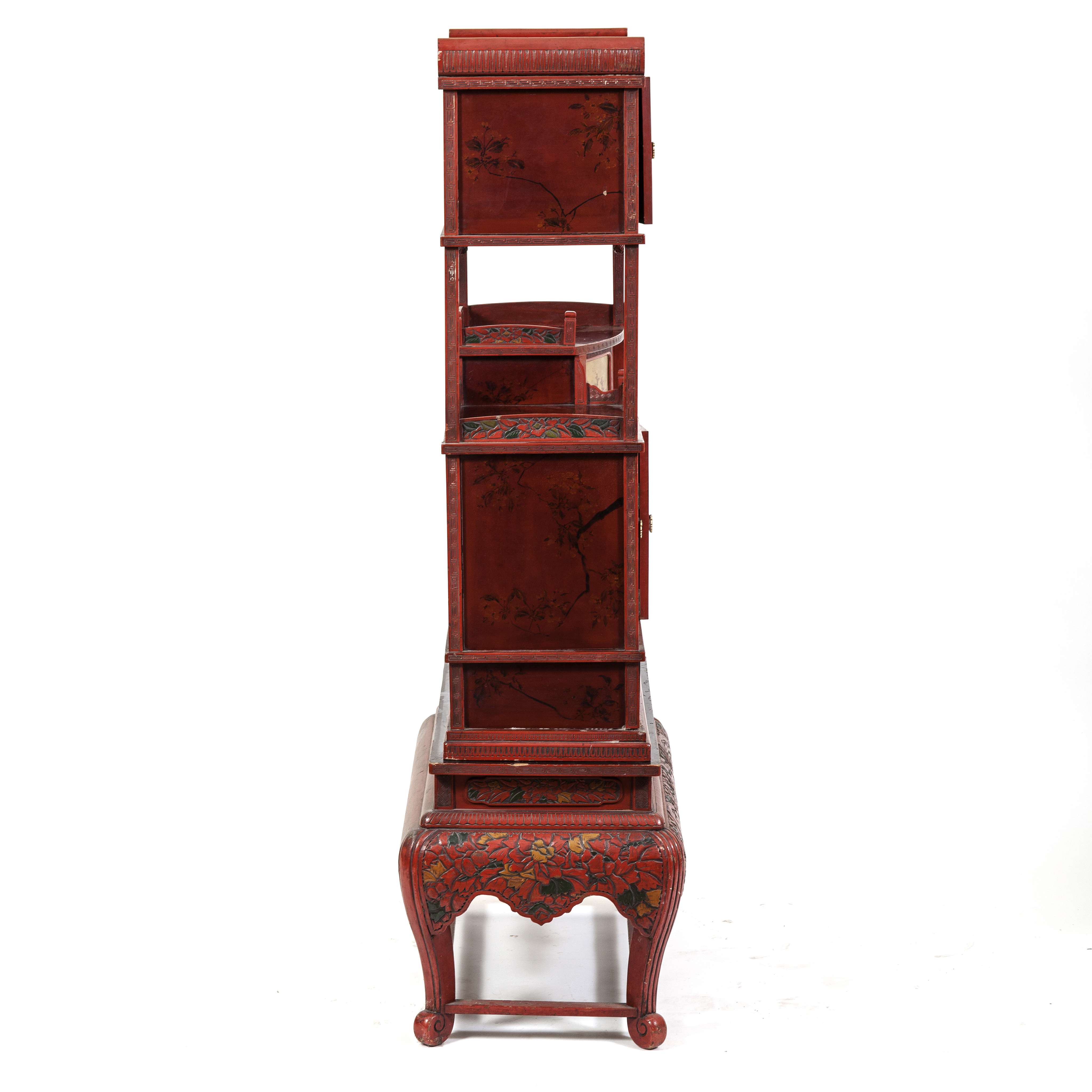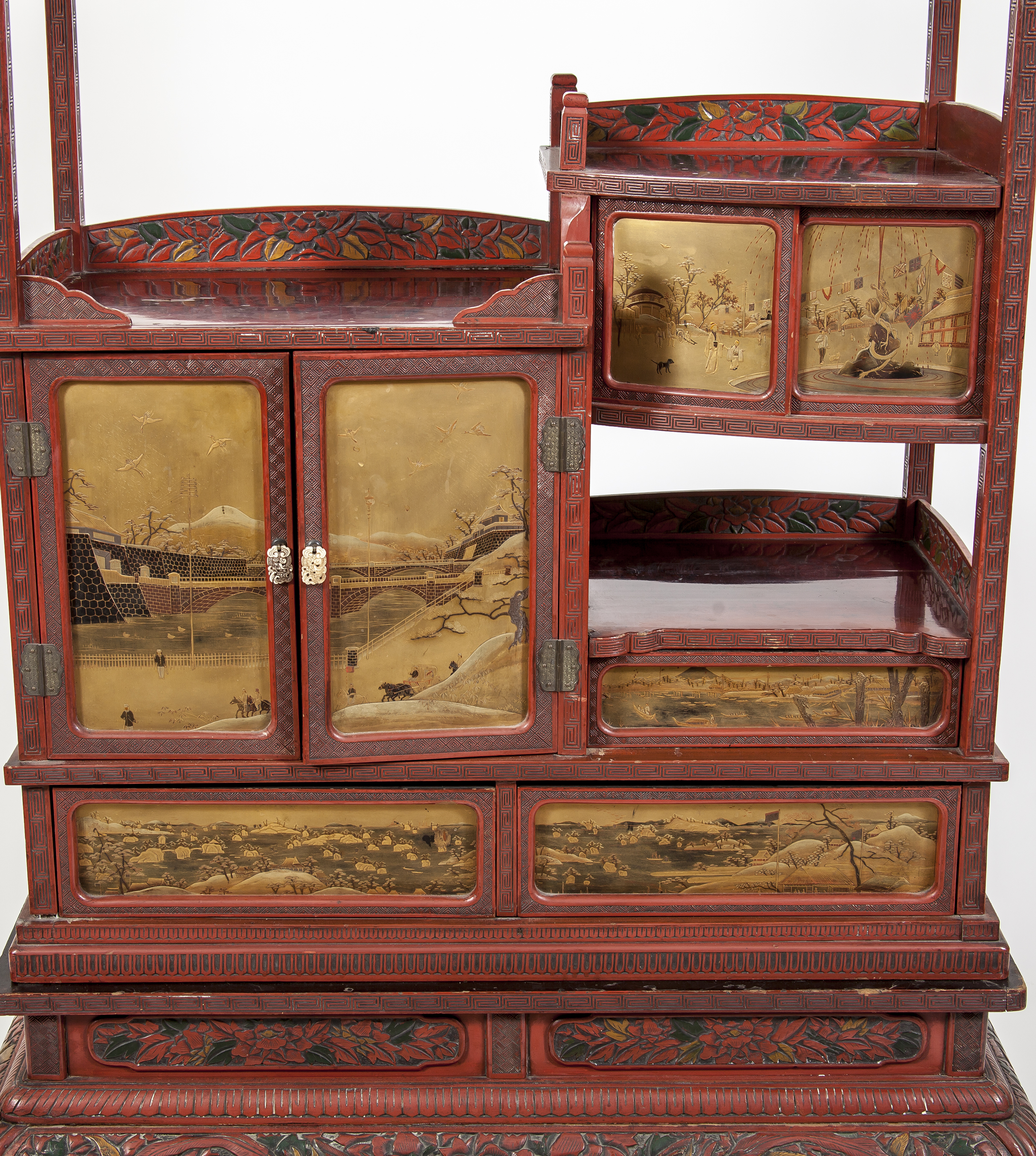 Предмет представляет собой многоярусную экспозиционную горку (shodana) — тип мебели, сложившийся в позднем Мэйдзи как адаптация традиционных японских открытых полок к формату закрытой мебельной единицы для демонстрации коллекционных предметов.