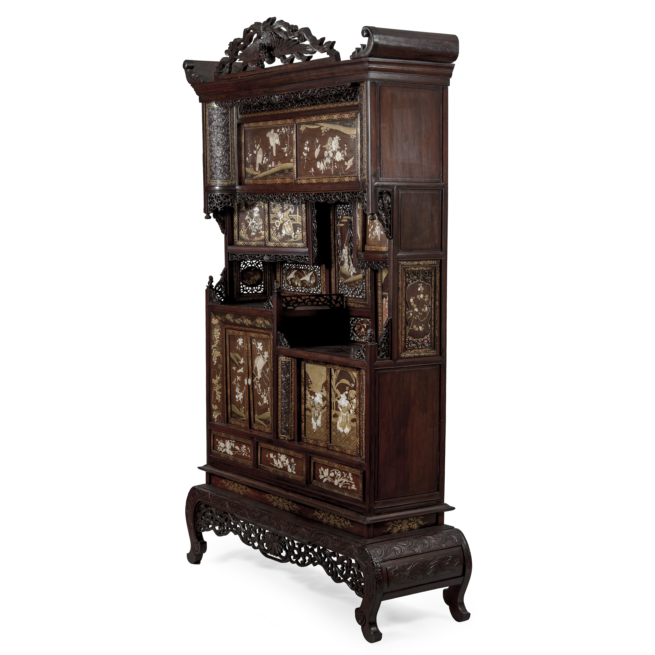 Японский кабинет эпохи Мэйдзи, созданный в 1880-1890-е годы, воплощает собой синтез высочайшего художественного мастерства и культурного диалога между Востоком и Западом. Этот период в истории Японии, ознаменованный открытостью миру, породил особый класс предметов роскоши, предназначавшихся как для внутреннего рынка, так и для взыскательной западной клиентуры. Кабинет выполнен из массива тропических пород дерева, глубокая и благородная текстура служит идеальной основой для сложнейшего декора. Его монументальная форма, несущая в себе влияние европейской мебельной традиции, полностью подчинена эстетике японского искусства.