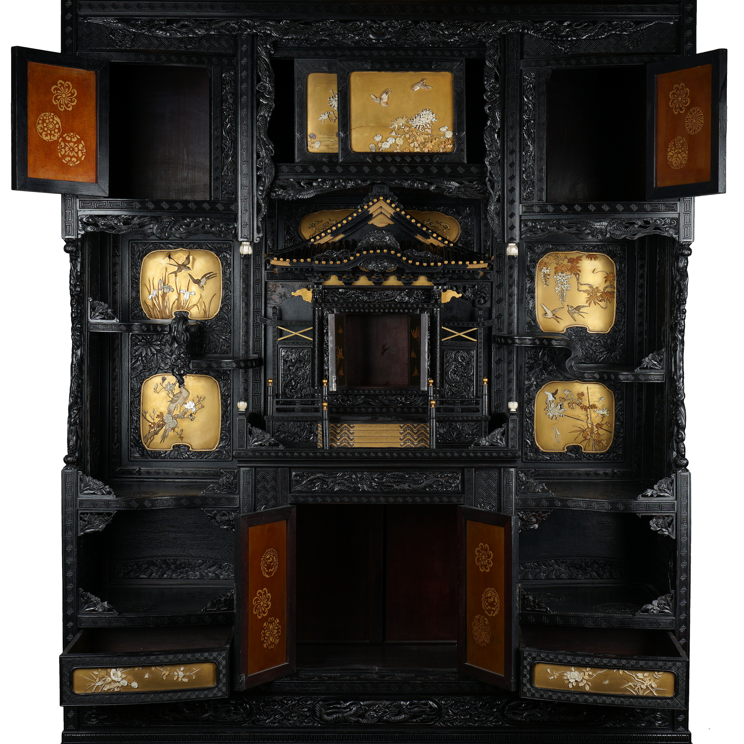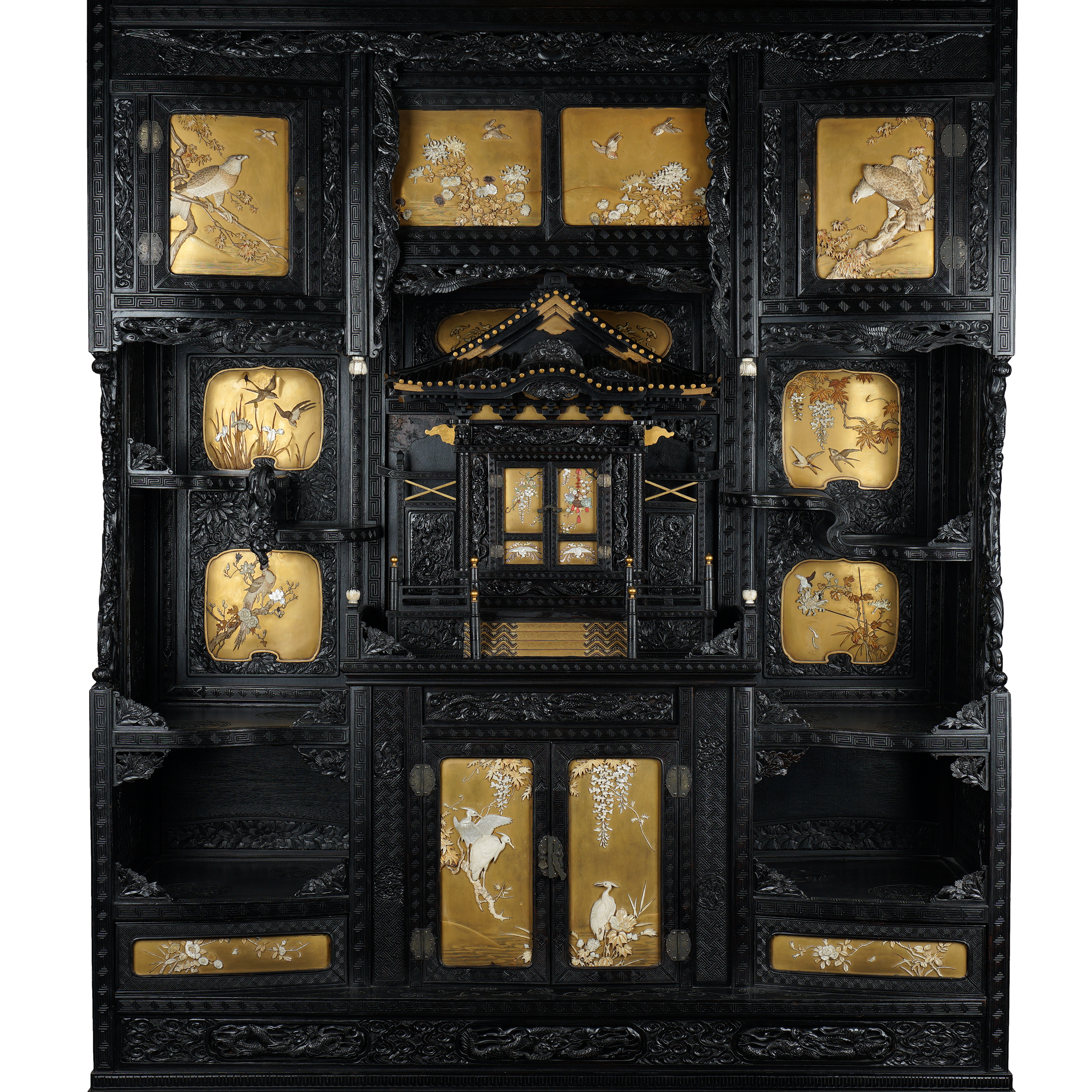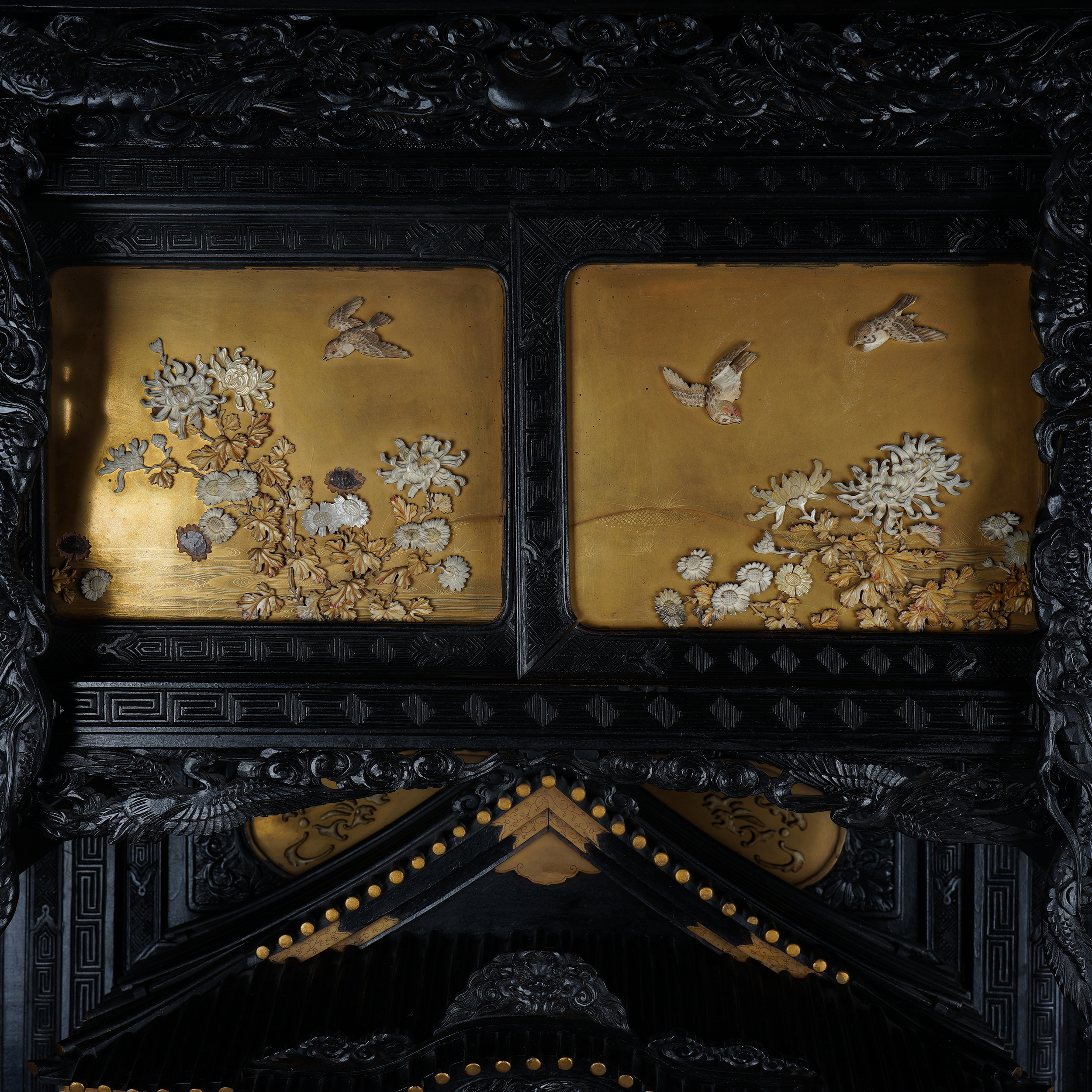 Япония, эпоха Мэйдзи (1868-1912). Дерево, резьба, золотой и цветной лак, инкрустация слоновой костью перламутром в традиционной японской технике сибаяма. Размеры по основанию: 244 х 143 х 56 см; размеры основной части: 244 х 126 х 41 см.